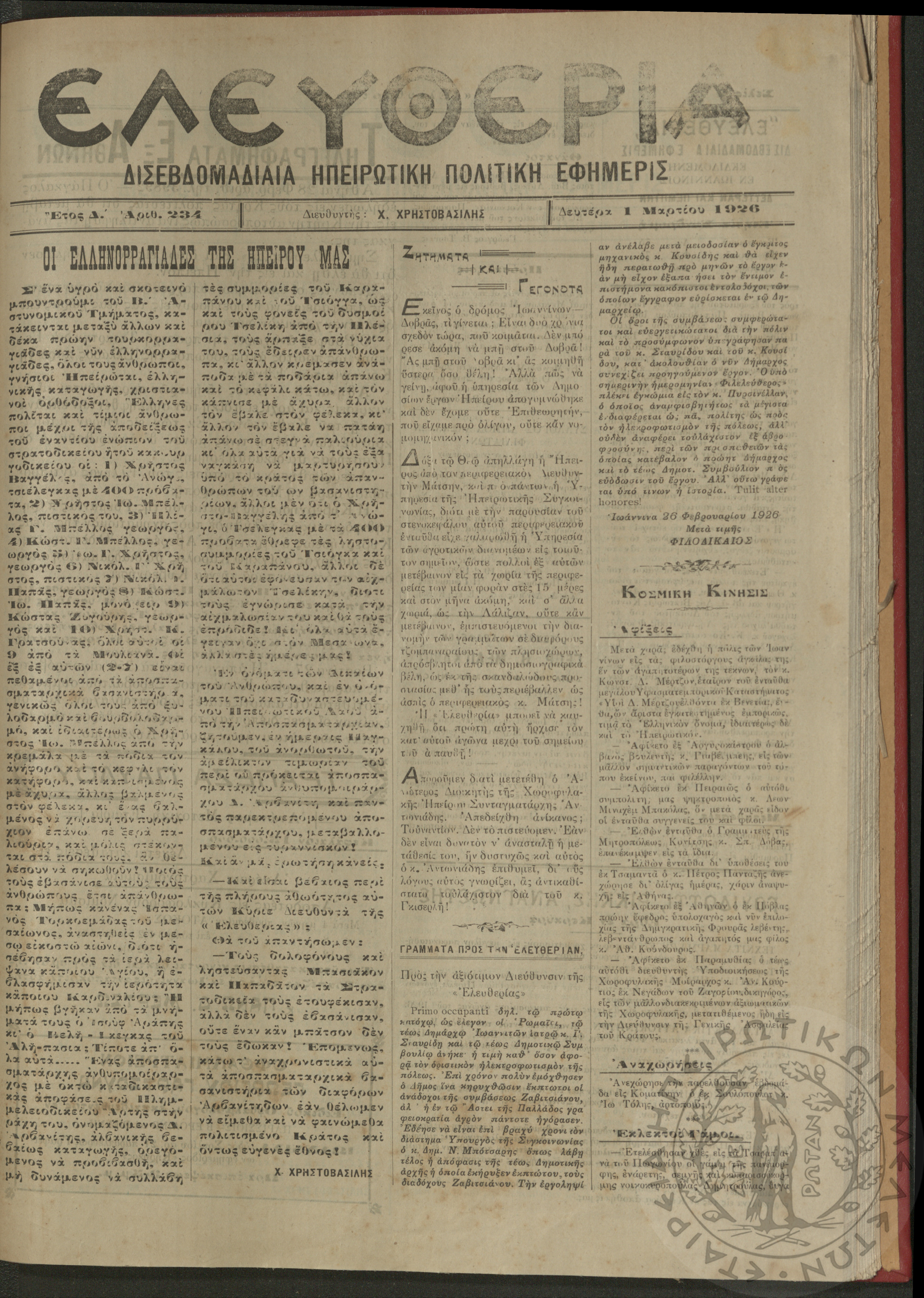 Ελευθερία: δισεβδομαδιαία Ηπειρωτική πολιτική εφημερίς, 1926, φ. 234