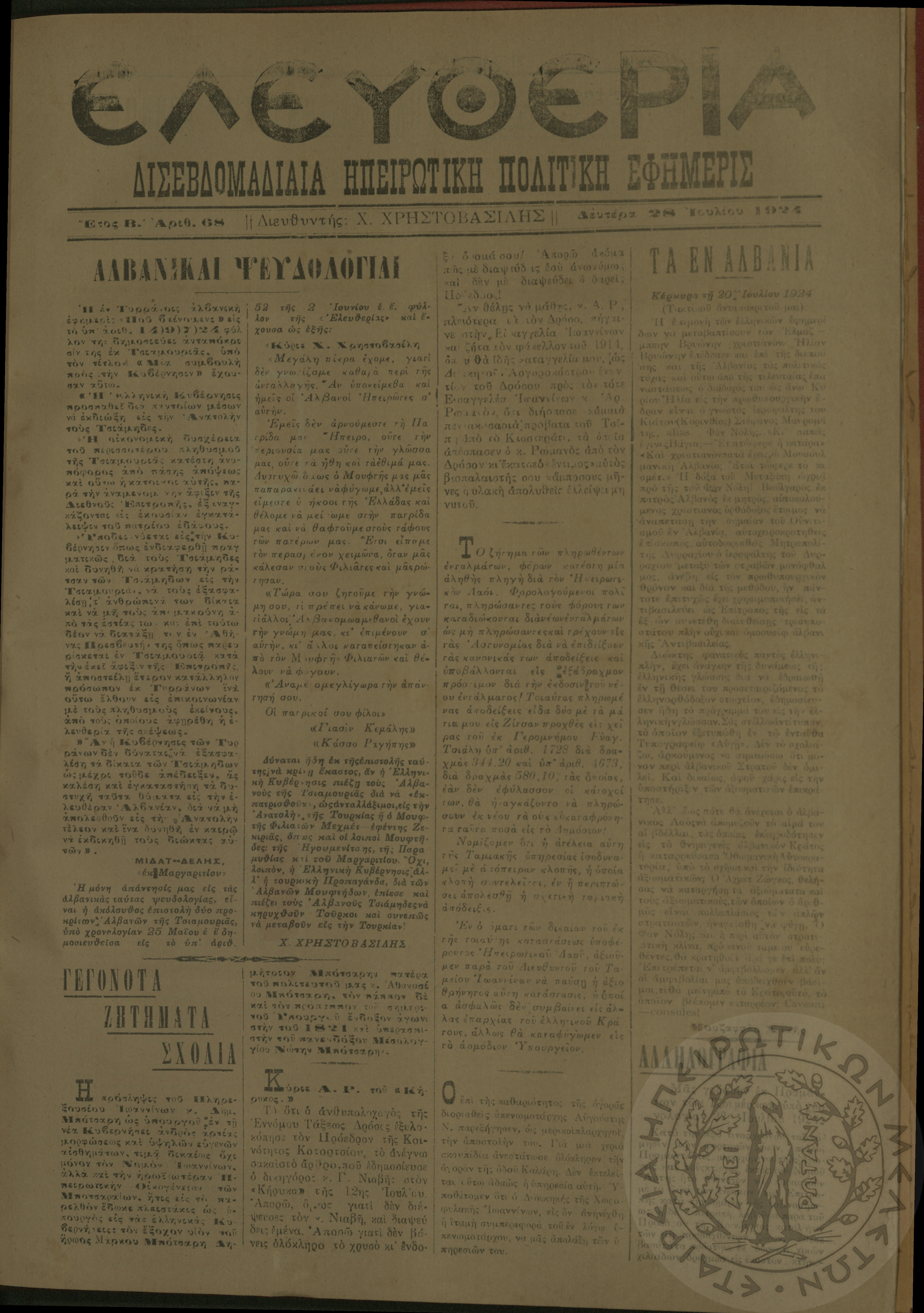 Ελευθερία: δισεβδομαδιαία Ηπειρωτική πολιτική εφημερίς, 1924, φ. 68
