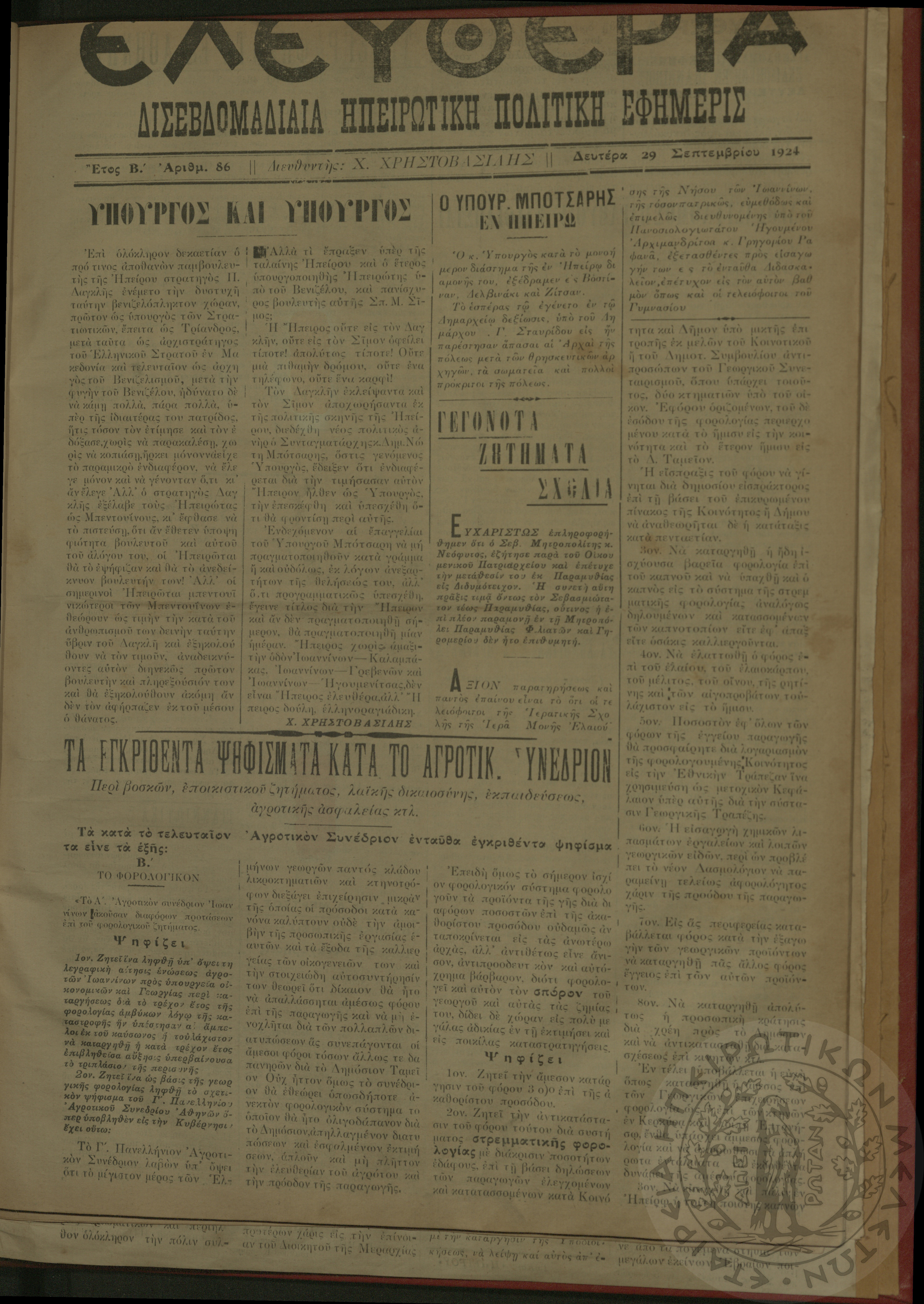 Ελευθερία: δισεβδομαδιαία Ηπειρωτική πολιτική εφημερίς, 1924, φ. 86