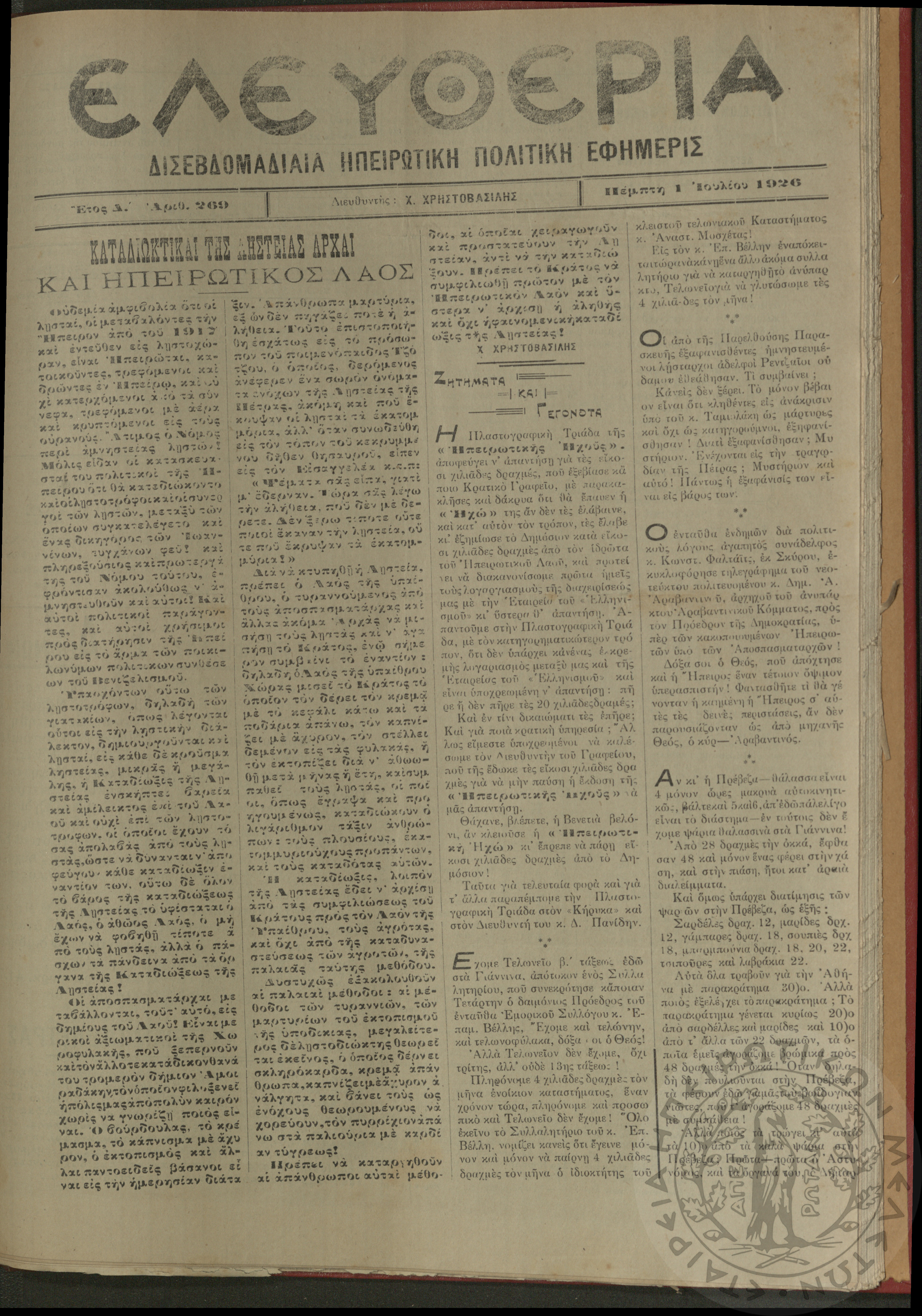 Ελευθερία: δισεβδομαδιαία Ηπειρωτική πολιτική εφημερίς, 1926, φ. 269