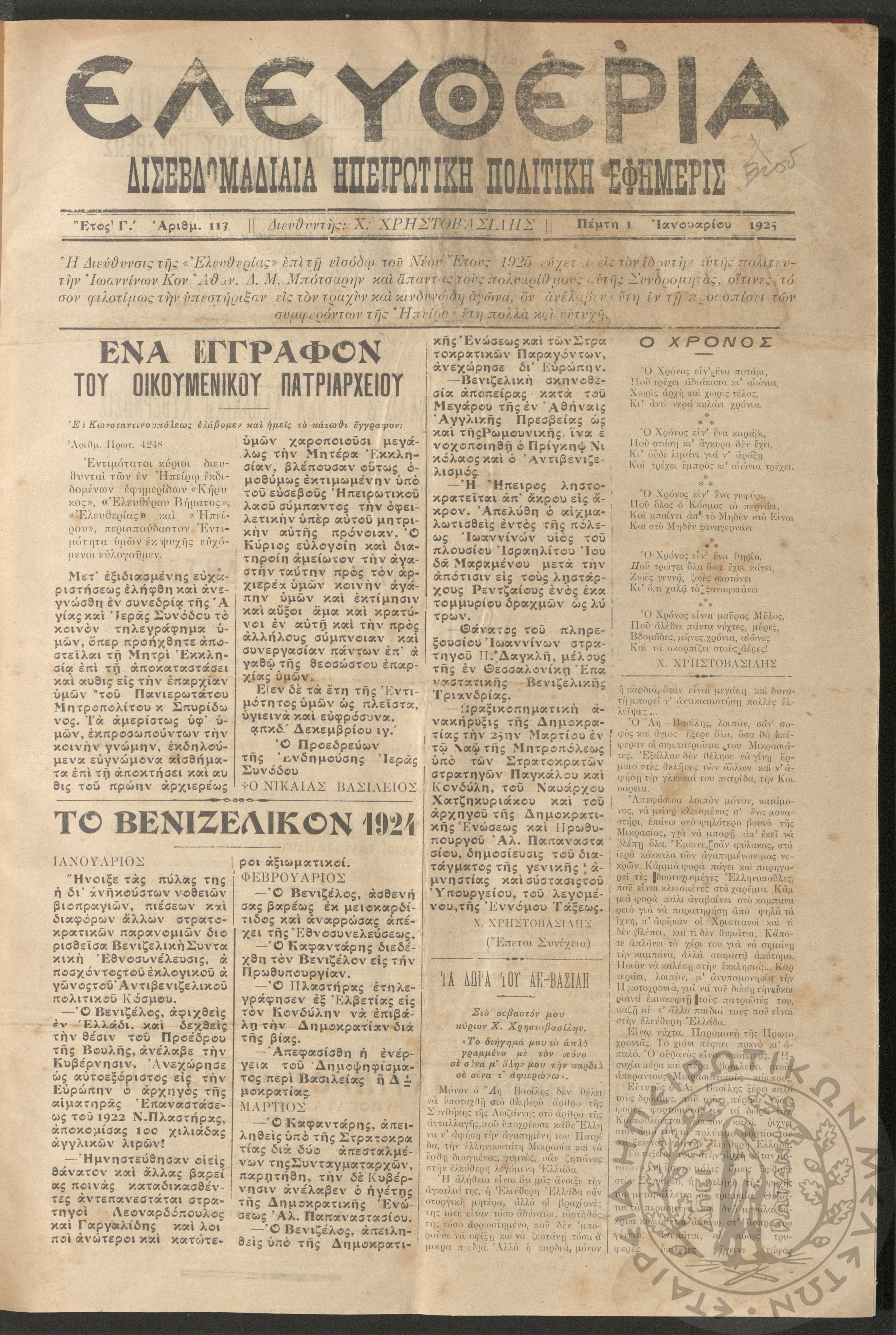 Ελευθερία: δισεβδομαδιαία Ηπειρωτική πολιτική εφημερίς, 1925, φ. 113