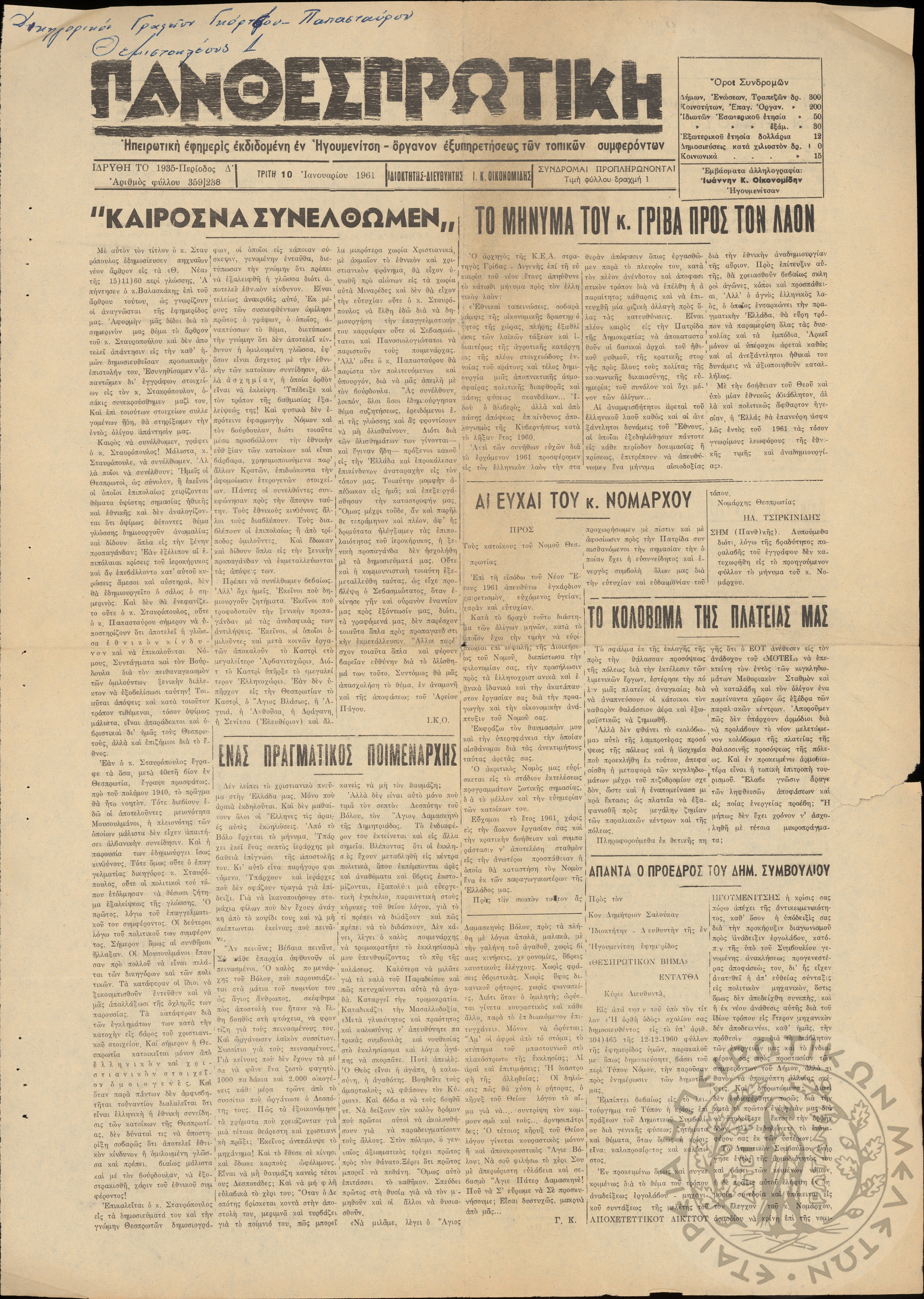 Πανθεσπρωτική: Ηπειρωτική εφημερίς εκδιδομένη εν Ηγουμενίτση - Όργανον εξυπηρετήσεως τοπικών συμφερόντων, 1961, φ. 359/238Περίοδος Δ΄, φ. 359/238...