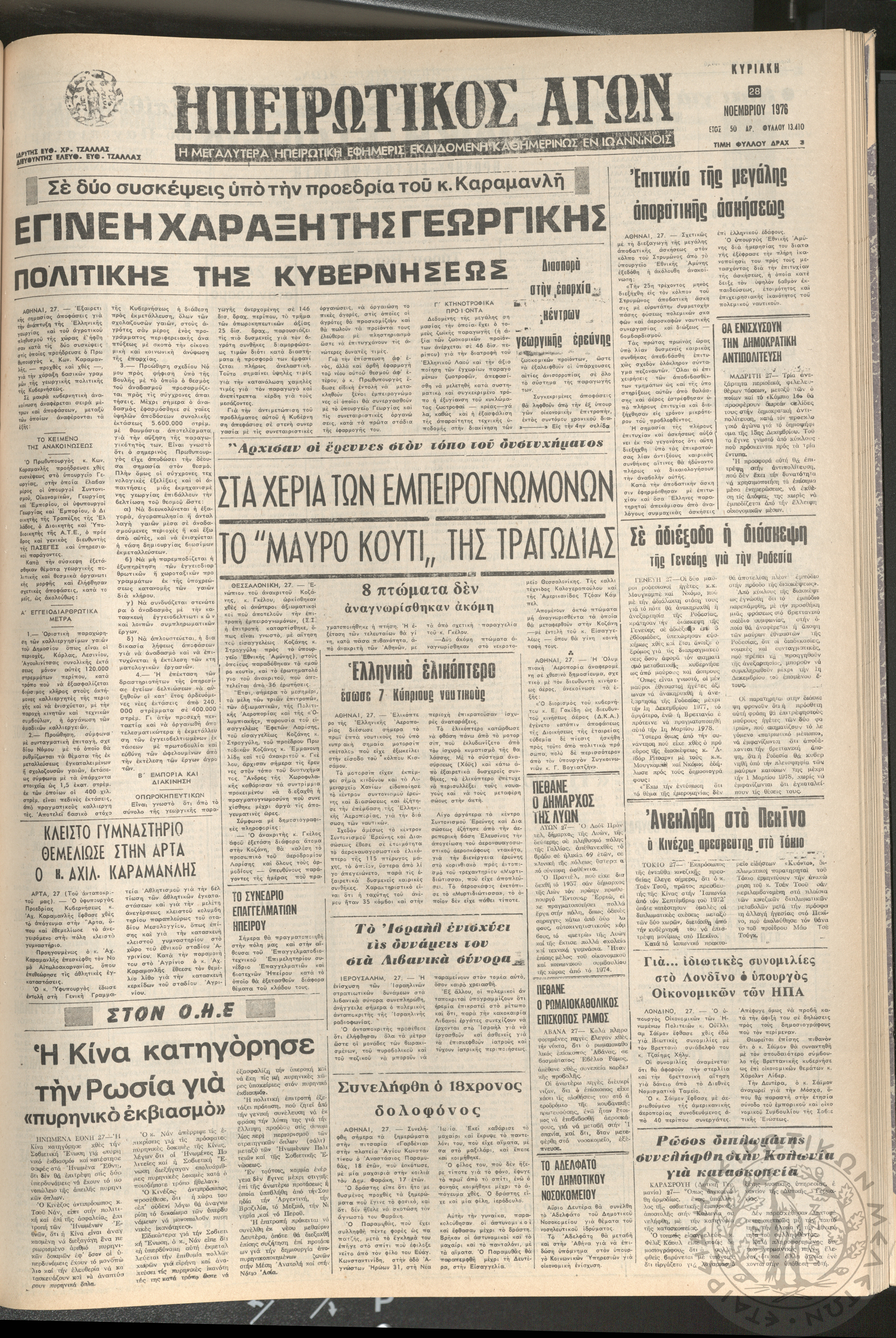 Ηπειρωτικός Αγών : η μεγαλυτέρα ηπειρωτική εφημερίς εκδιδόμενη καθημερινώς εν Ιωαννίνοις 1976 (φ. 13396)Έτος 50, Φ. 13396...