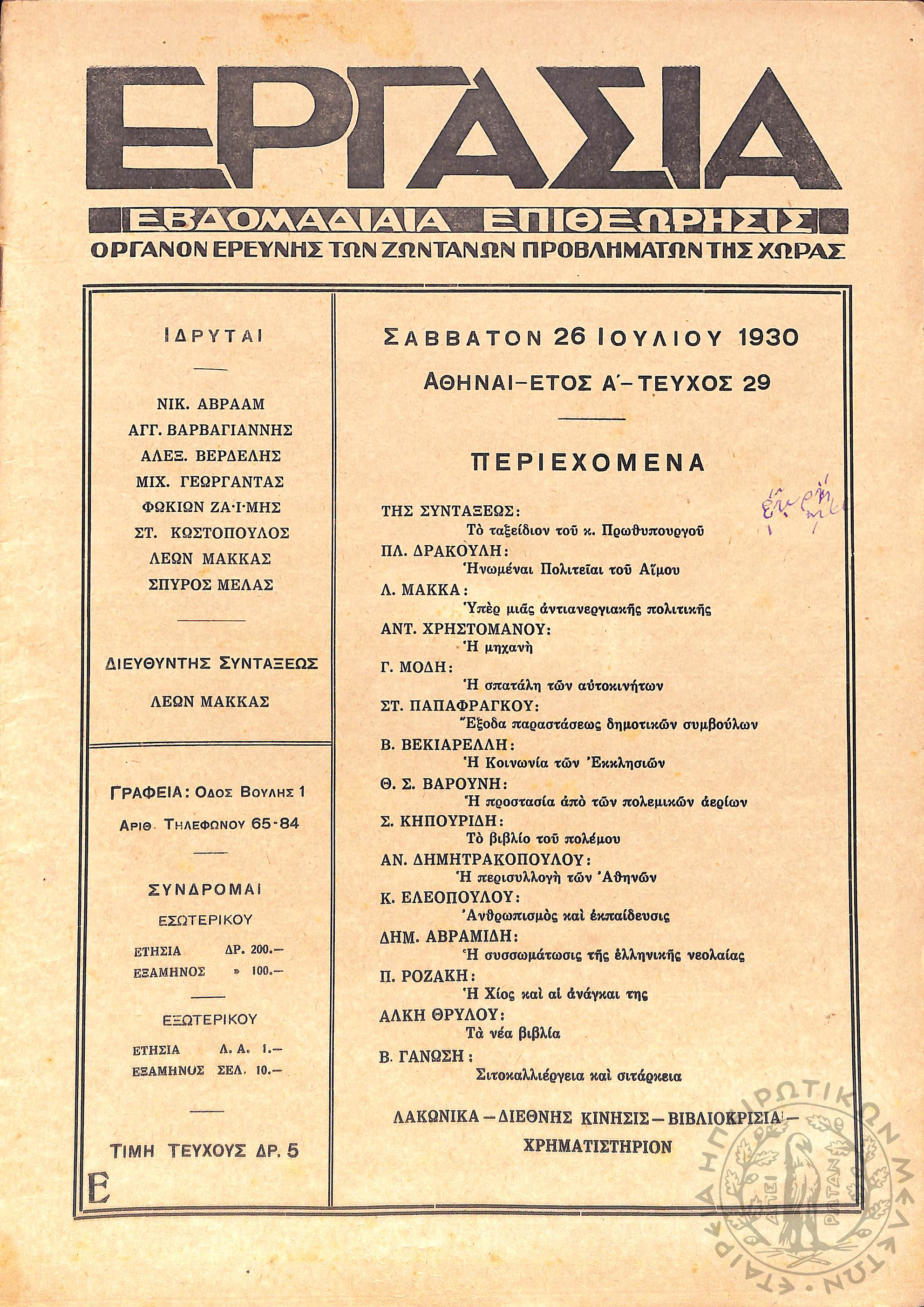 Εργασία: εβδομαδιαία επιθεώρησις όργανον ερεύνης των ζωντανών προβλημάτων της χώρας (τεύχ. 29)Έτος Α΄, τεύχ. 29...