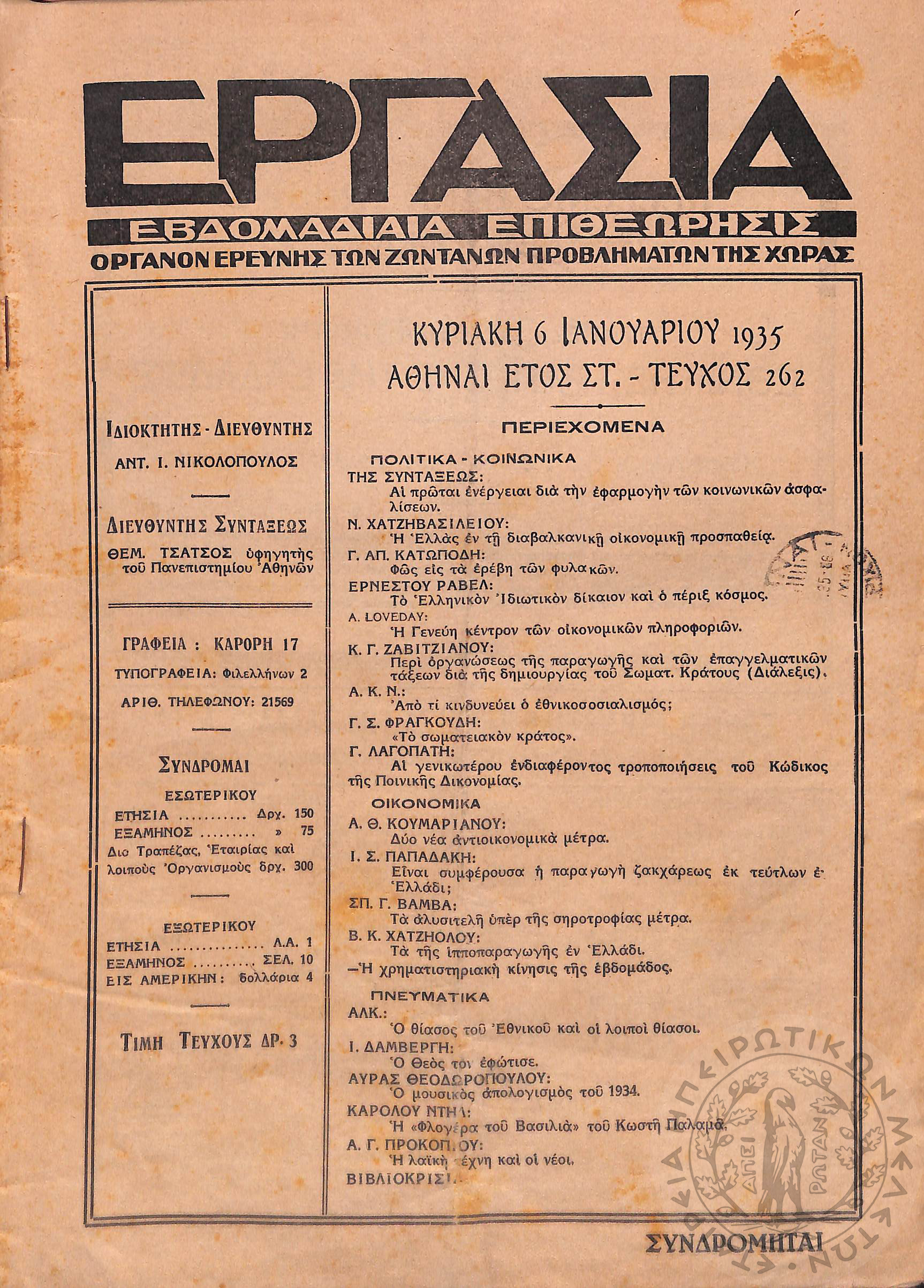 Εργασία: εβδομαδιαία επιθεώρησις όργανον ερεύνης των ζωντανών προβλημάτων της χώρας (τεύχ. 262)Έτος ΣΤ΄, τεύχ. 262...