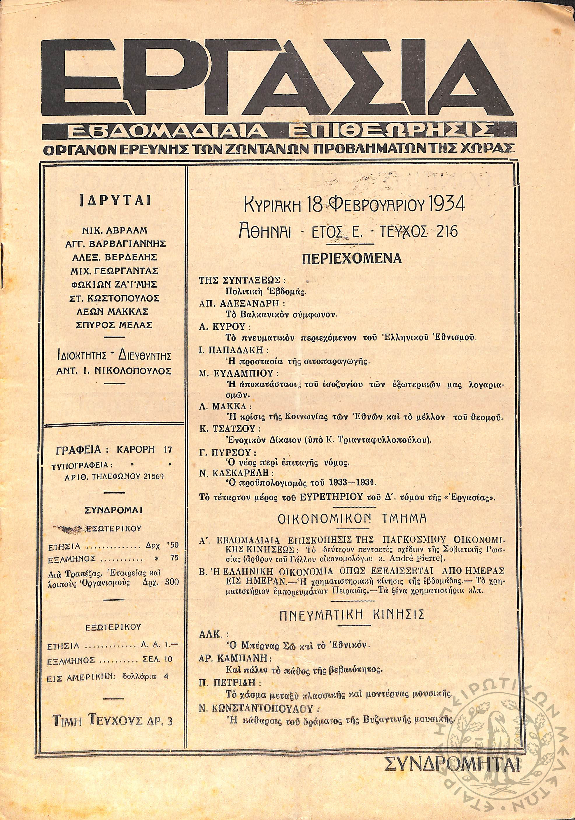 Εργασία: εβδομαδιαία επιθεώρησις όργανον ερεύνης των ζωντανών προβλημάτων της χώρας (τεύχ. 216)Έτος Ε΄, τεύχ. 216...