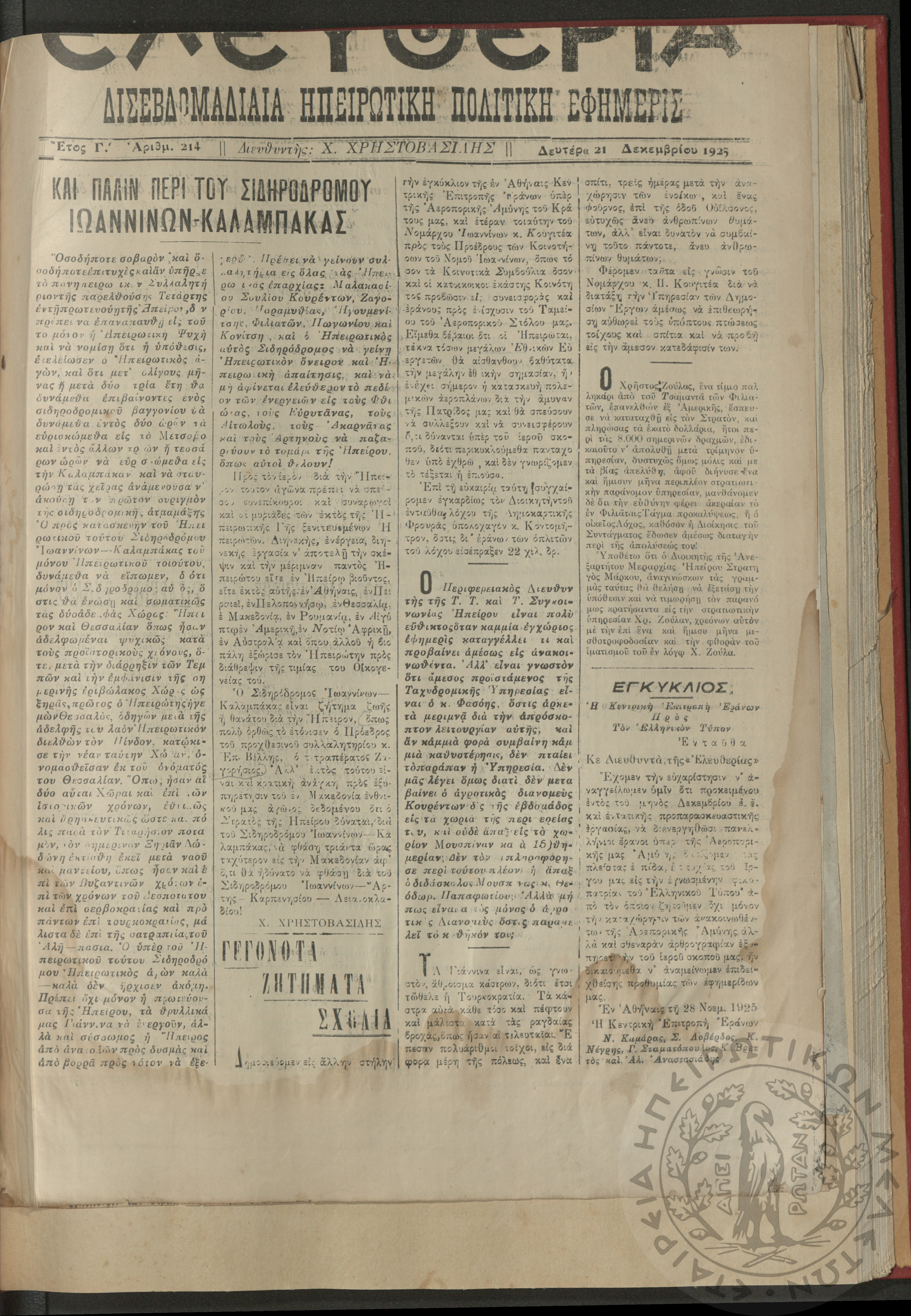 Ελευθερία: δισεβδομαδιαία Ηπειρωτική πολιτική εφημερίς, 1925, φ. 214