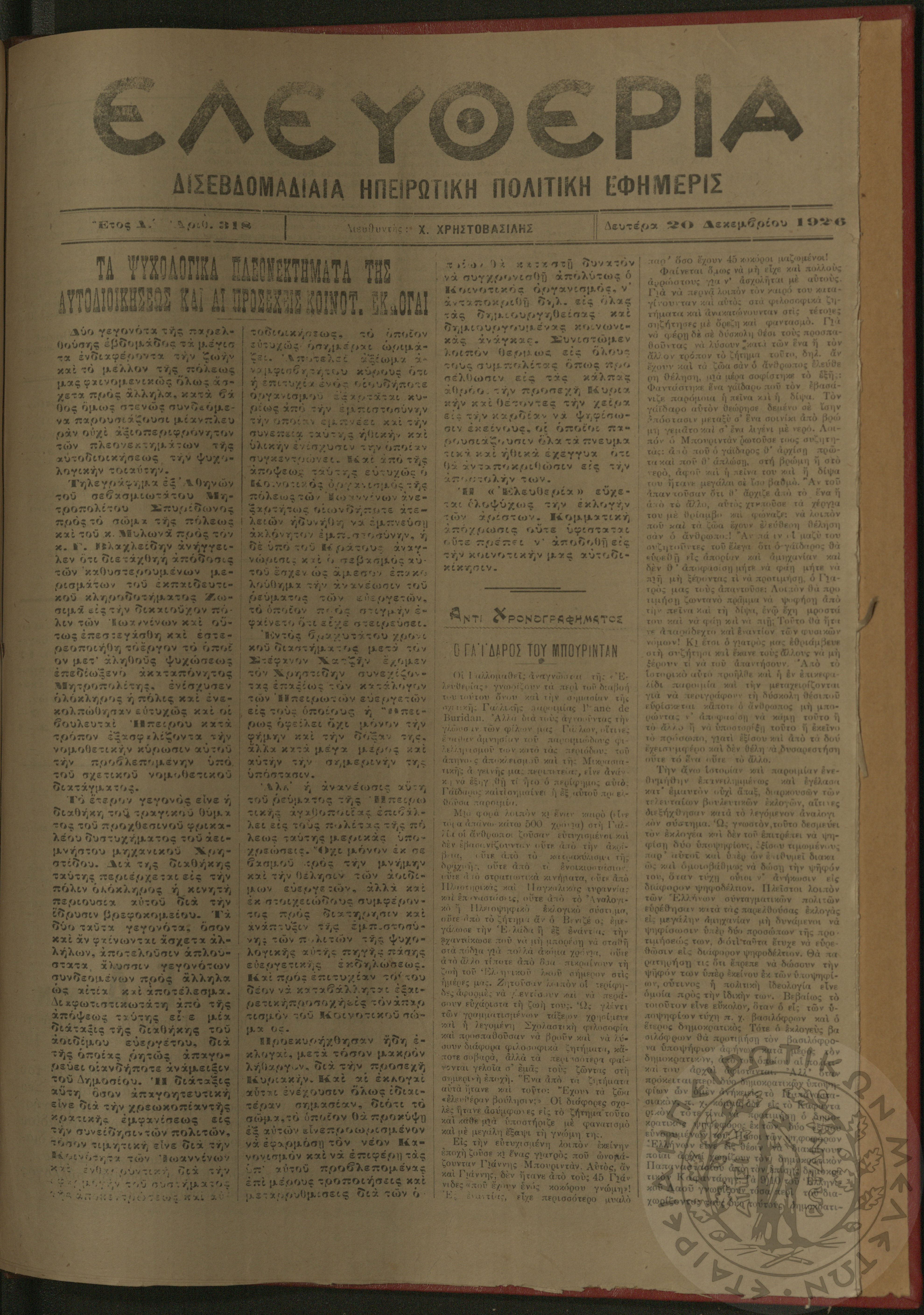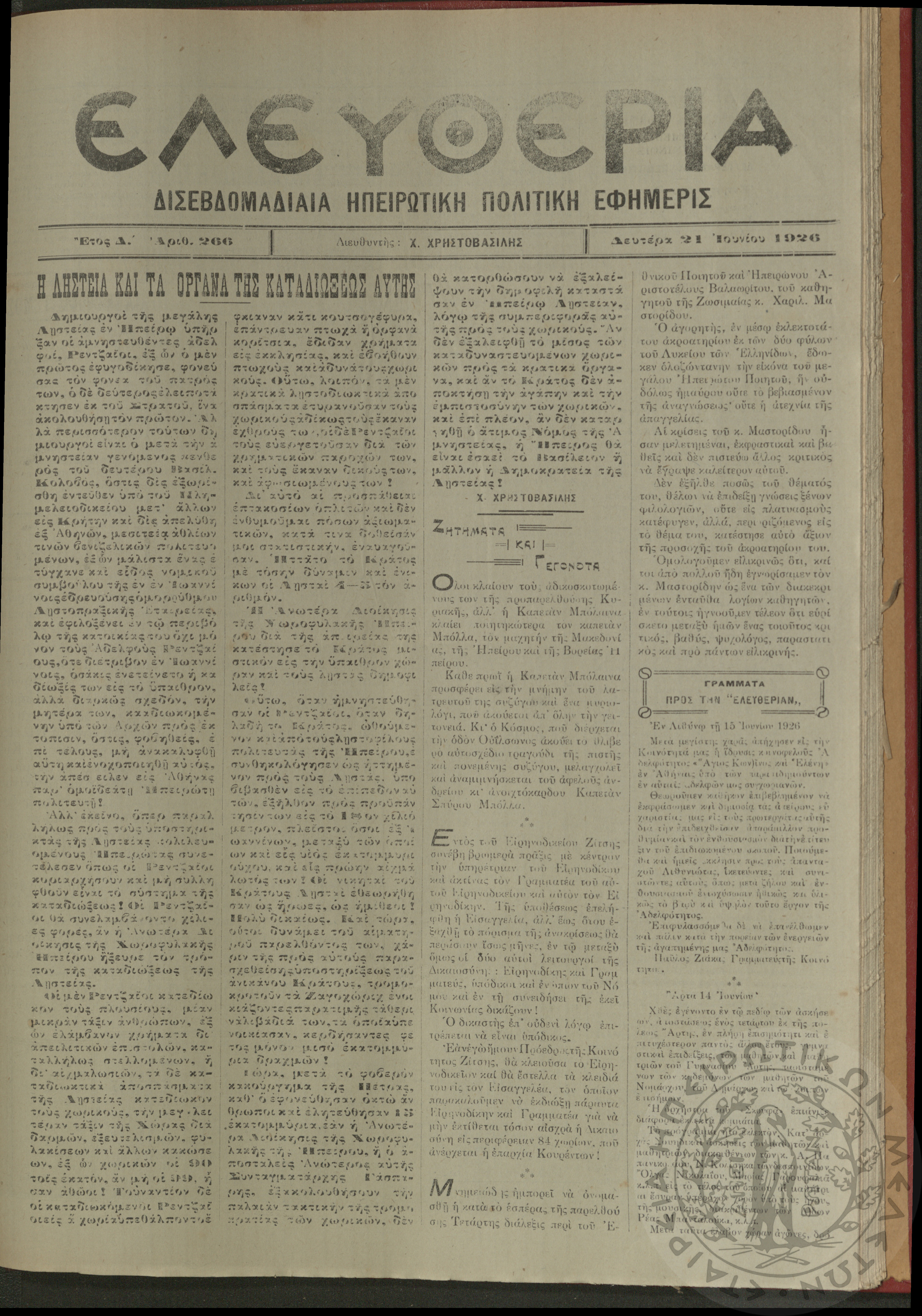 Ελευθερία: δισεβδομαδιαία Ηπειρωτική πολιτική εφημερίς, 1926, φ. 266