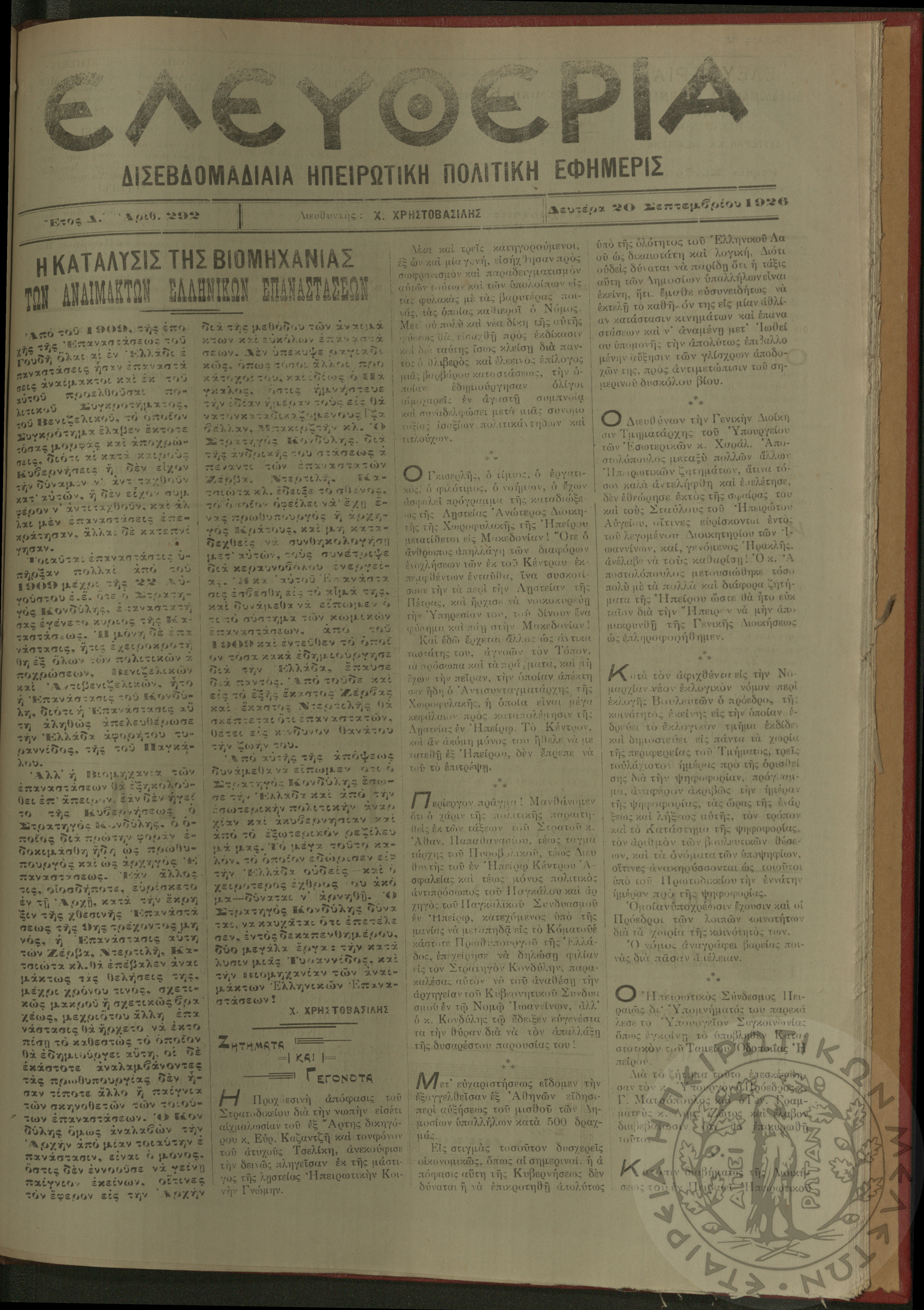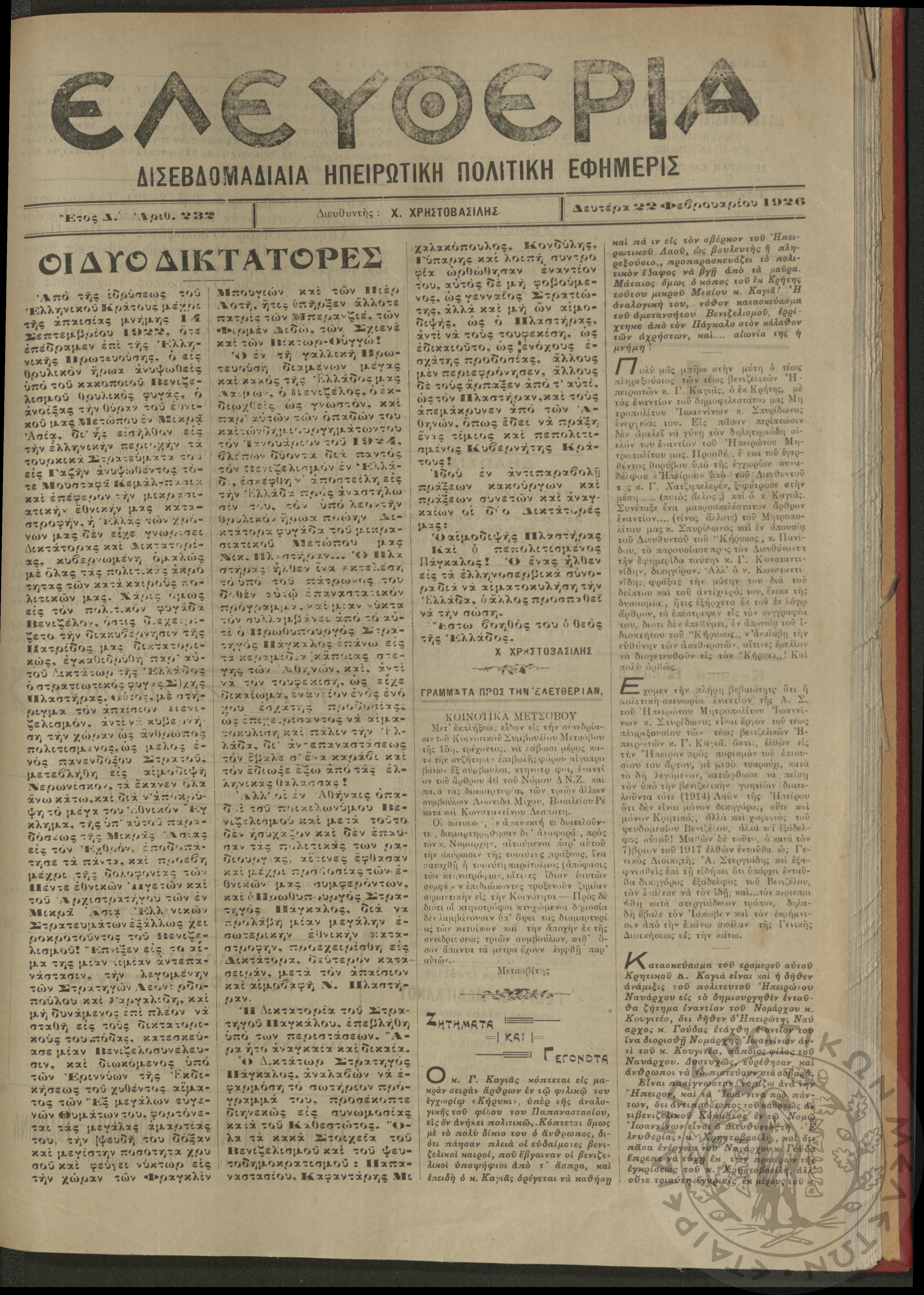 Ελευθερία: δισεβδομαδιαία Ηπειρωτική πολιτική εφημερίς, 1926, φ. 232