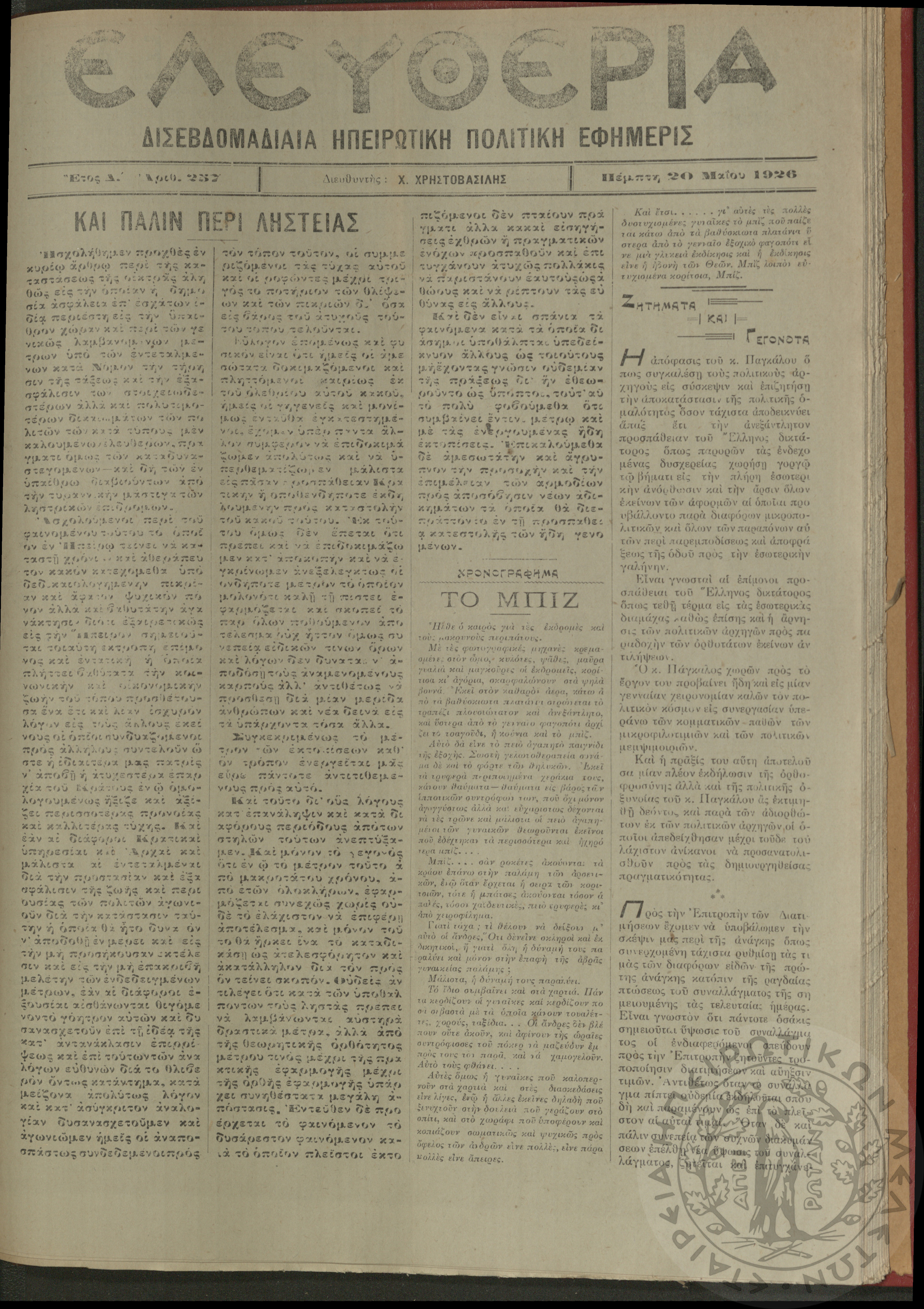 Ελευθερία: δισεβδομαδιαία Ηπειρωτική πολιτική εφημερίς, 1926, φ. 257