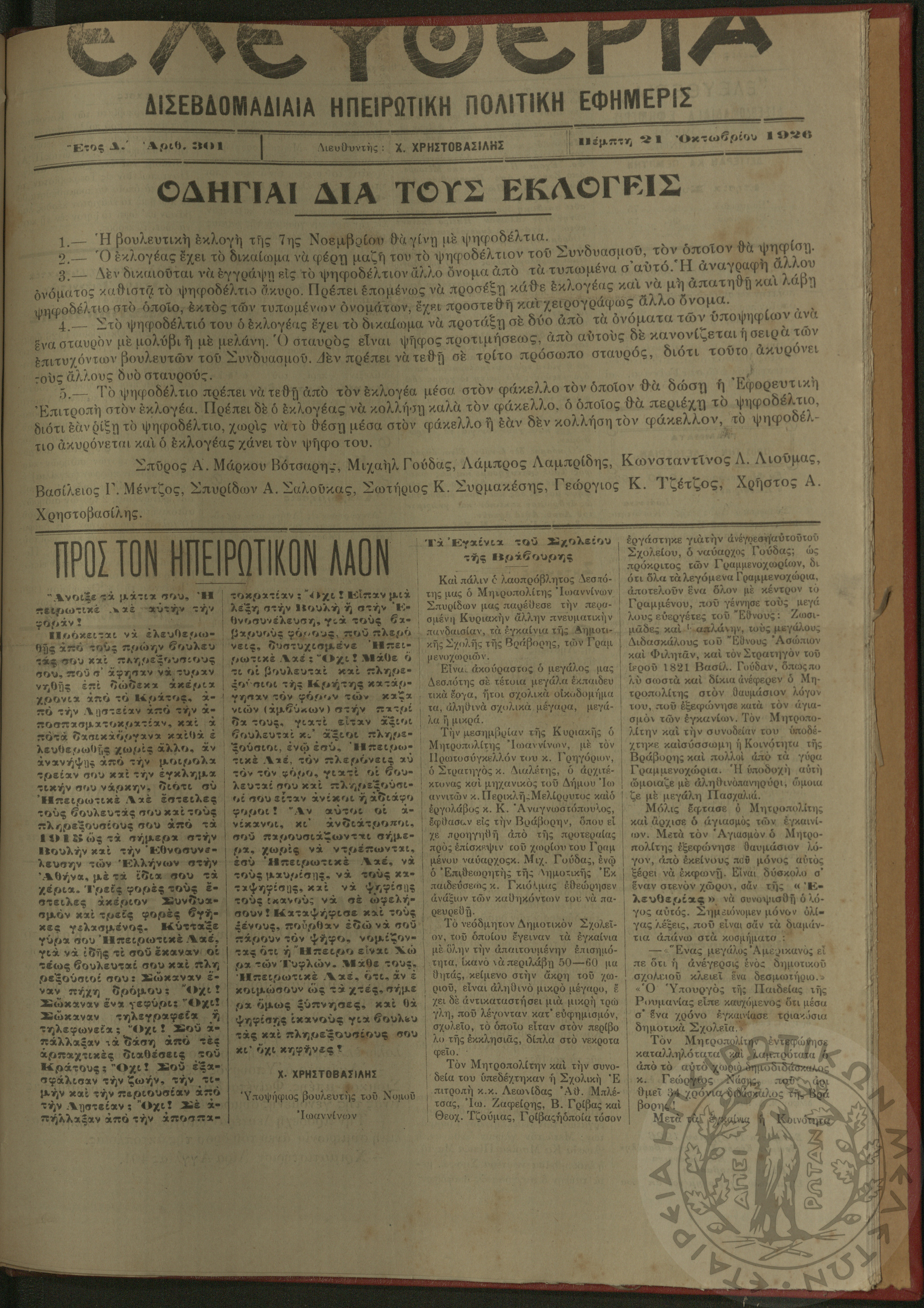 Ελευθερία: δισεβδομαδιαία Ηπειρωτική πολιτική εφημερίς, 1926, φ. 301
