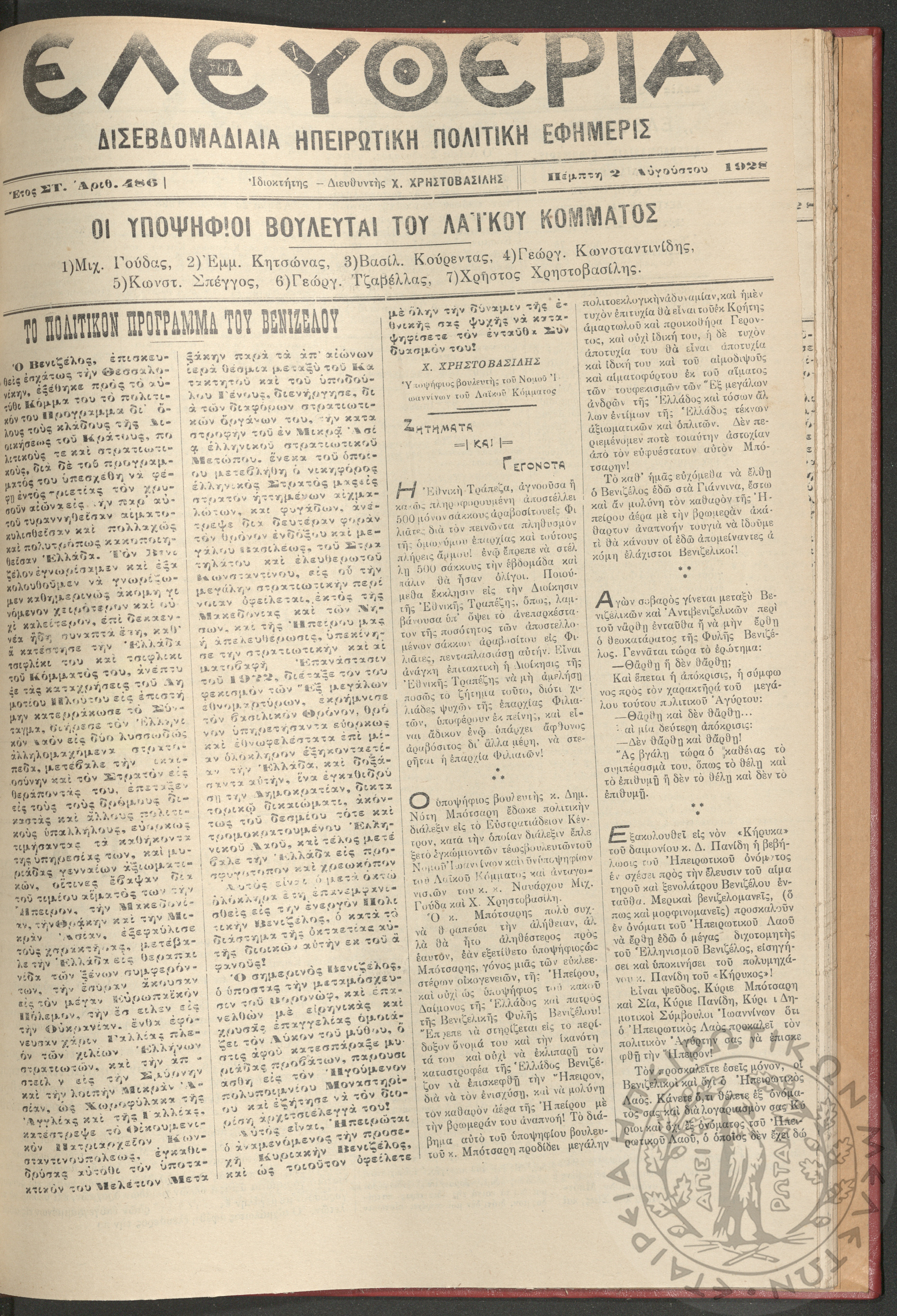 Ελευθερία: δισεβδομαδιαία Ηπειρωτική πολιτική εφημερίς, 1928, φ. 486