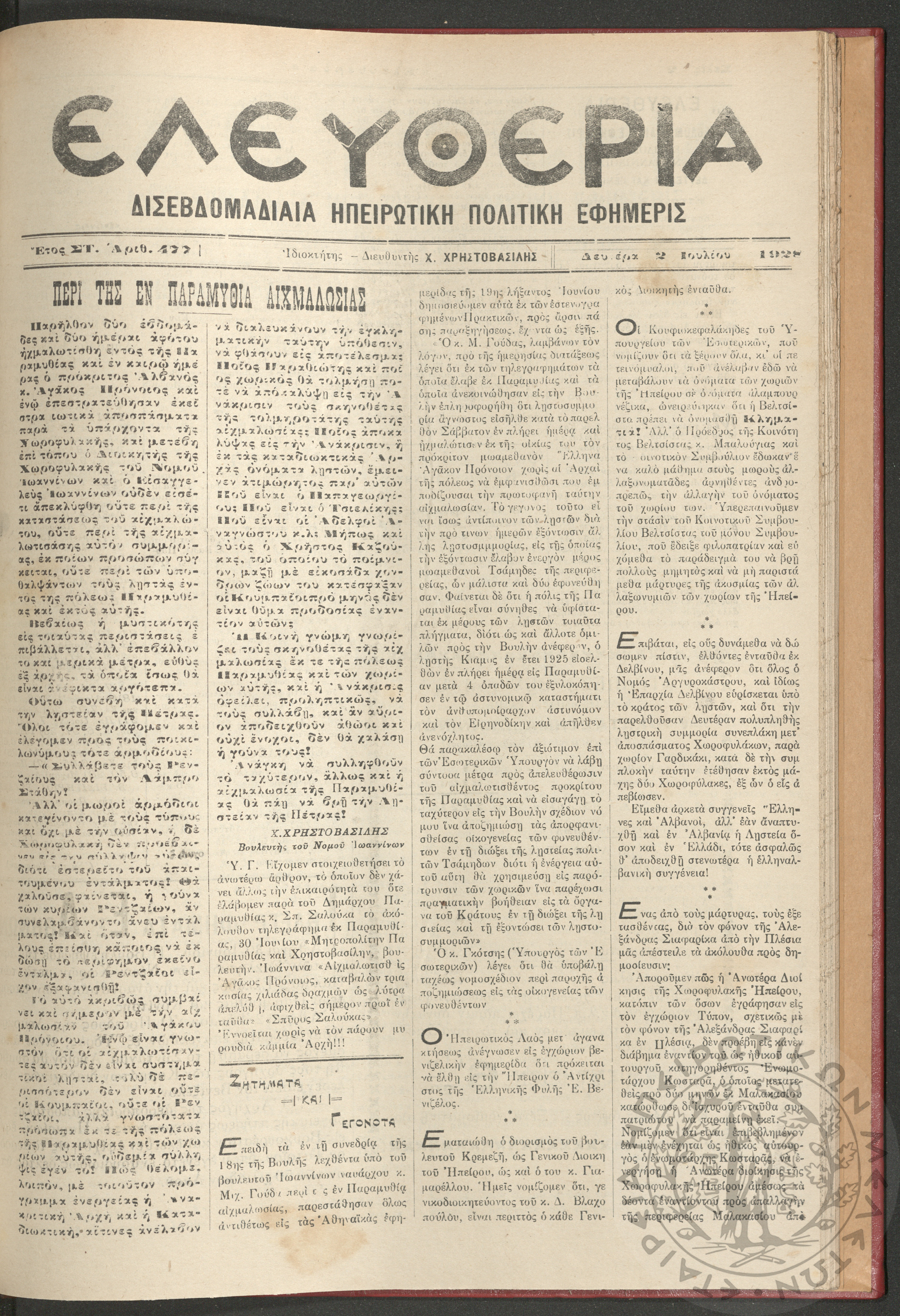 Ελευθερία: δισεβδομαδιαία Ηπειρωτική πολιτική εφημερίς, 1928, φ. 477