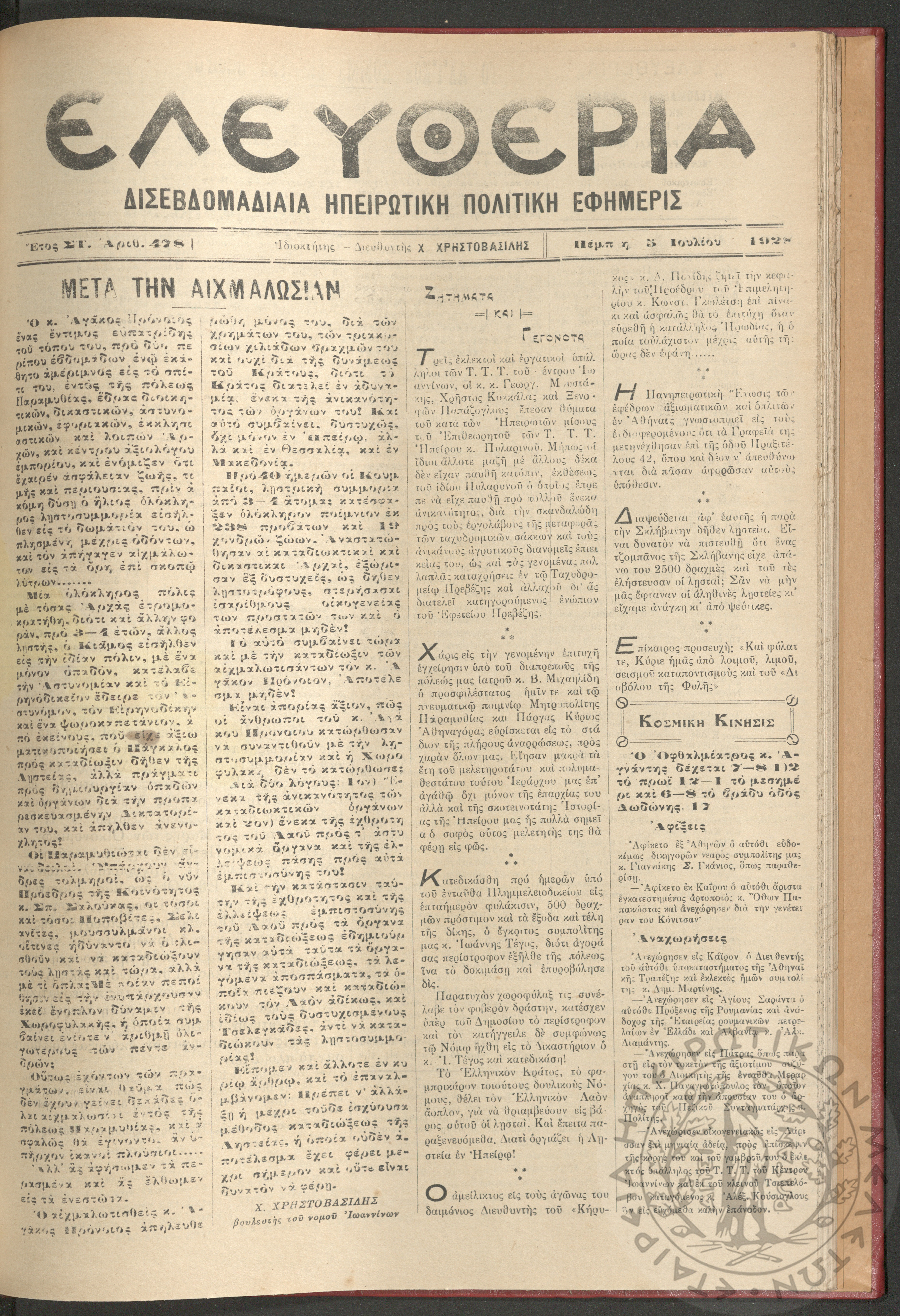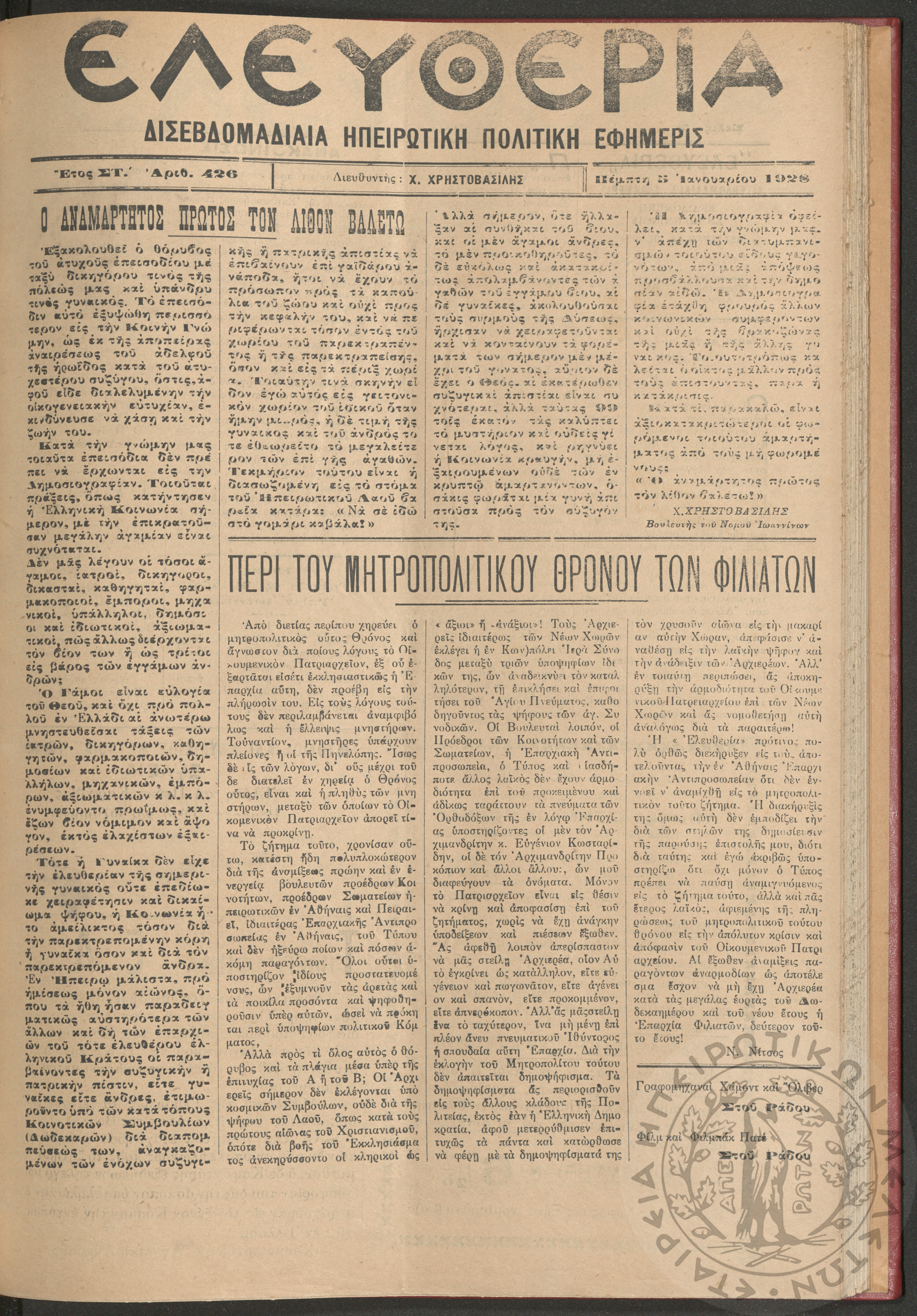 Ελευθερία: δισεβδομαδιαία Ηπειρωτική πολιτική εφημερίς, 1928, φ. 426