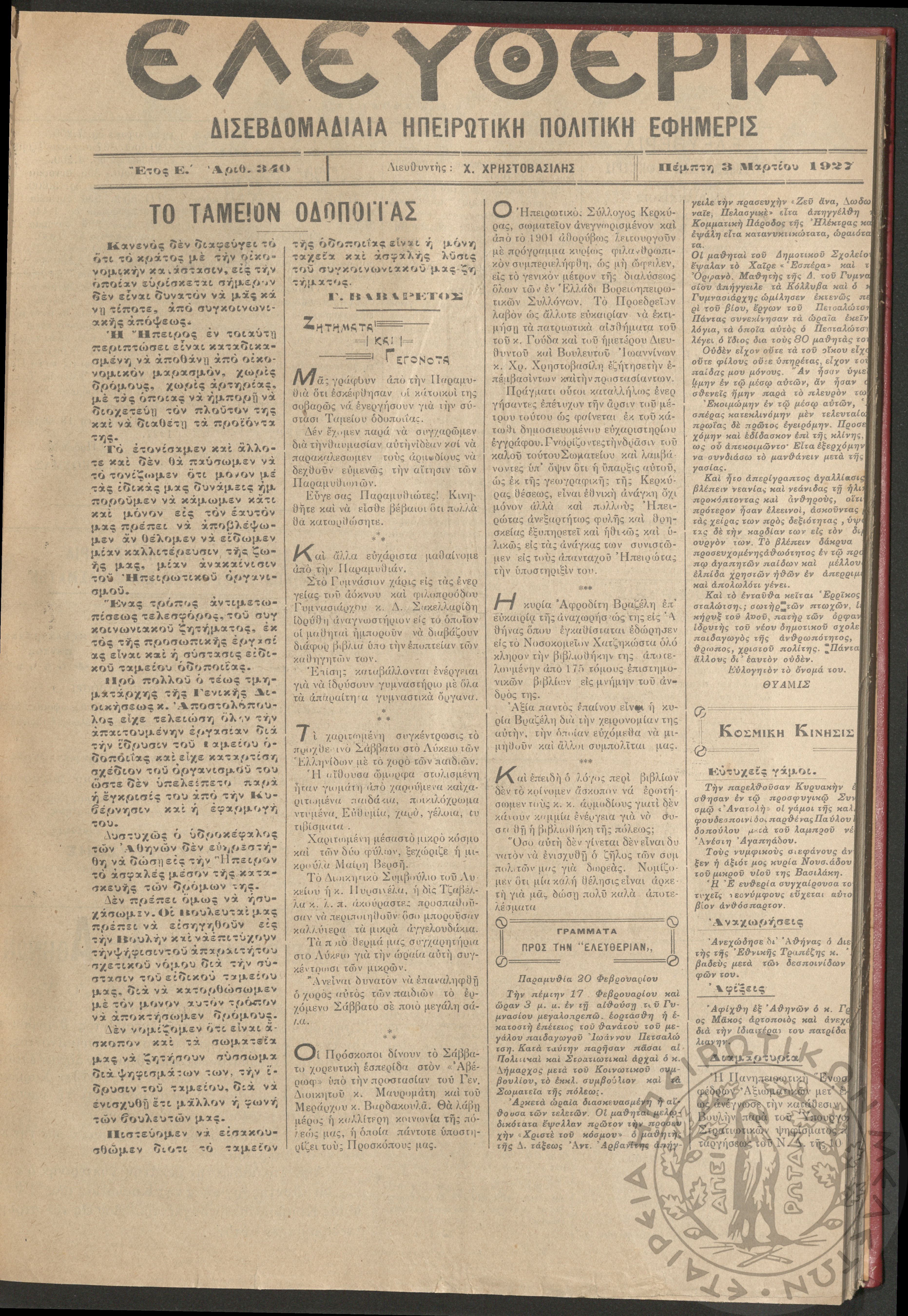 Ελευθερία: δισεβδομαδιαία Ηπειρωτική πολιτική εφημερίς, 1927, φ. 340