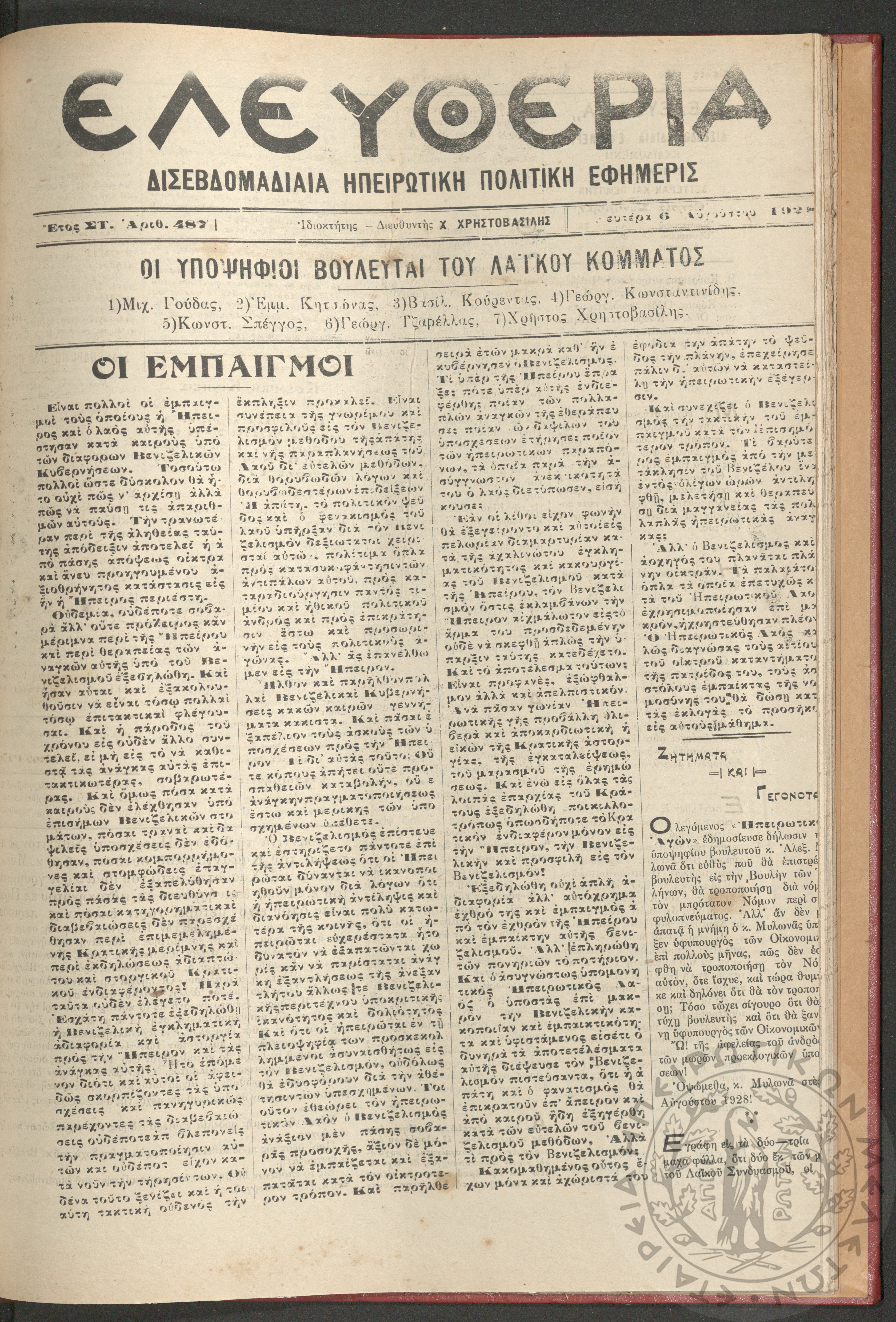 Ελευθερία: δισεβδομαδιαία Ηπειρωτική πολιτική εφημερίς, 1928, φ. 487