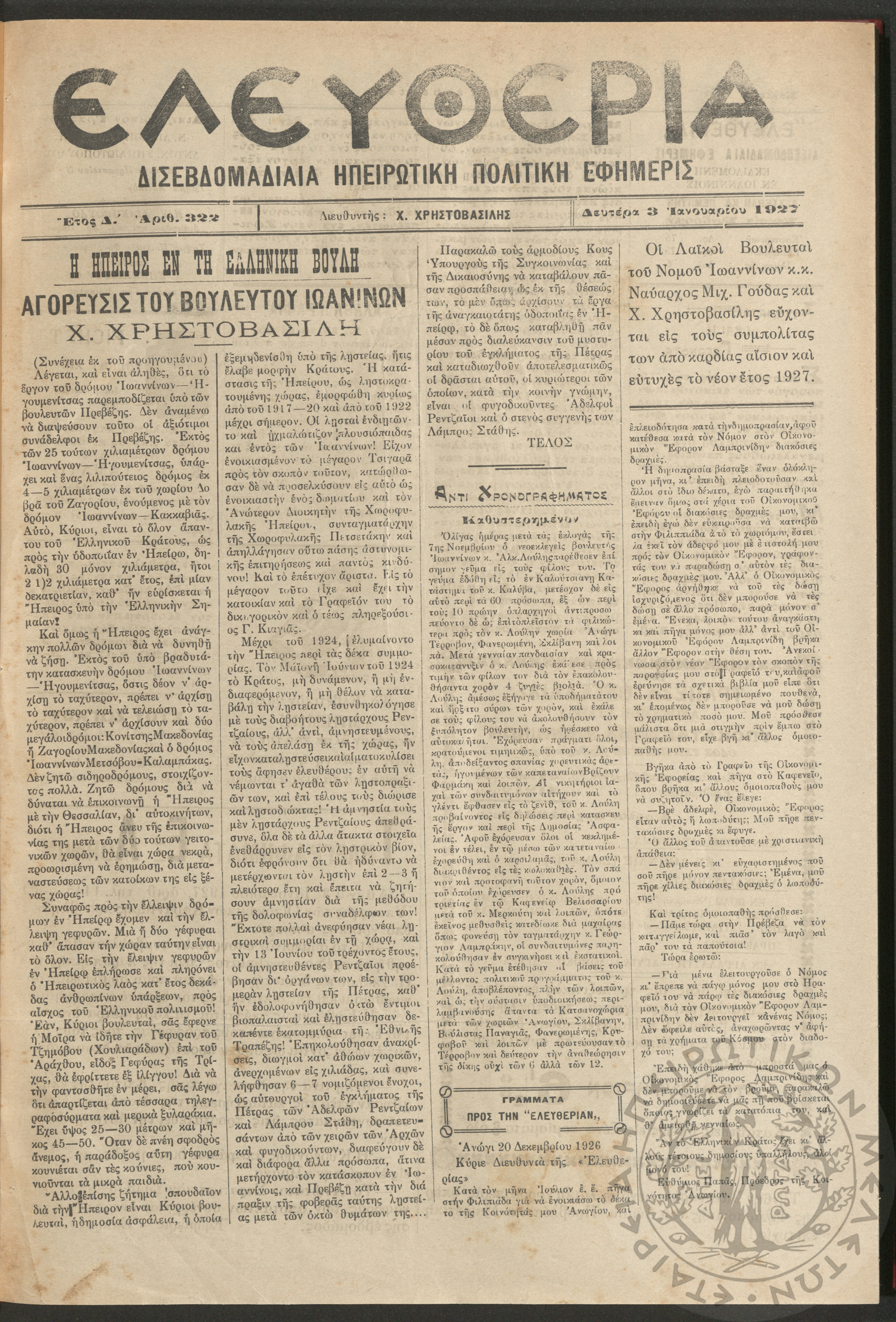 Ελευθερία: δισεβδομαδιαία Ηπειρωτική πολιτική εφημερίς, 1927, φ. 322