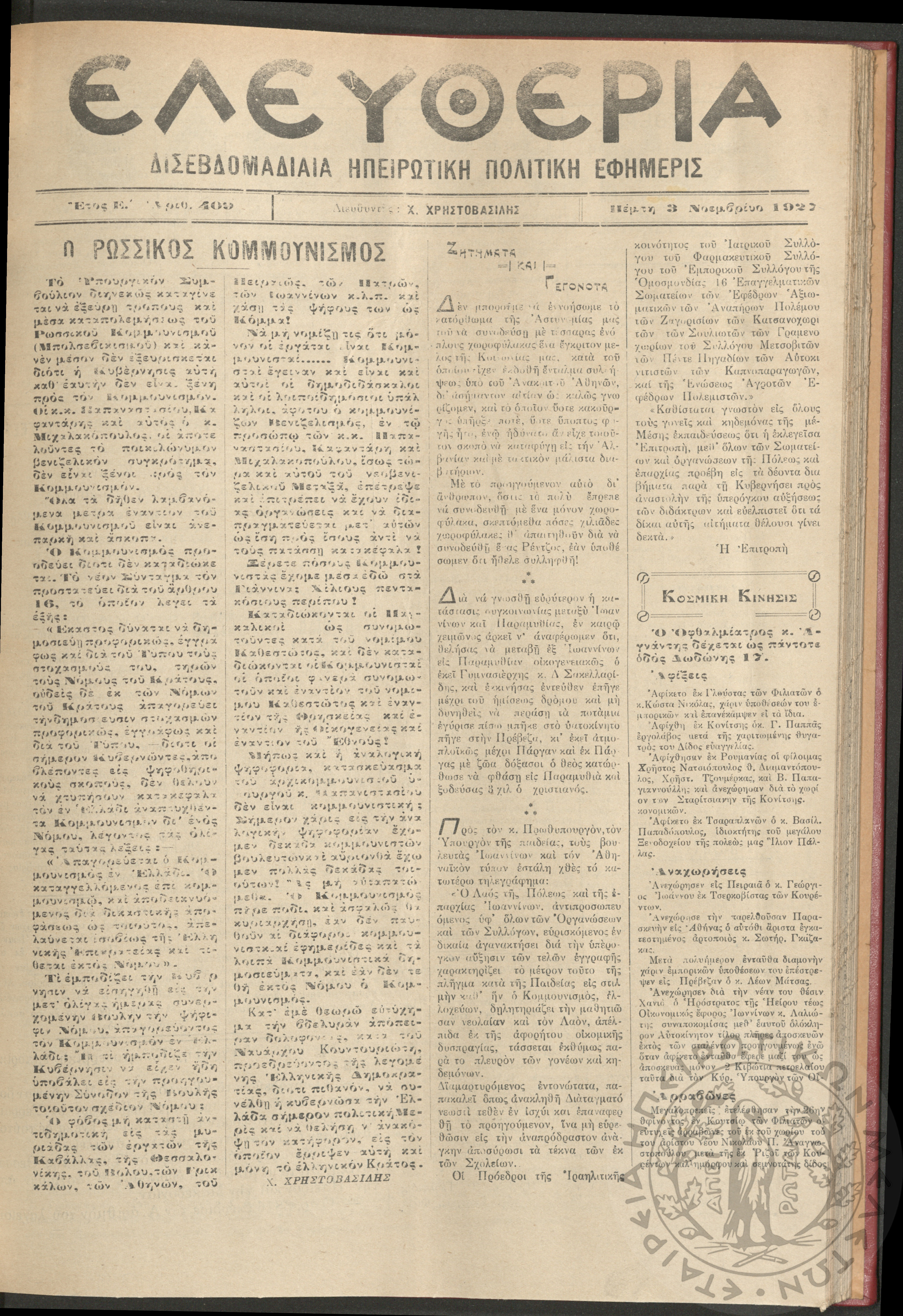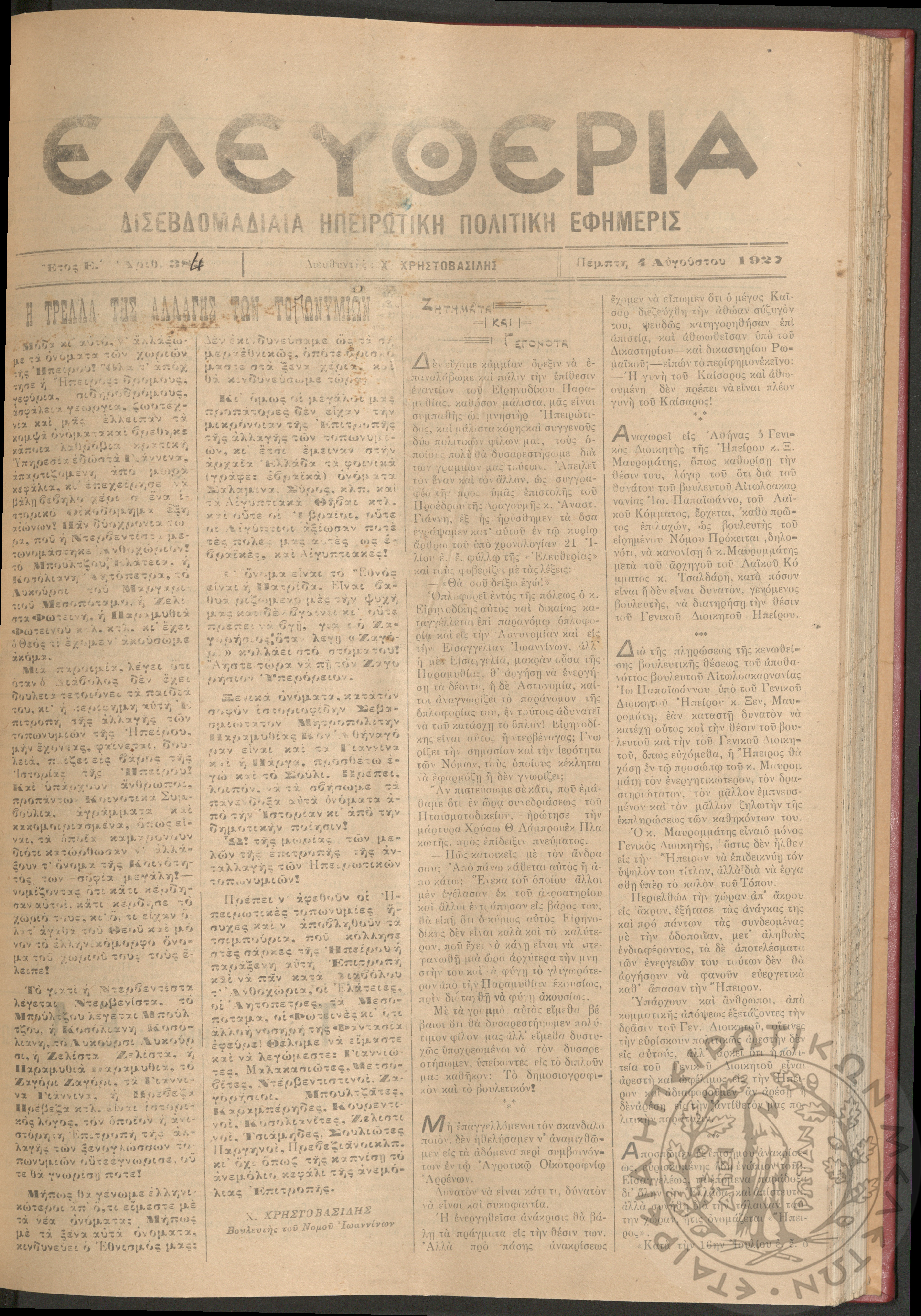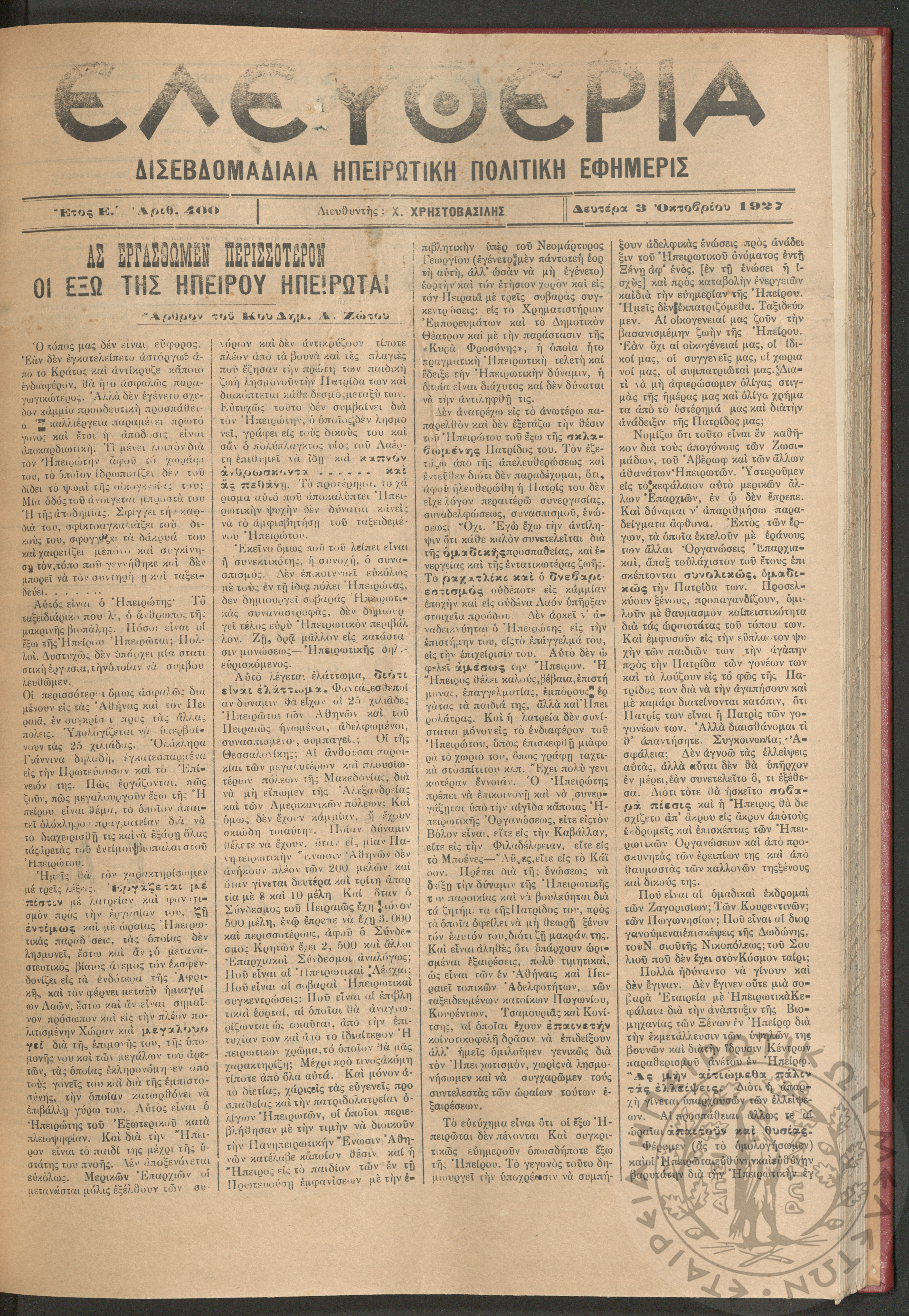 Ελευθερία: δισεβδομαδιαία Ηπειρωτική πολιτική εφημερίς, 1927, φ. 400