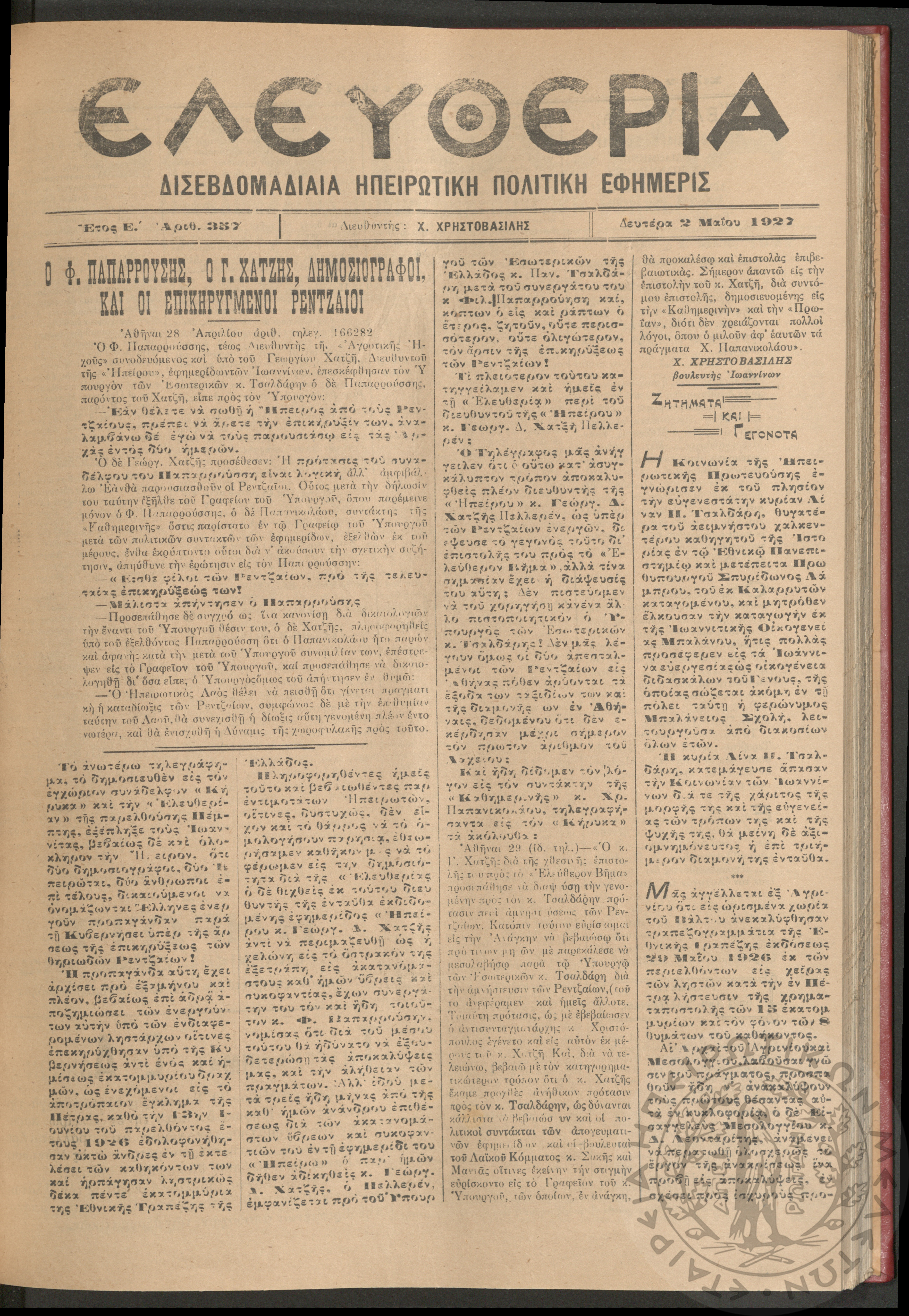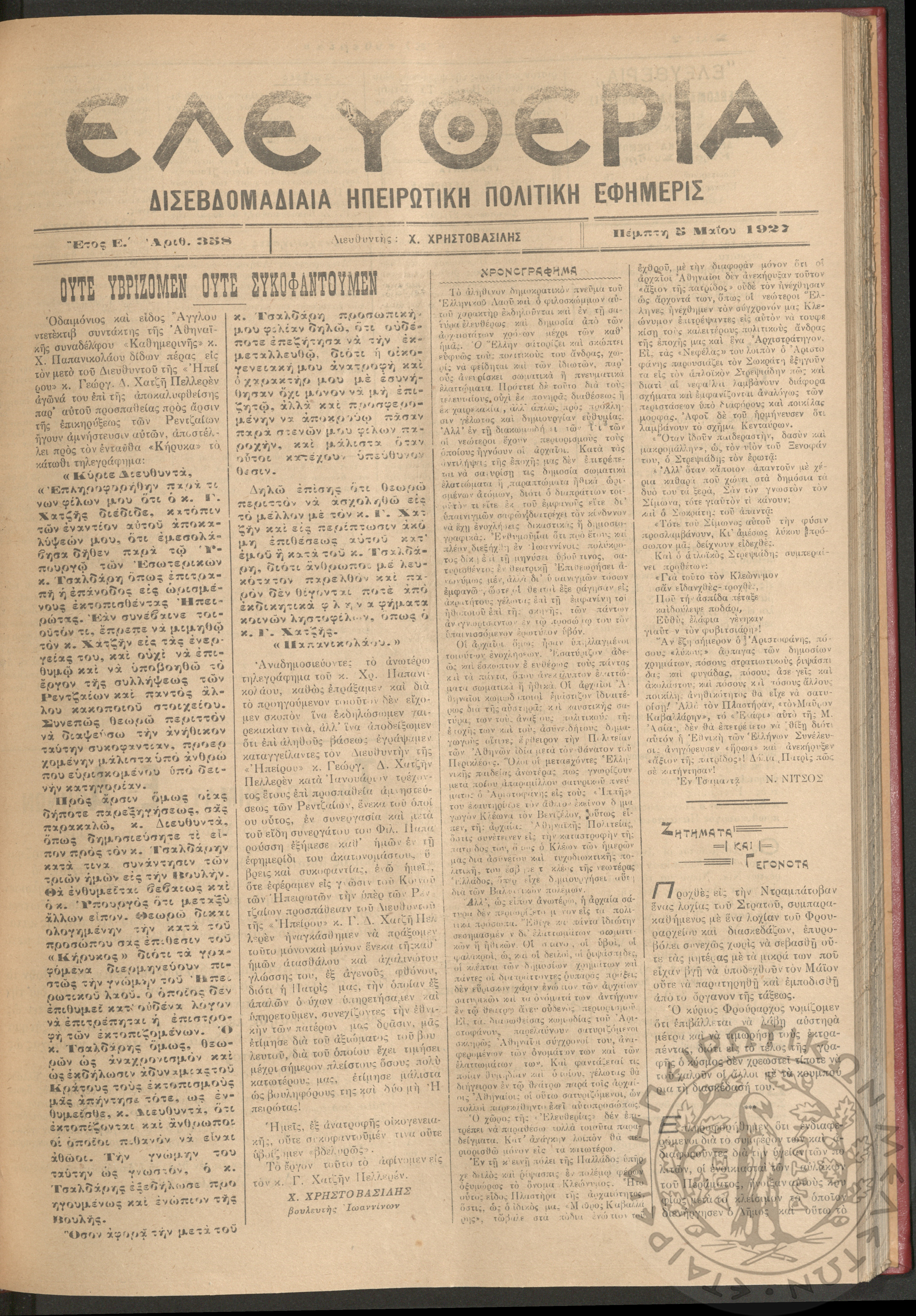 Ελευθερία: δισεβδομαδιαία Ηπειρωτική πολιτική εφημερίς, 1927, φ. 357