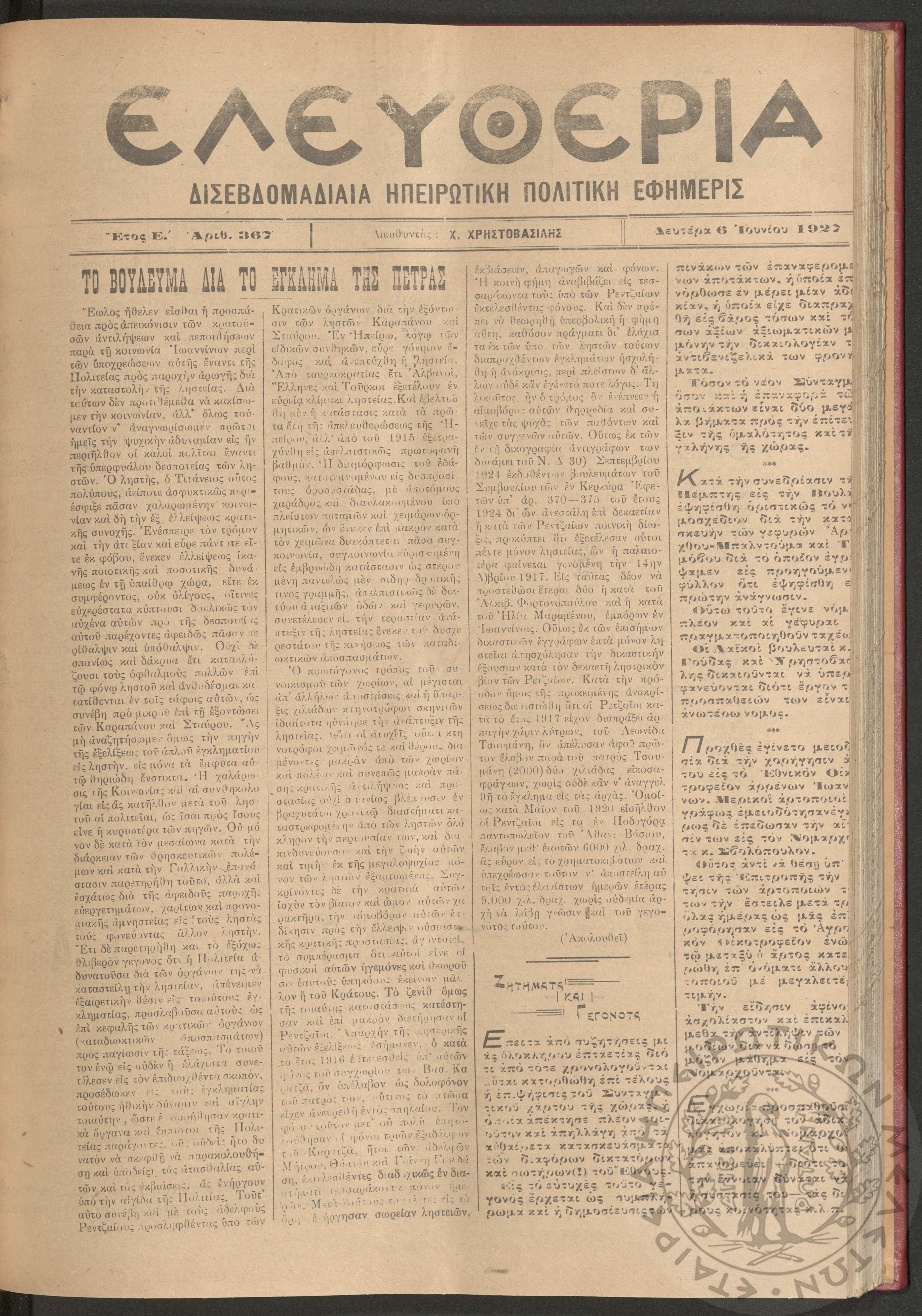 Ελευθερία: δισεβδομαδιαία Ηπειρωτική πολιτική εφημερίς, 1927, φ. 367