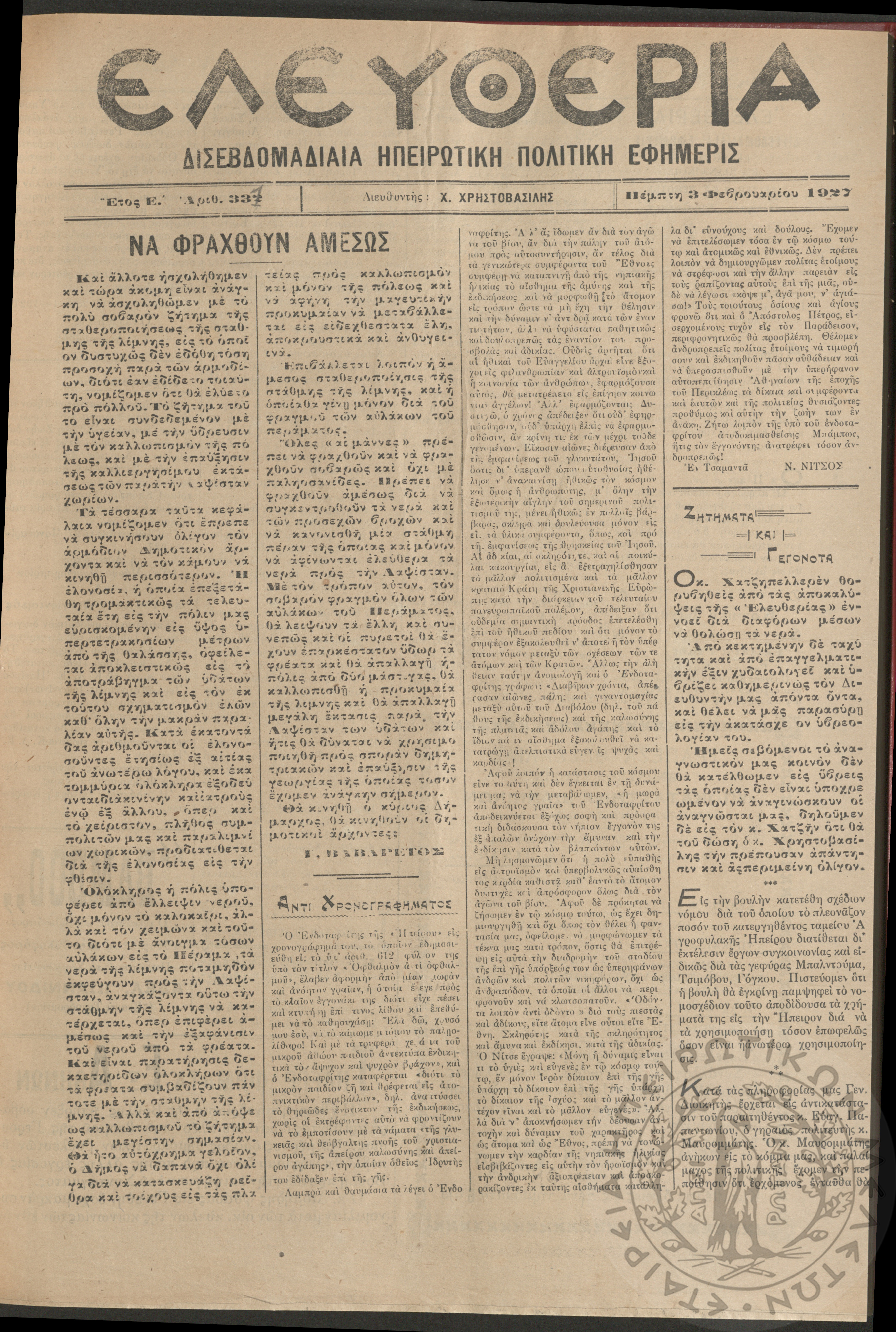 Ελευθερία: δισεβδομαδιαία Ηπειρωτική πολιτική εφημερίς, 1927, φ. 331