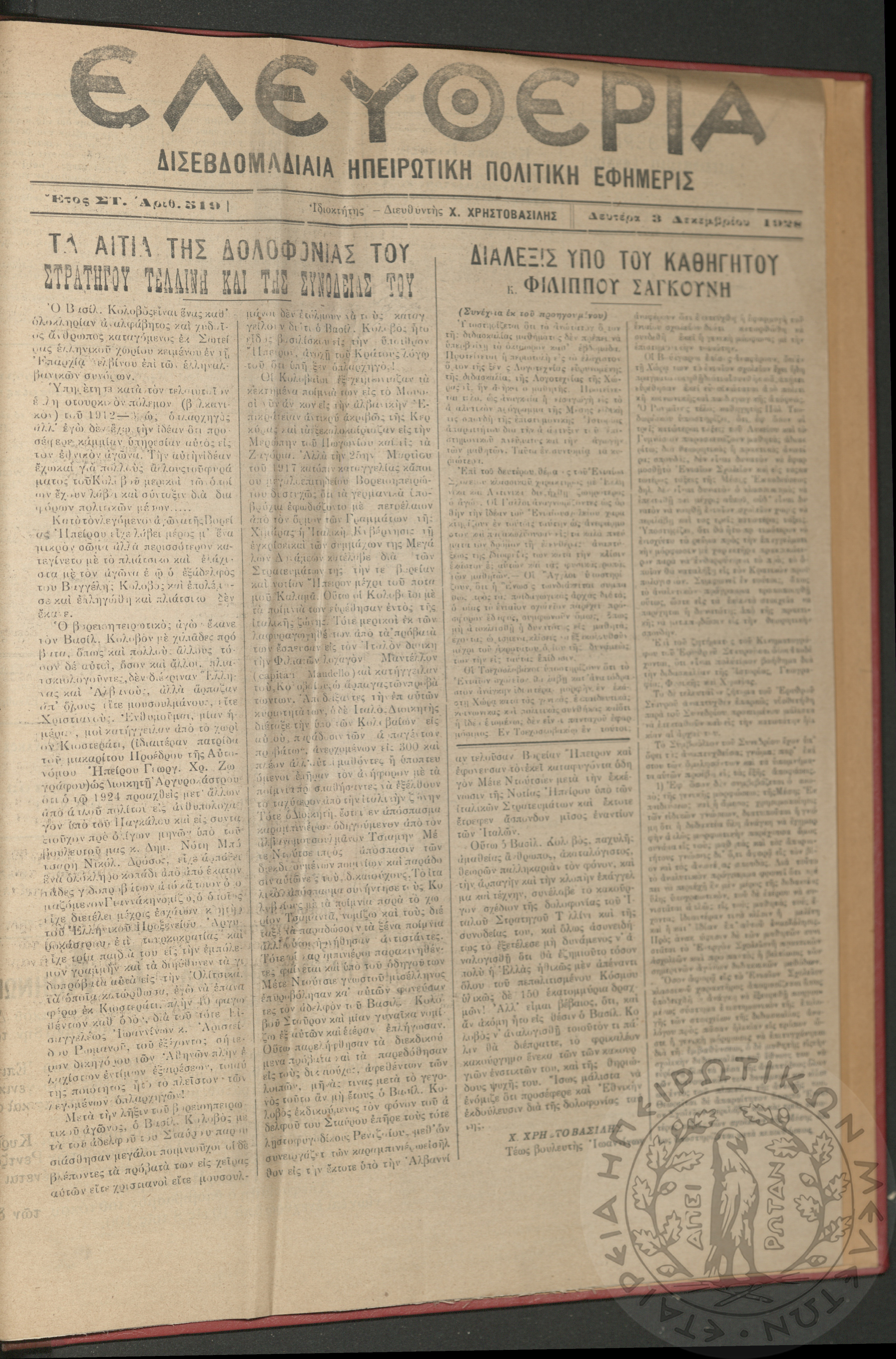 Ελευθερία: δισεβδομαδιαία Ηπειρωτική πολιτική εφημερίς, 1928, φ. 519