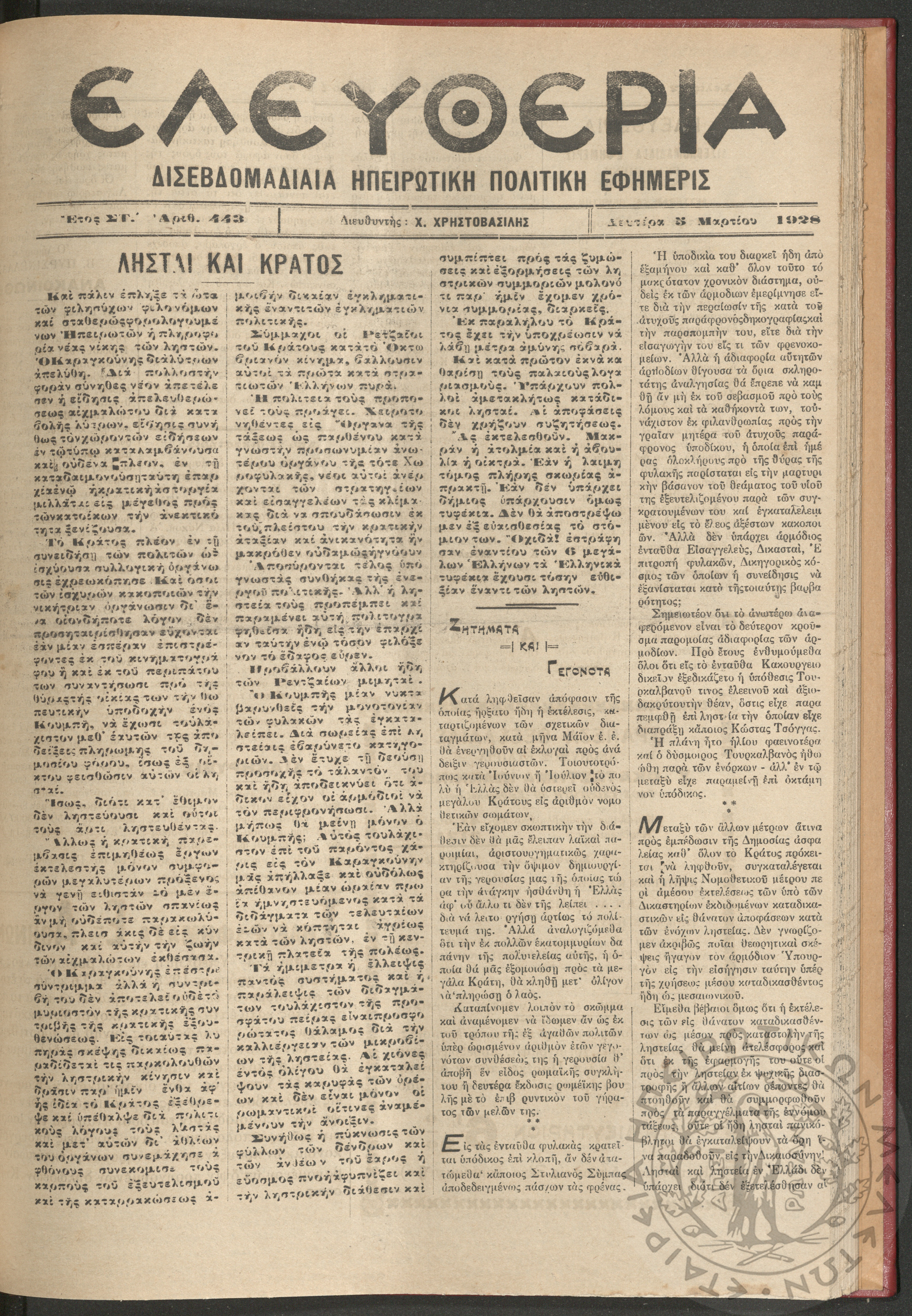 Ελευθερία: δισεβδομαδιαία Ηπειρωτική πολιτική εφημερίς, 1928, φ. 443