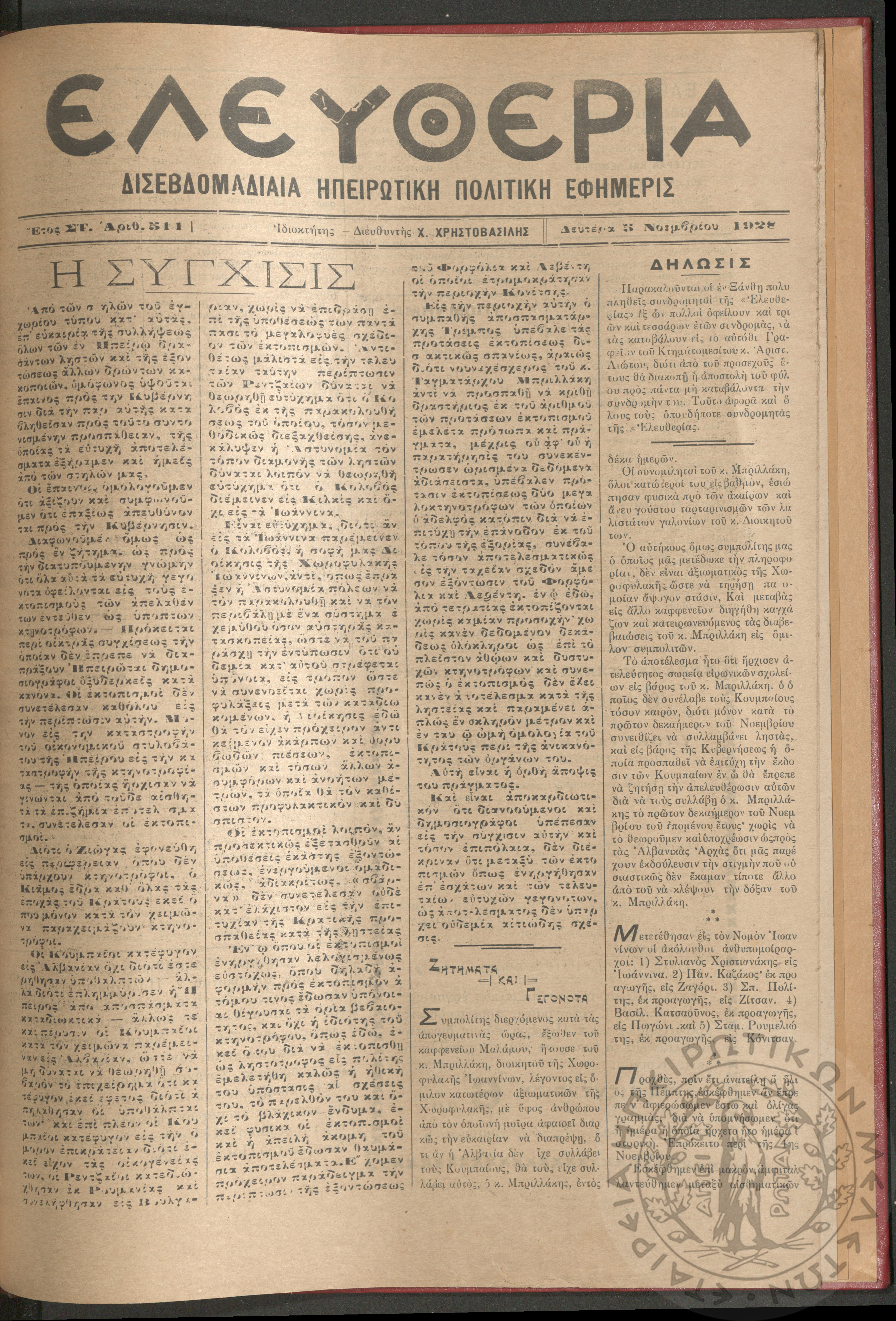 Ελευθερία: δισεβδομαδιαία Ηπειρωτική πολιτική εφημερίς, 1928, φ. 511