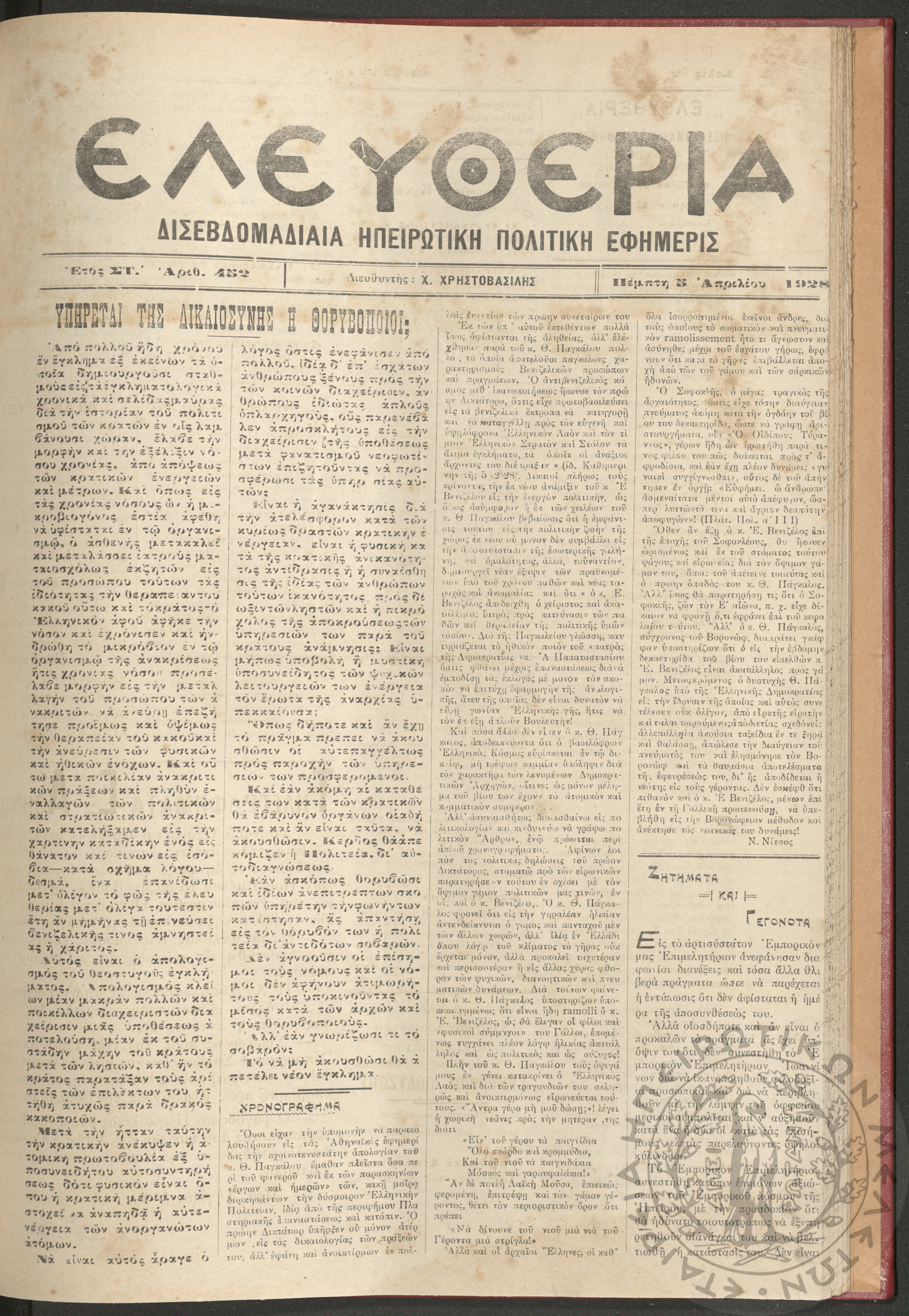 Ελευθερία: δισεβδομαδιαία Ηπειρωτική πολιτική εφημερίς, 1928, φ. 452