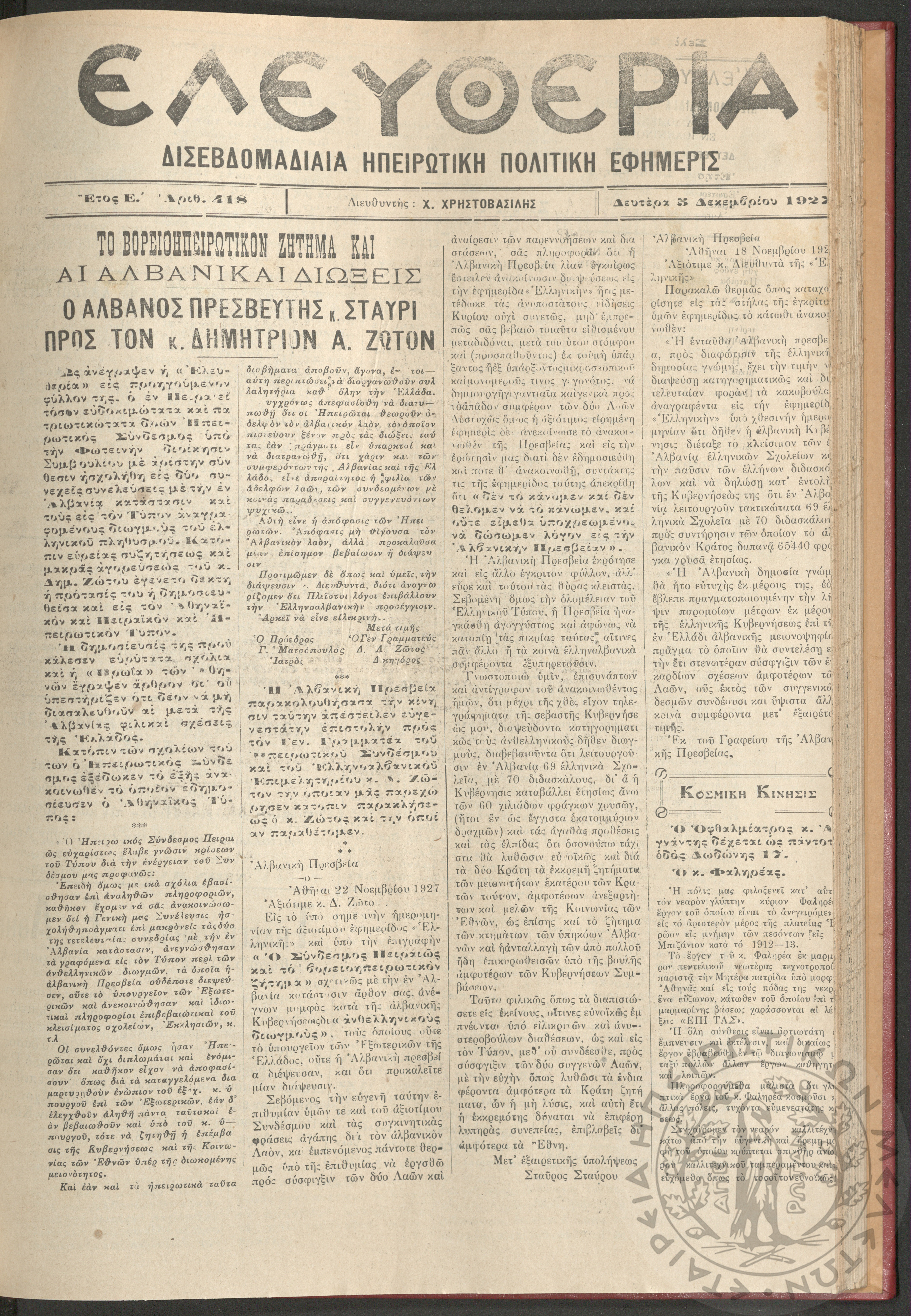 Ελευθερία: δισεβδομαδιαία Ηπειρωτική πολιτική εφημερίς, 1927, φ. 418