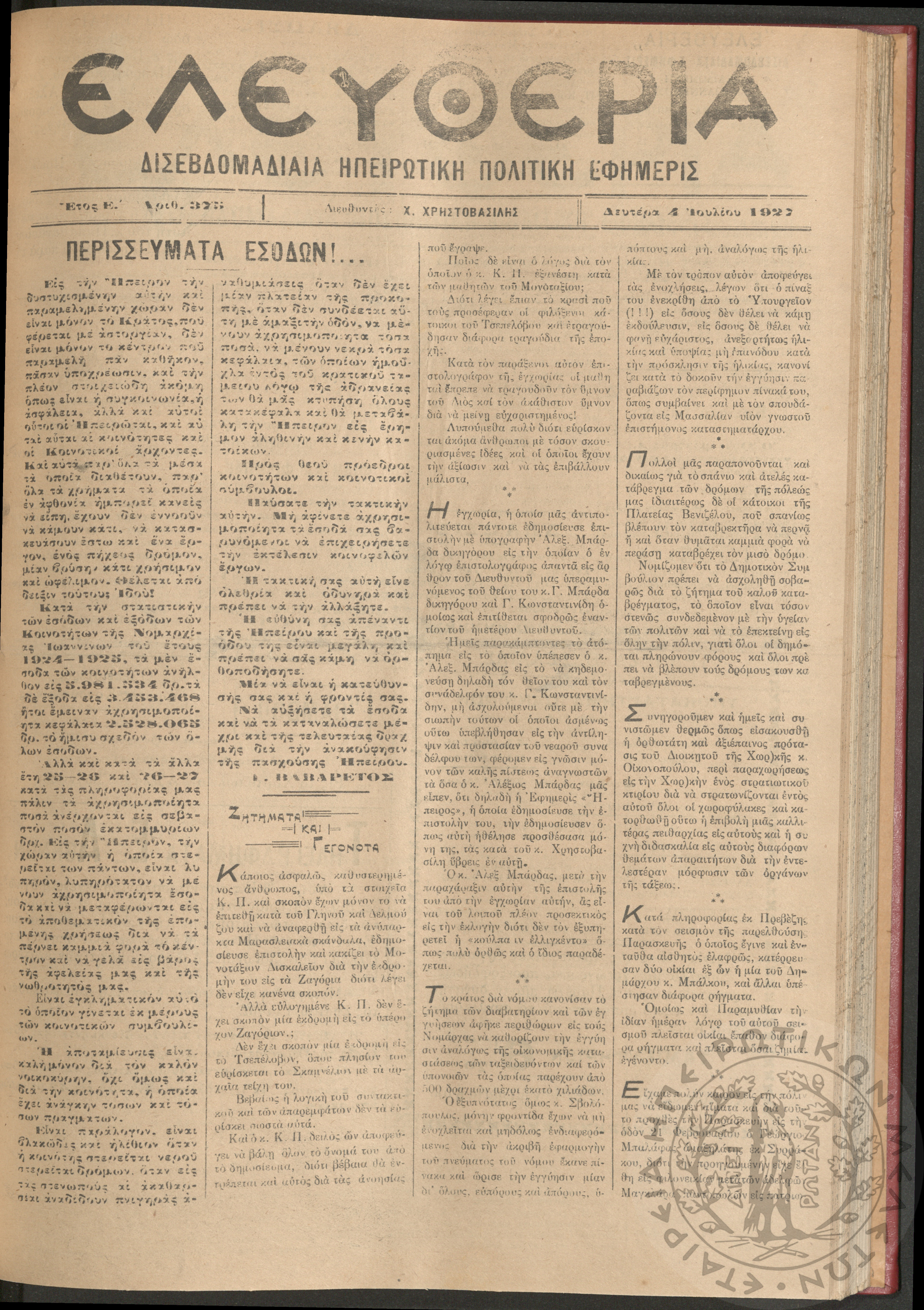 Ελευθερία: δισεβδομαδιαία Ηπειρωτική πολιτική εφημερίς, 1927, φ. 375
