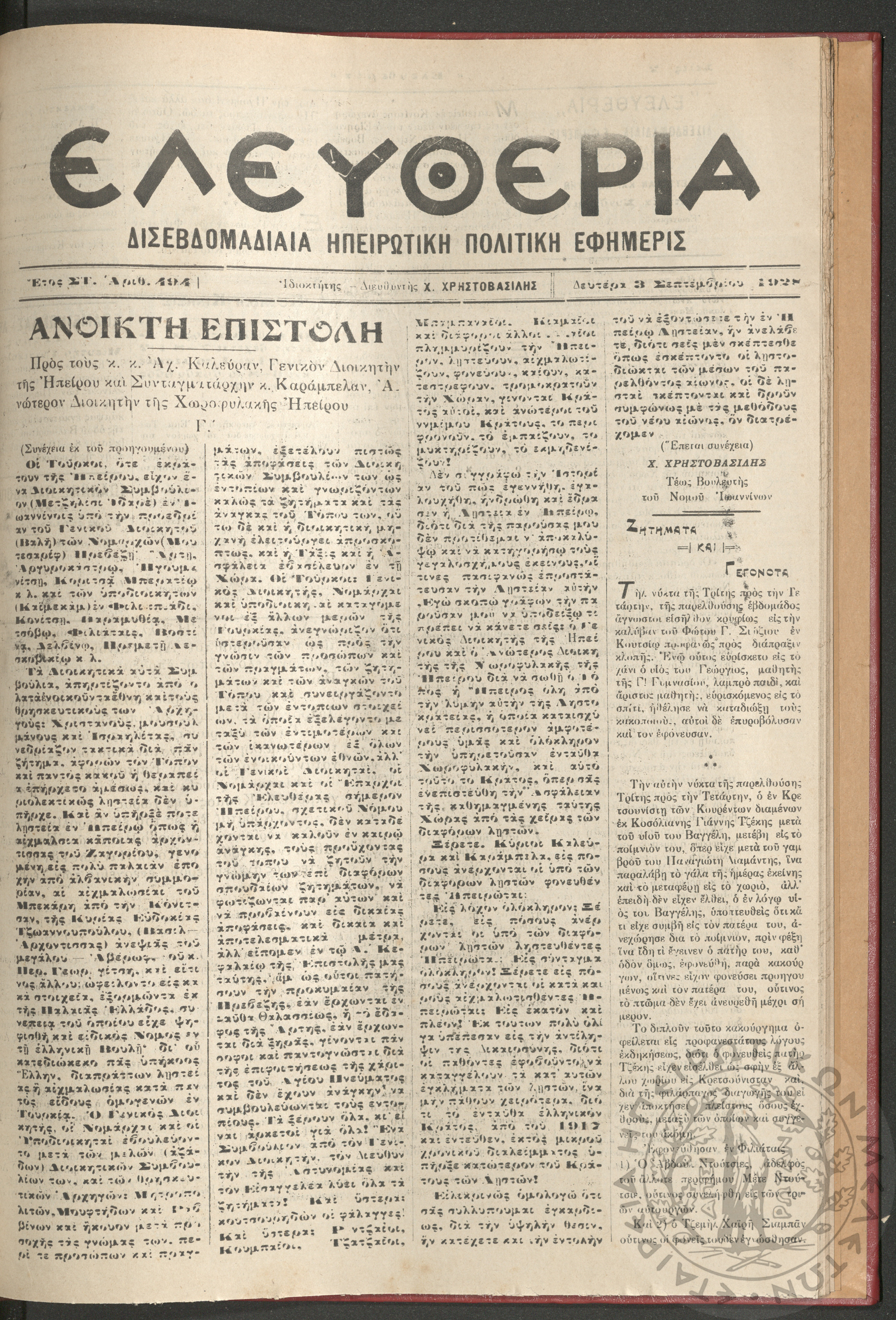 Ελευθερία: δισεβδομαδιαία Ηπειρωτική πολιτική εφημερίς, 1928, φ. 494