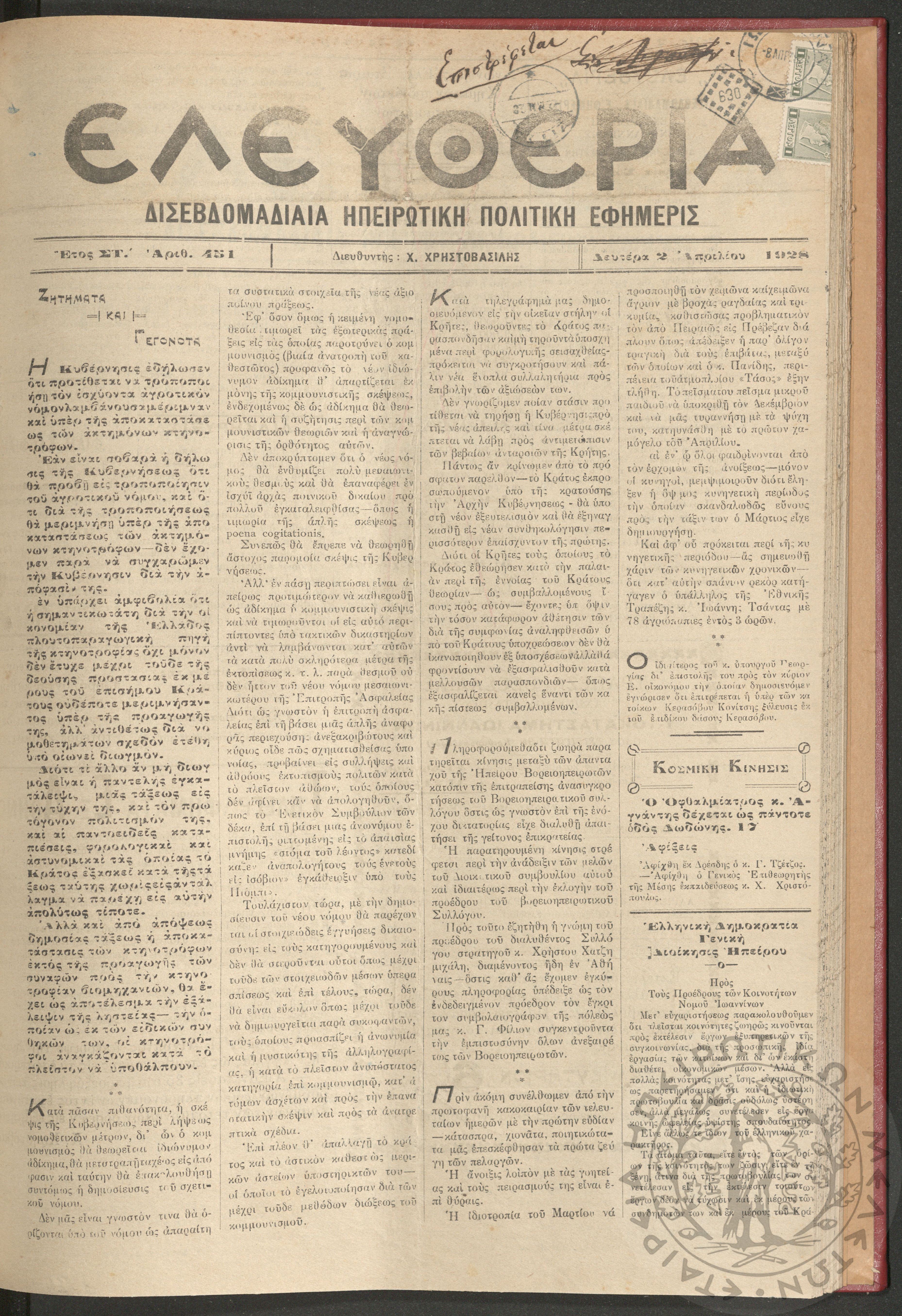 Ελευθερία: δισεβδομαδιαία Ηπειρωτική πολιτική εφημερίς, 1928, φ. 451