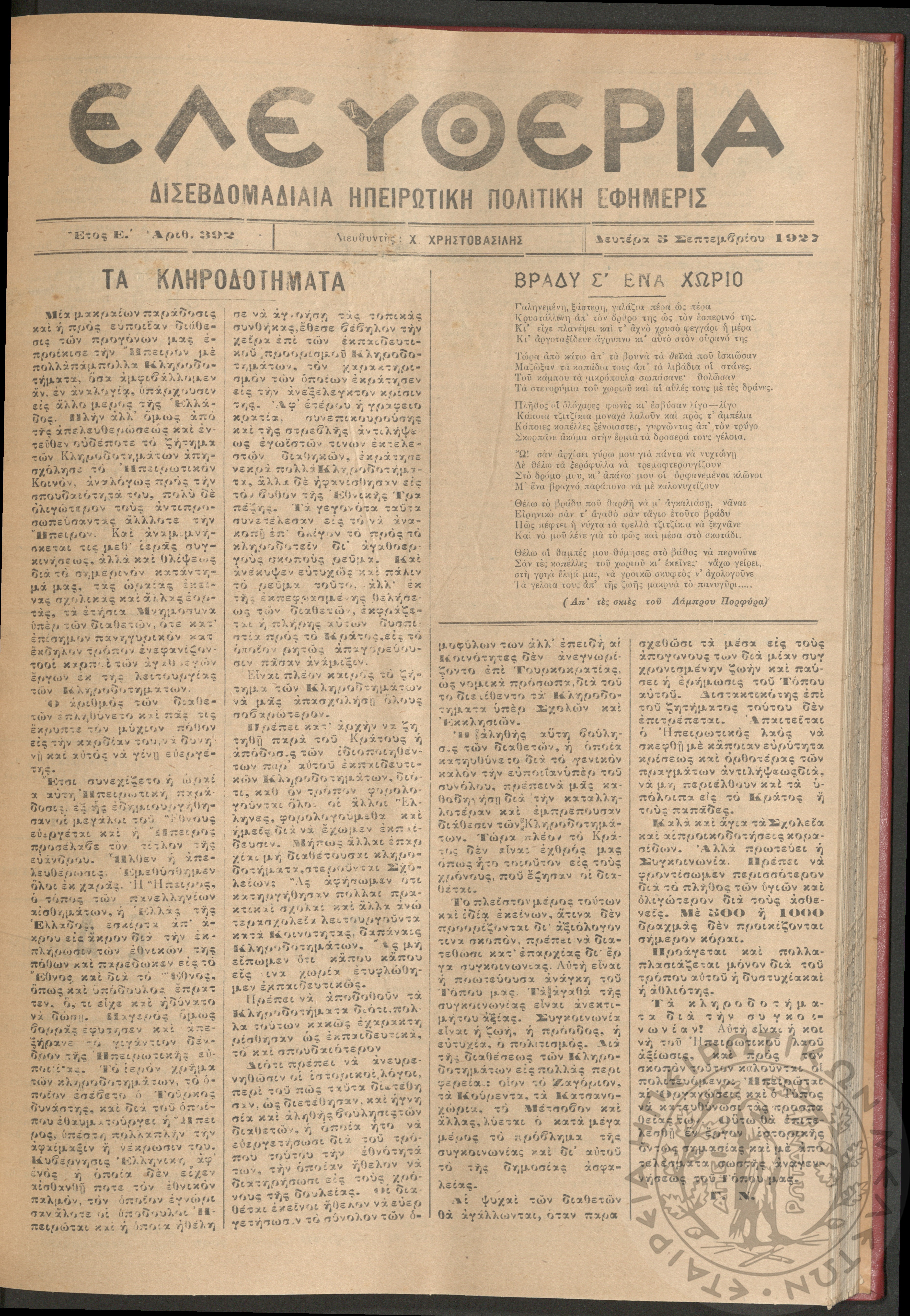 Ελευθερία: δισεβδομαδιαία Ηπειρωτική πολιτική εφημερίς, 1927, φ. 392