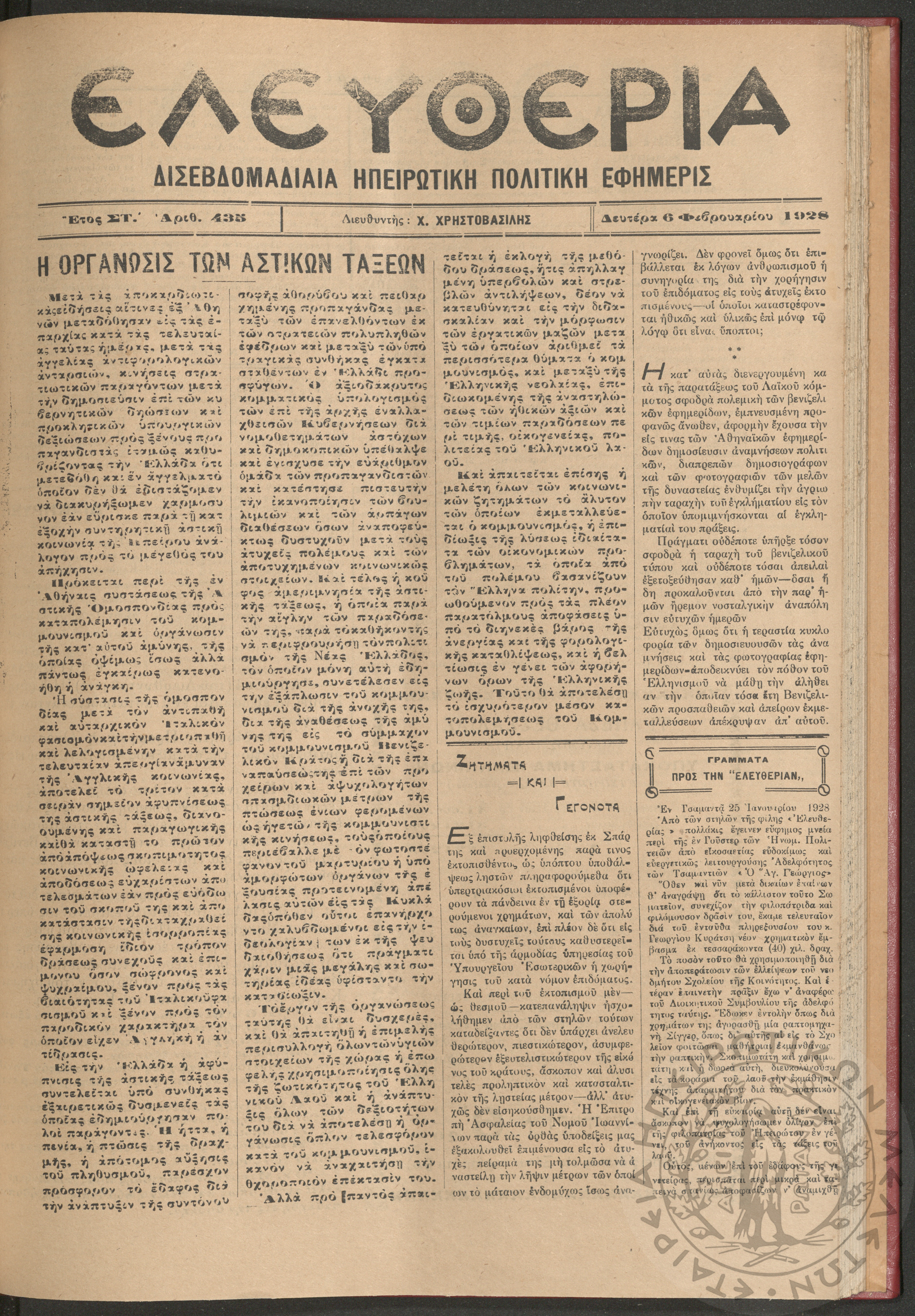 Ελευθερία: δισεβδομαδιαία Ηπειρωτική πολιτική εφημερίς, 1928, φ. 435