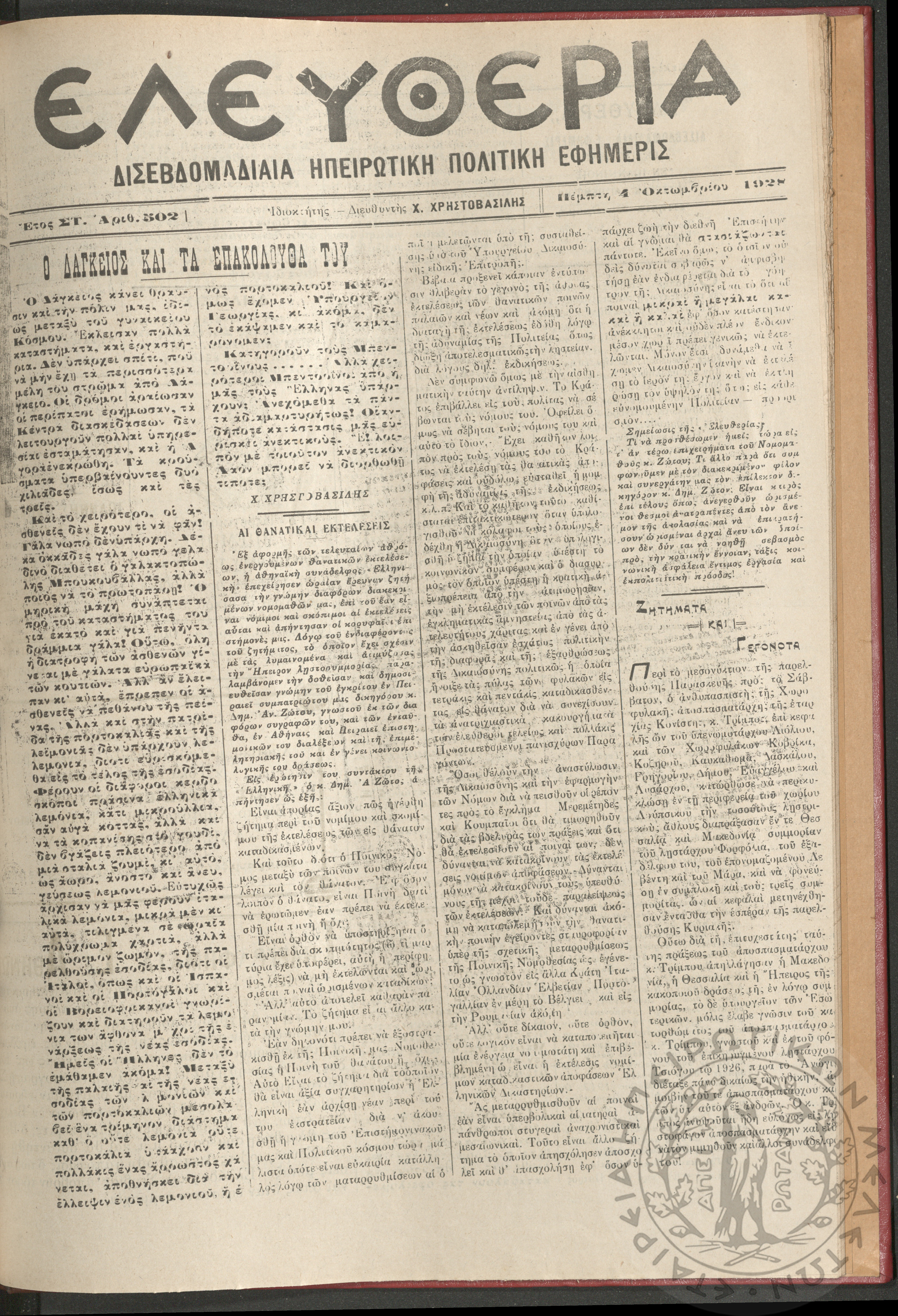 Ελευθερία: δισεβδομαδιαία Ηπειρωτική πολιτική εφημερίς, 1928, φ. 502