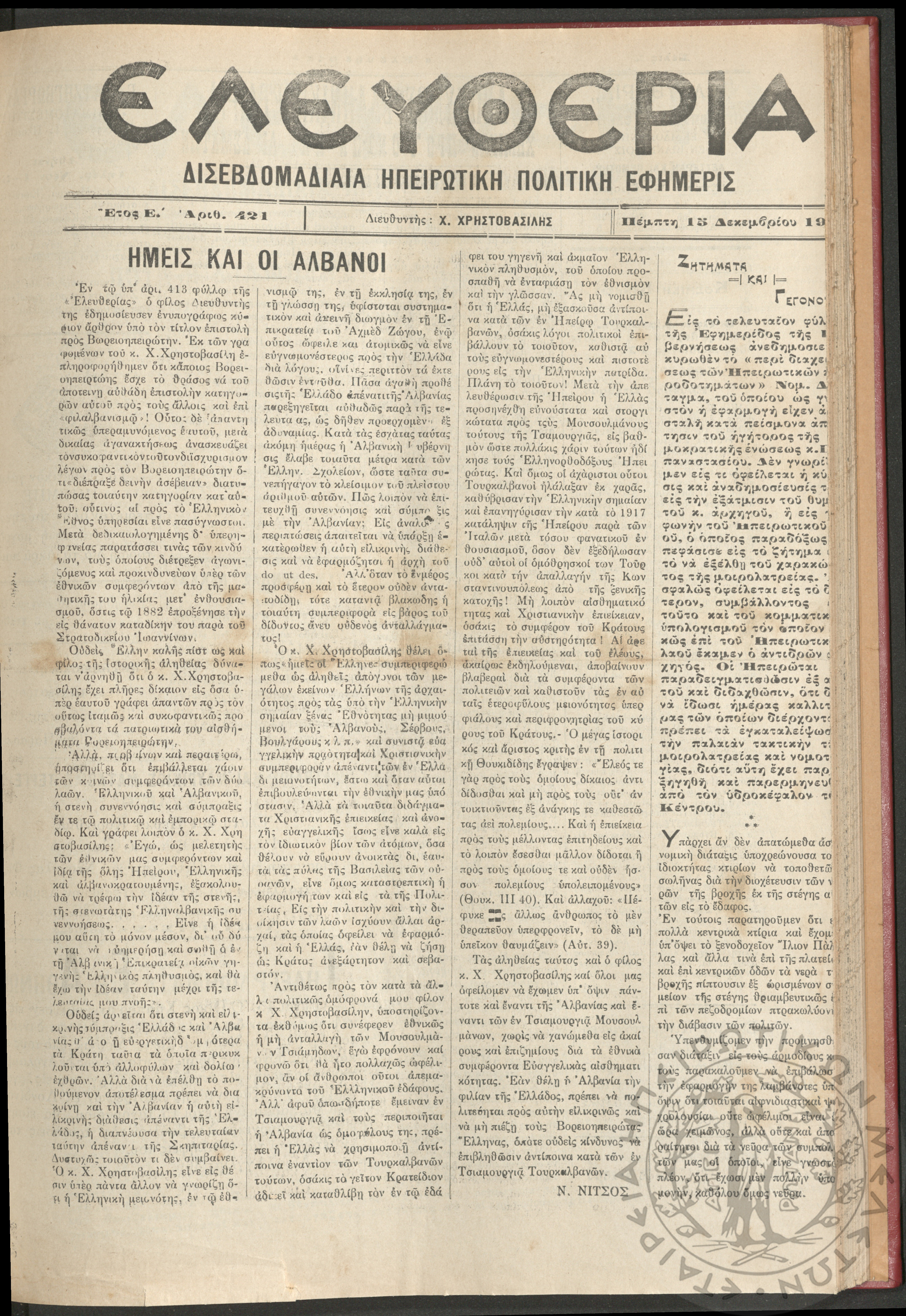 Ελευθερία: δισεβδομαδιαία Ηπειρωτική πολιτική εφημερίς, 1927, φ. 421