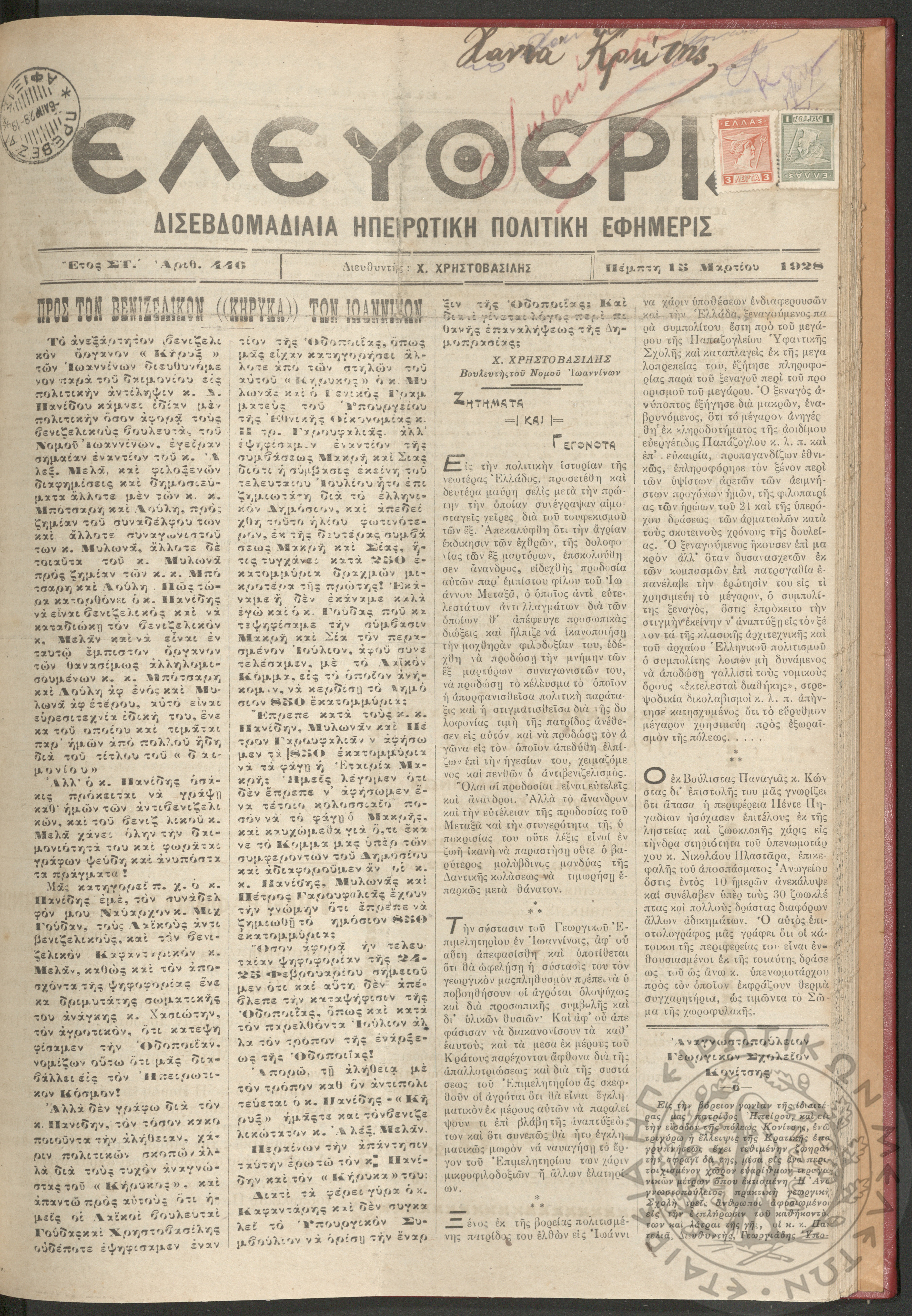 Ελευθερία: δισεβδομαδιαία Ηπειρωτική πολιτική εφημερίς, 1928, φ. 446