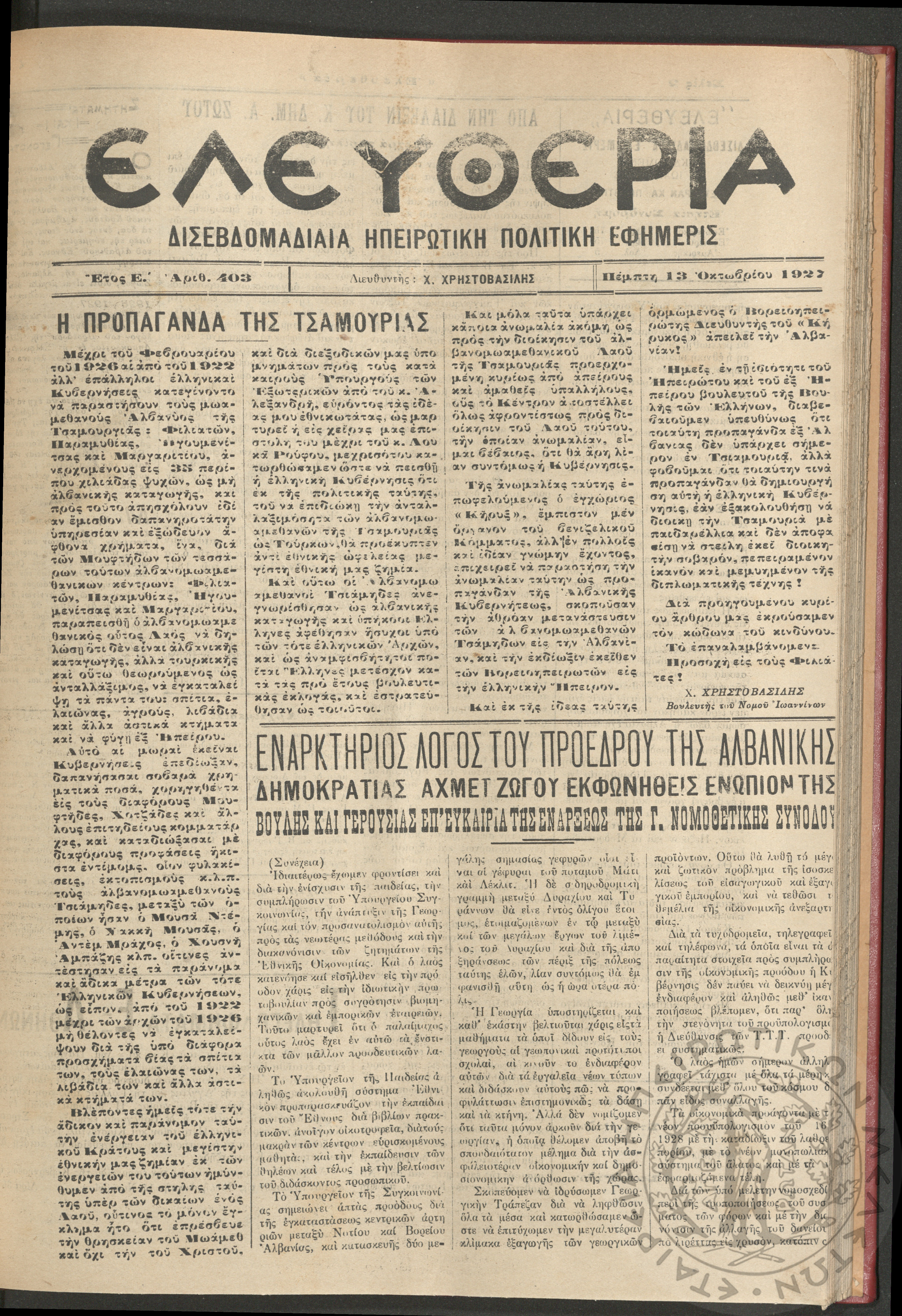 Ελευθερία: δισεβδομαδιαία Ηπειρωτική πολιτική εφημερίς, 1927, φ. 403