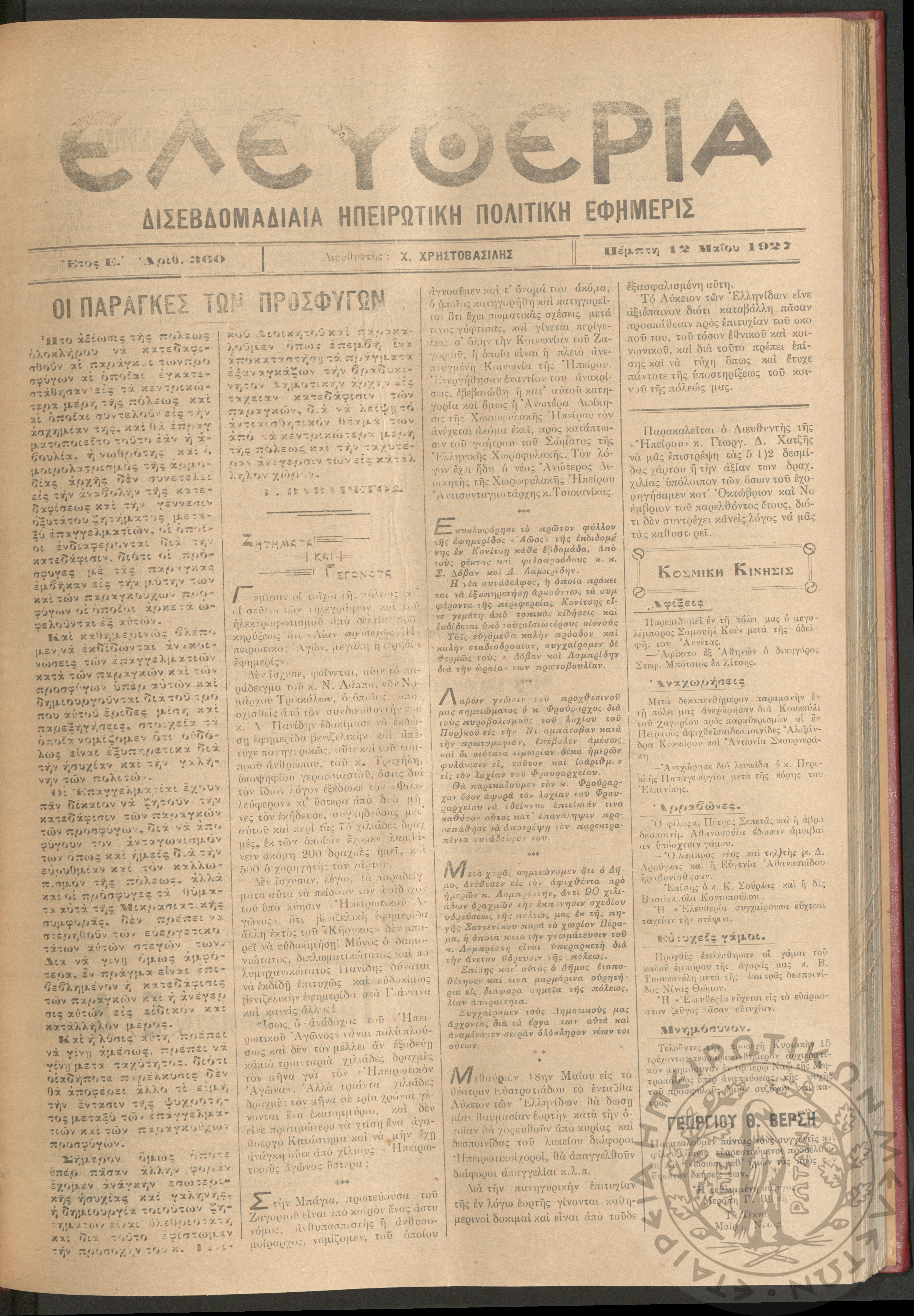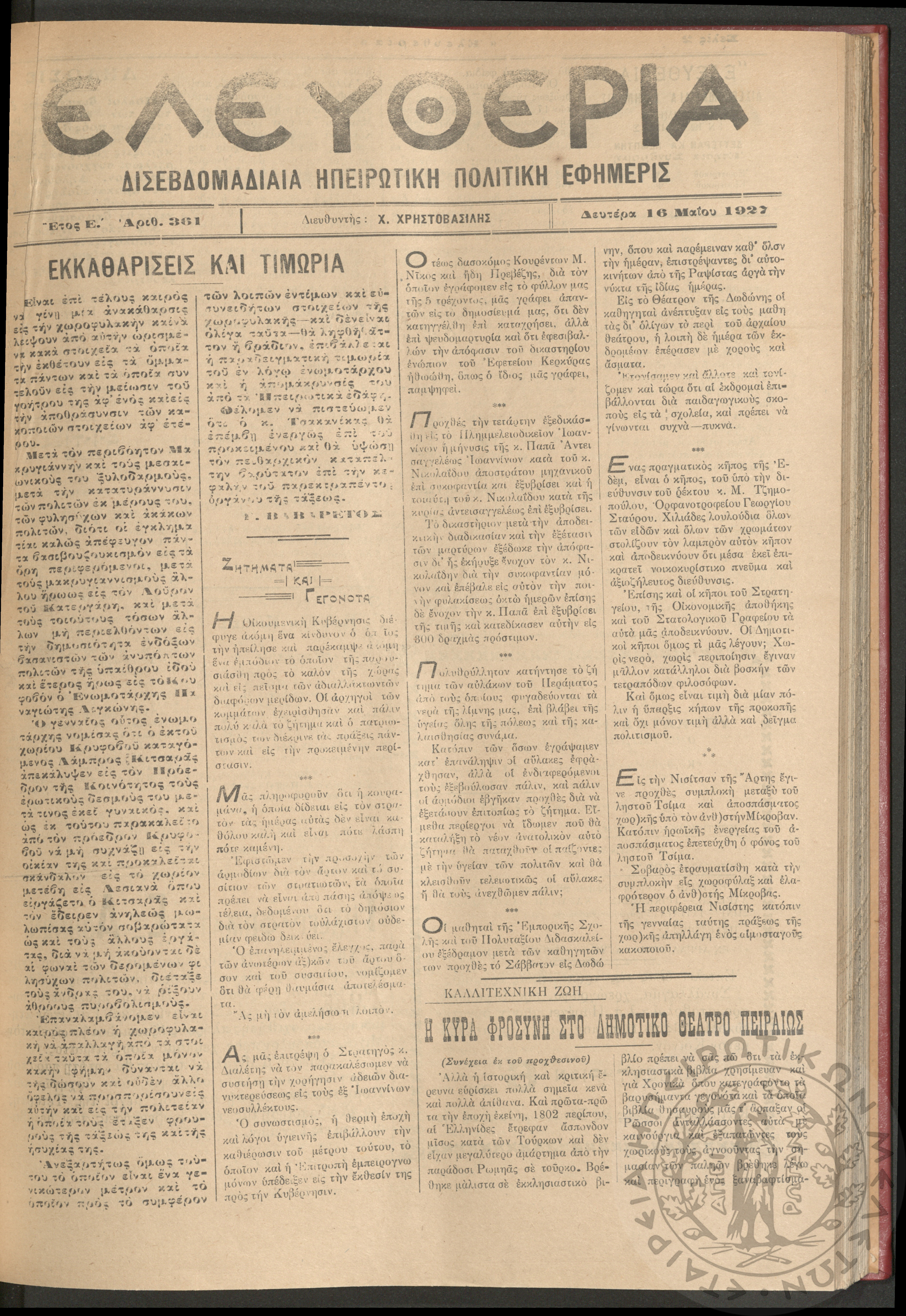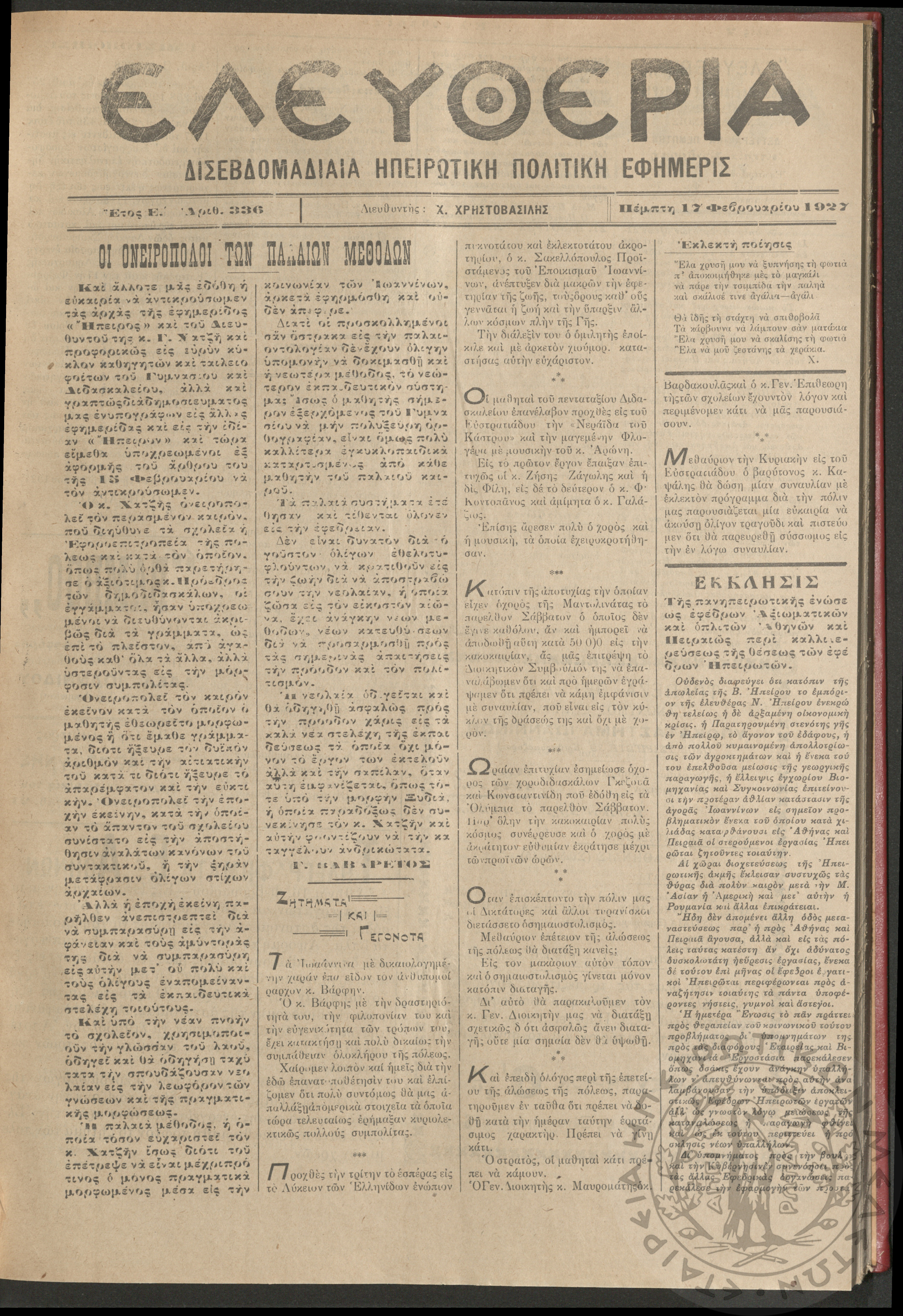Ελευθερία: δισεβδομαδιαία Ηπειρωτική πολιτική εφημερίς, 1927, φ. 335