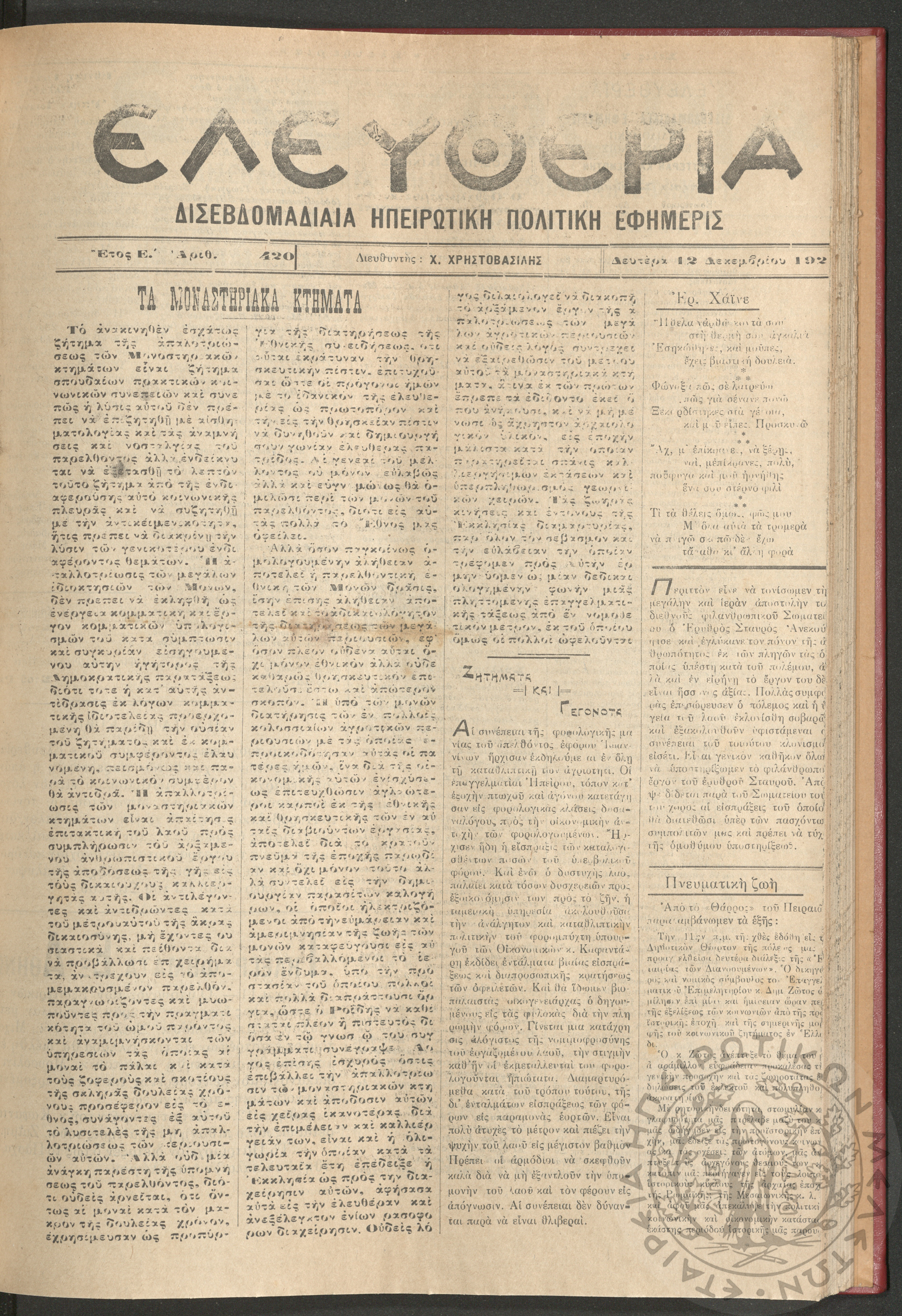 Ελευθερία: δισεβδομαδιαία Ηπειρωτική πολιτική εφημερίς, 1927, φ. 420