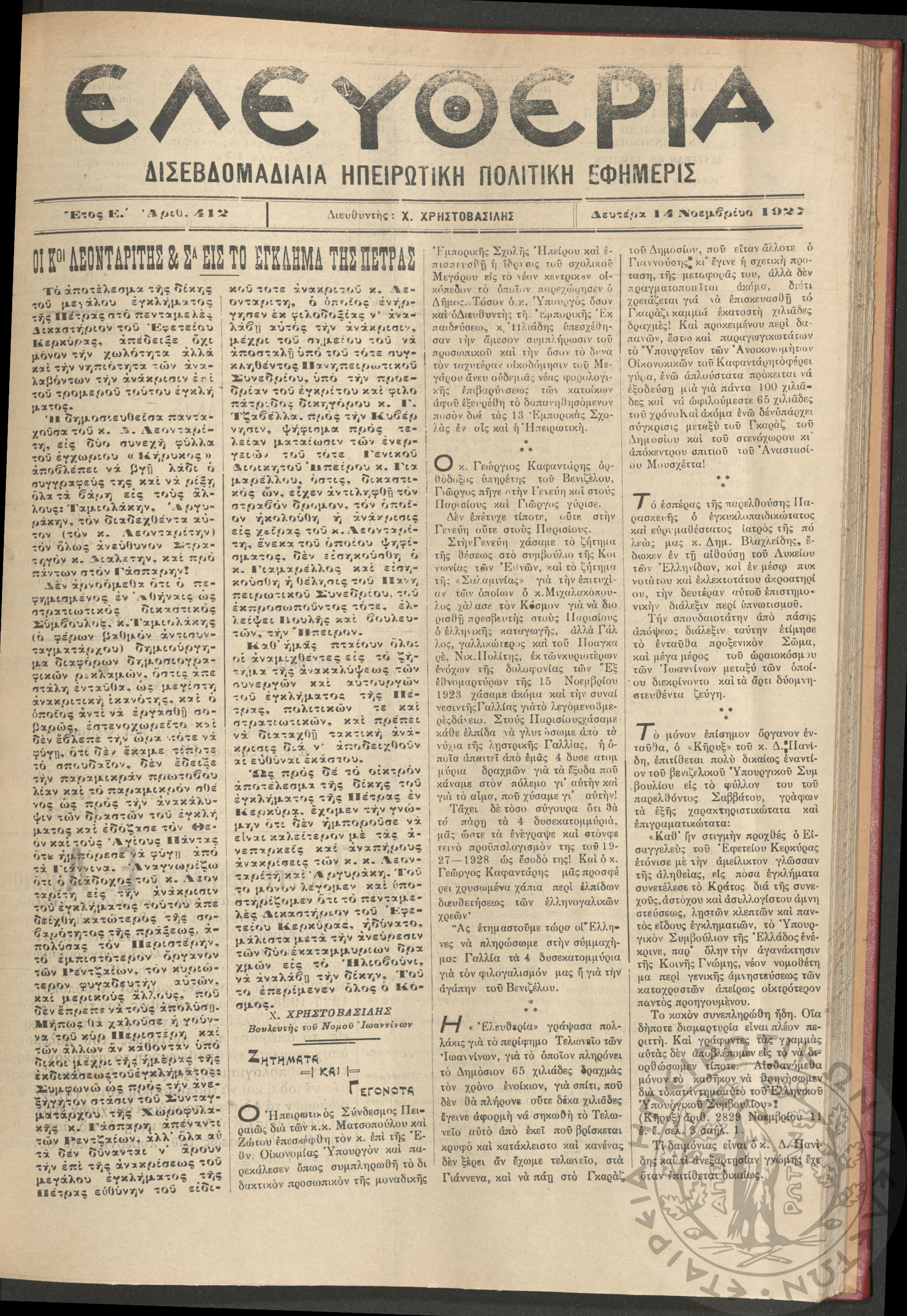 Ελευθερία: δισεβδομαδιαία Ηπειρωτική πολιτική εφημερίς, 1927, φ. 412