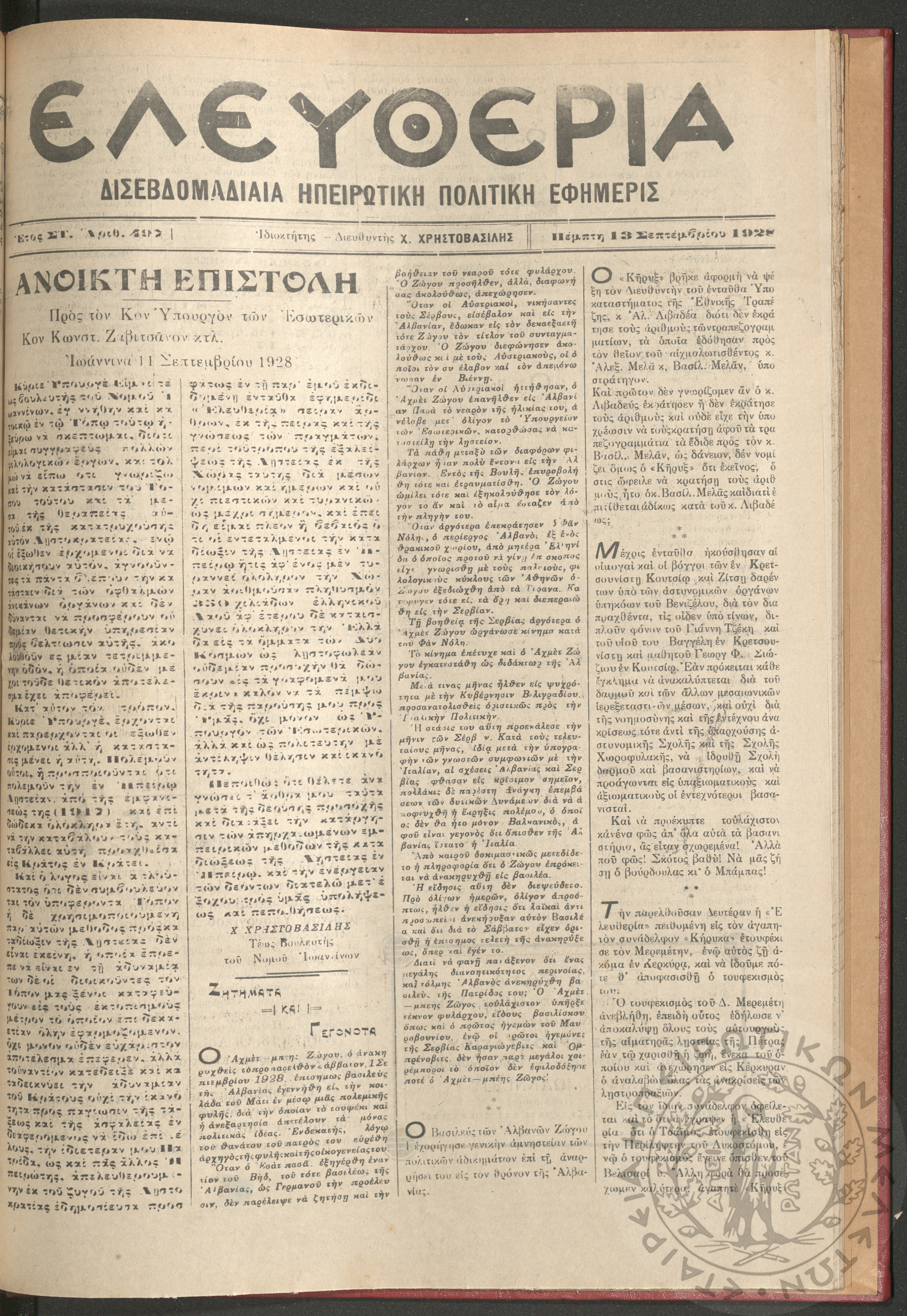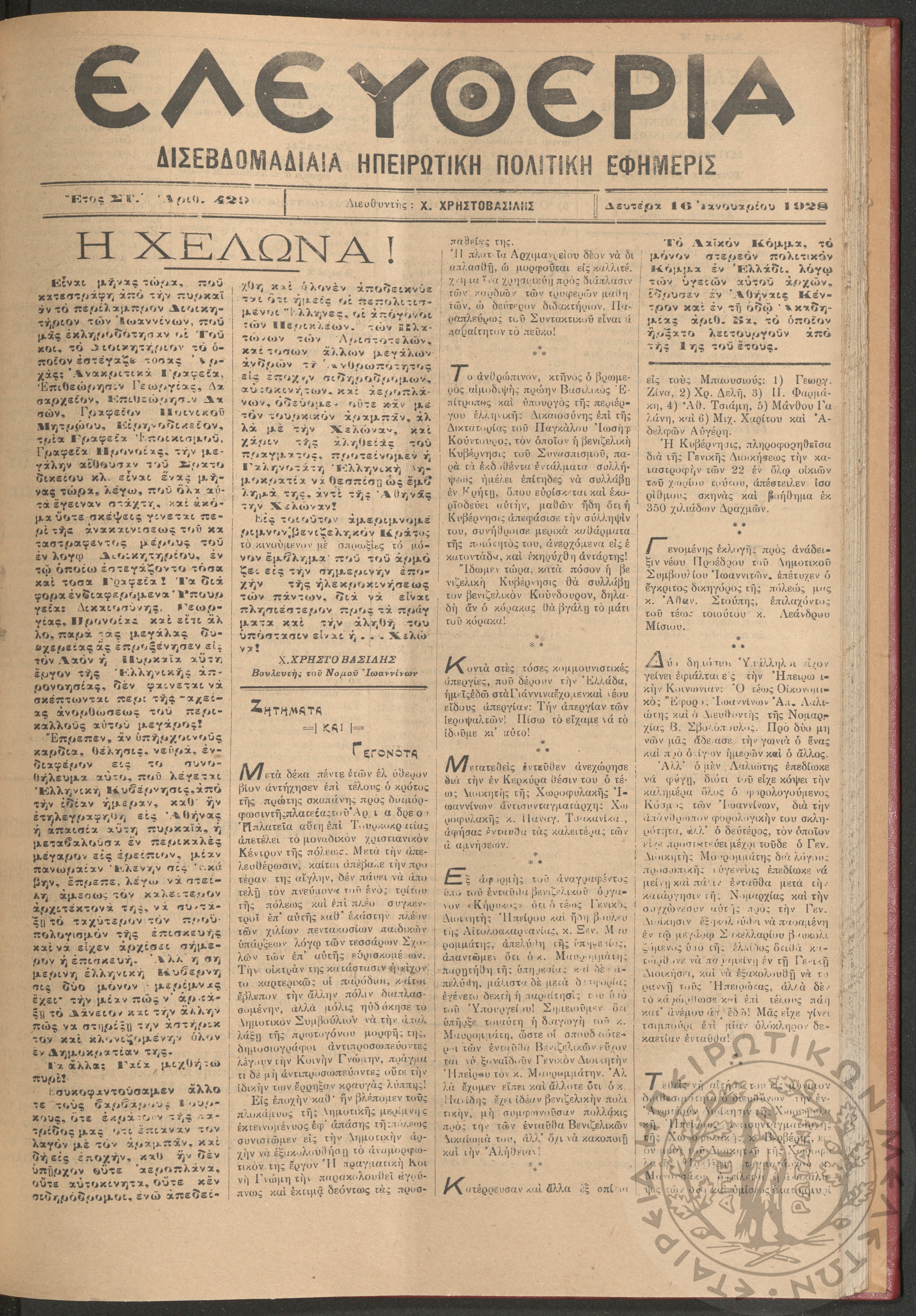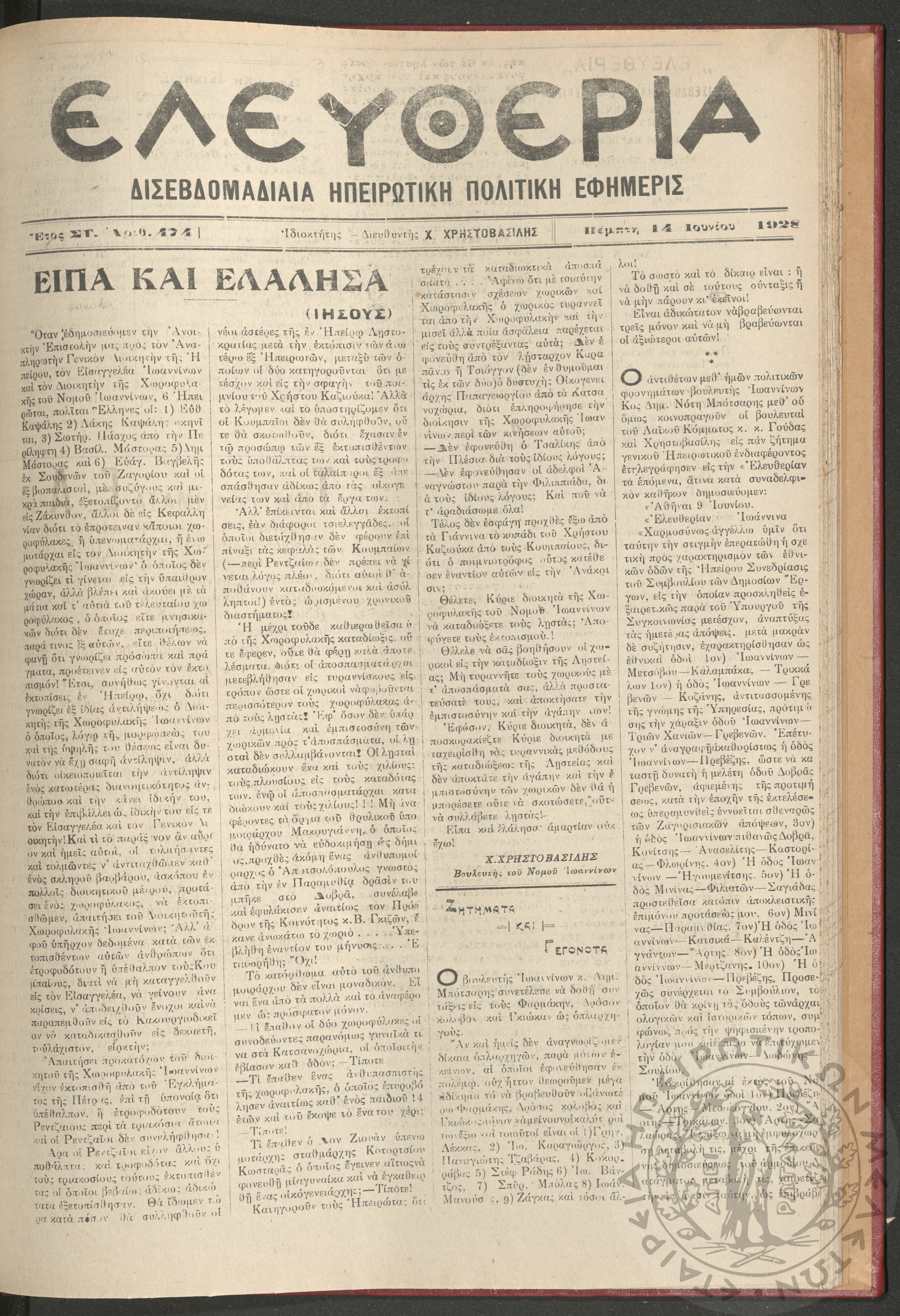 Ελευθερία: δισεβδομαδιαία Ηπειρωτική πολιτική εφημερίς, 1928, φ. 429