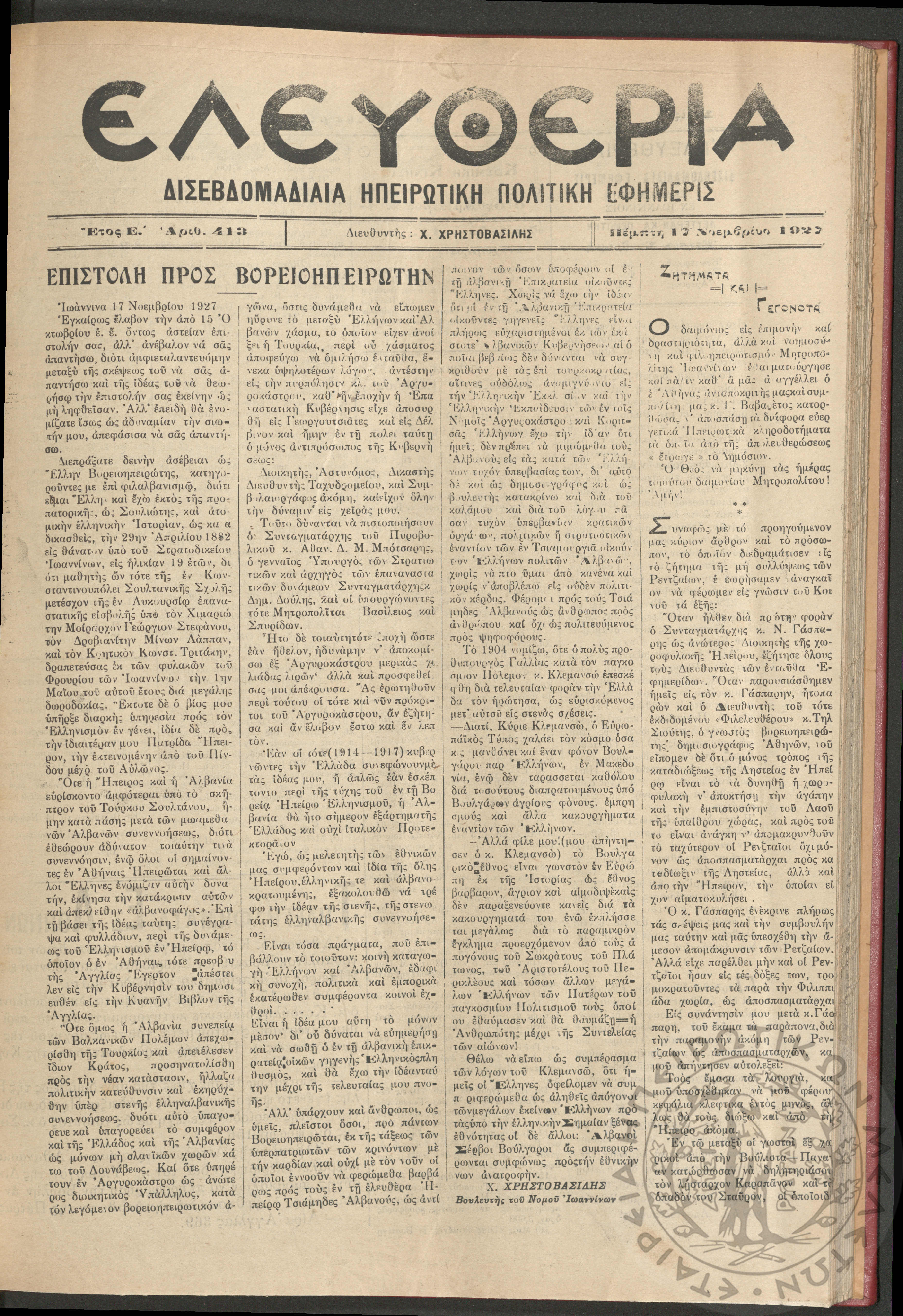 Ελευθερία: δισεβδομαδιαία Ηπειρωτική πολιτική εφημερίς, 1927, φ. 413
