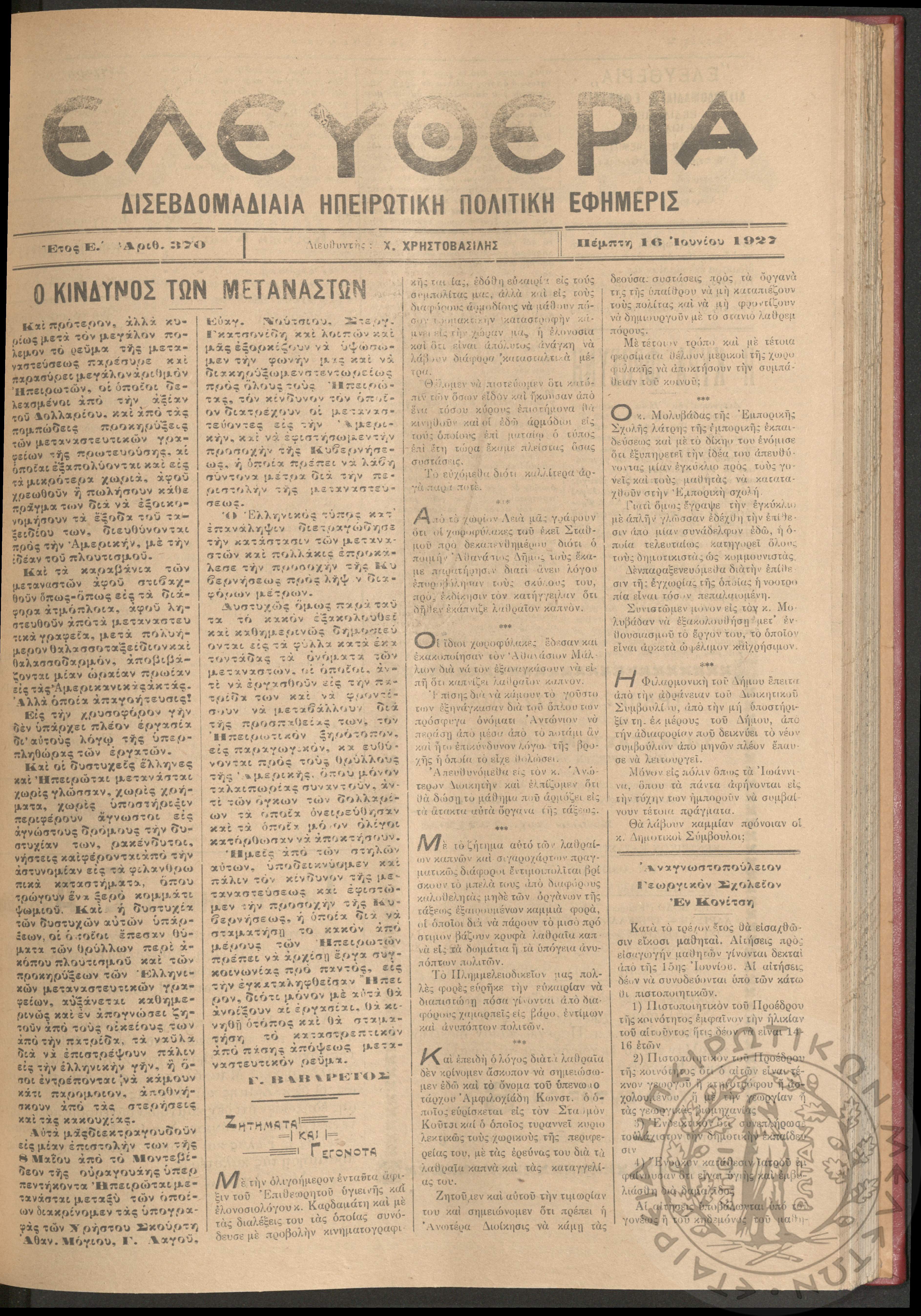 Ελευθερία: δισεβδομαδιαία Ηπειρωτική πολιτική εφημερίς, 1927, φ. 370