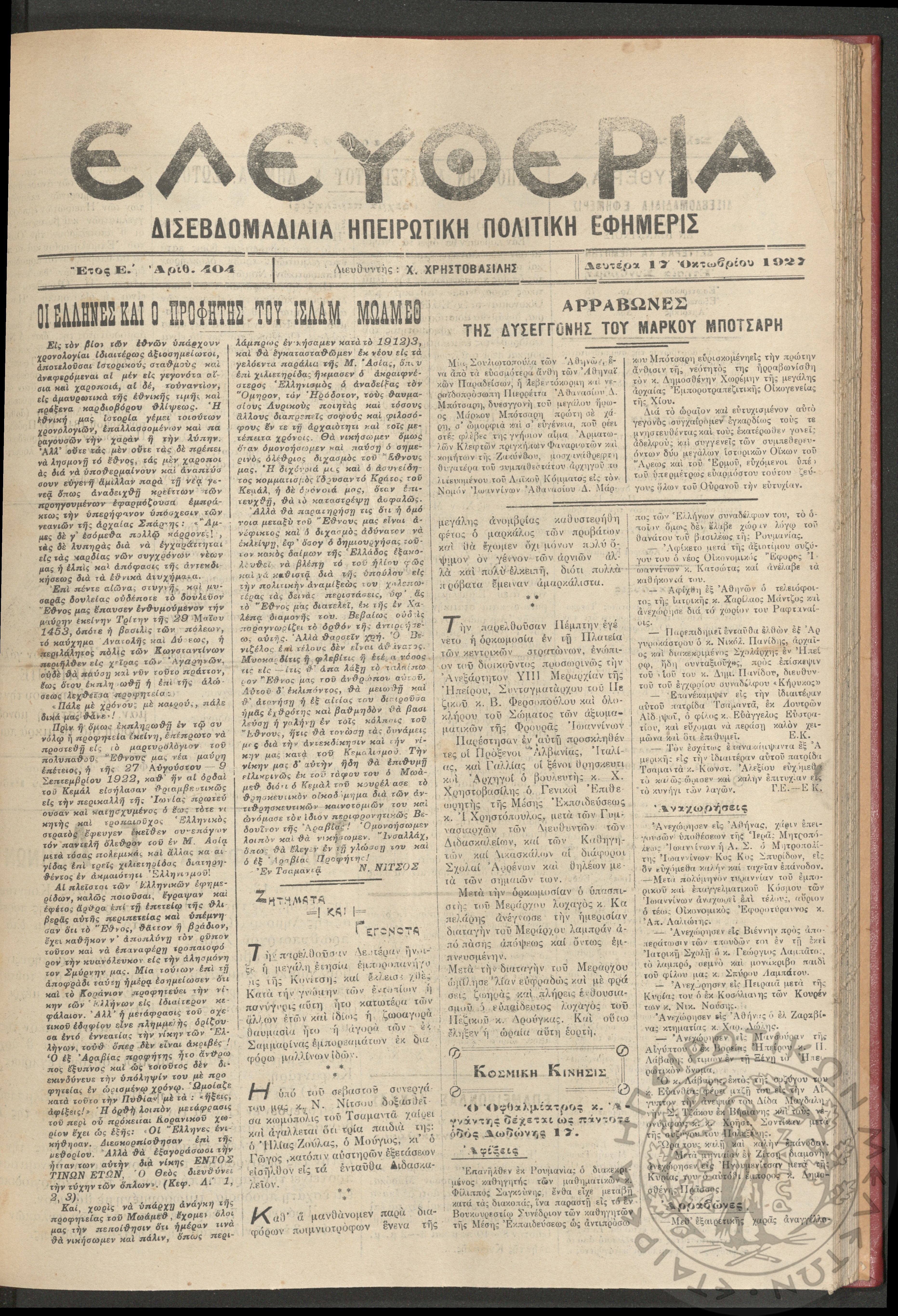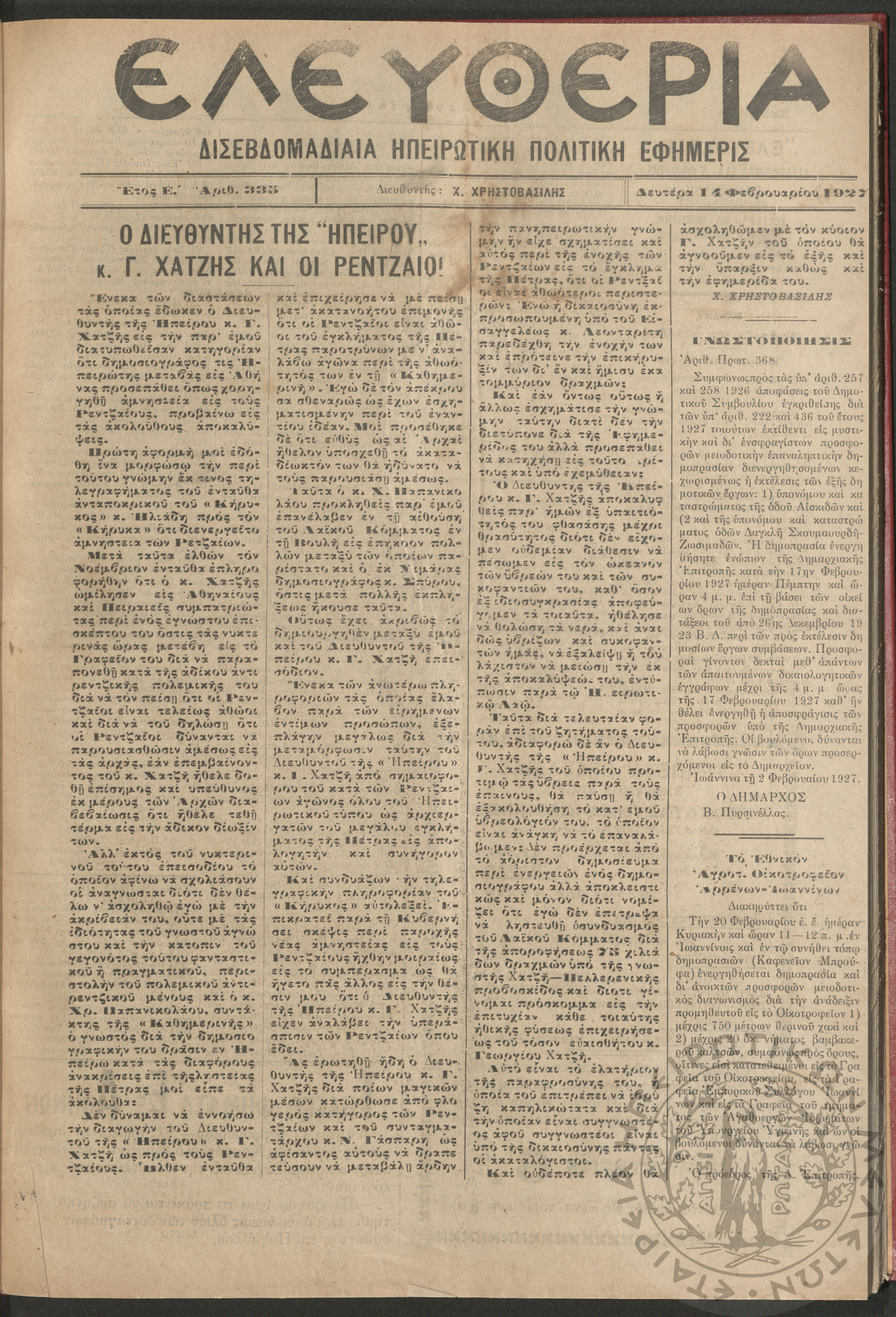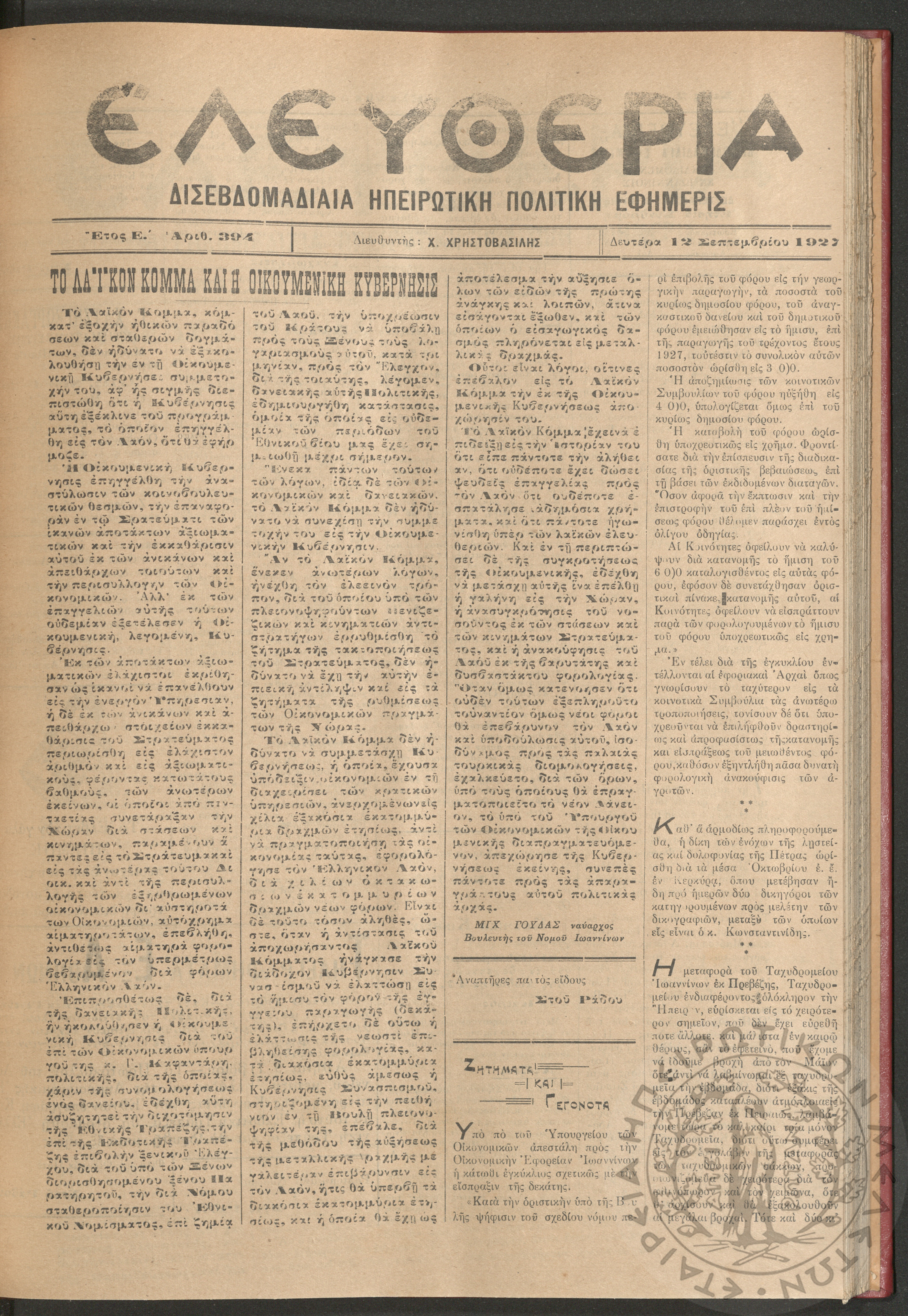 Ελευθερία: δισεβδομαδιαία Ηπειρωτική πολιτική εφημερίς, 1927, φ. 404