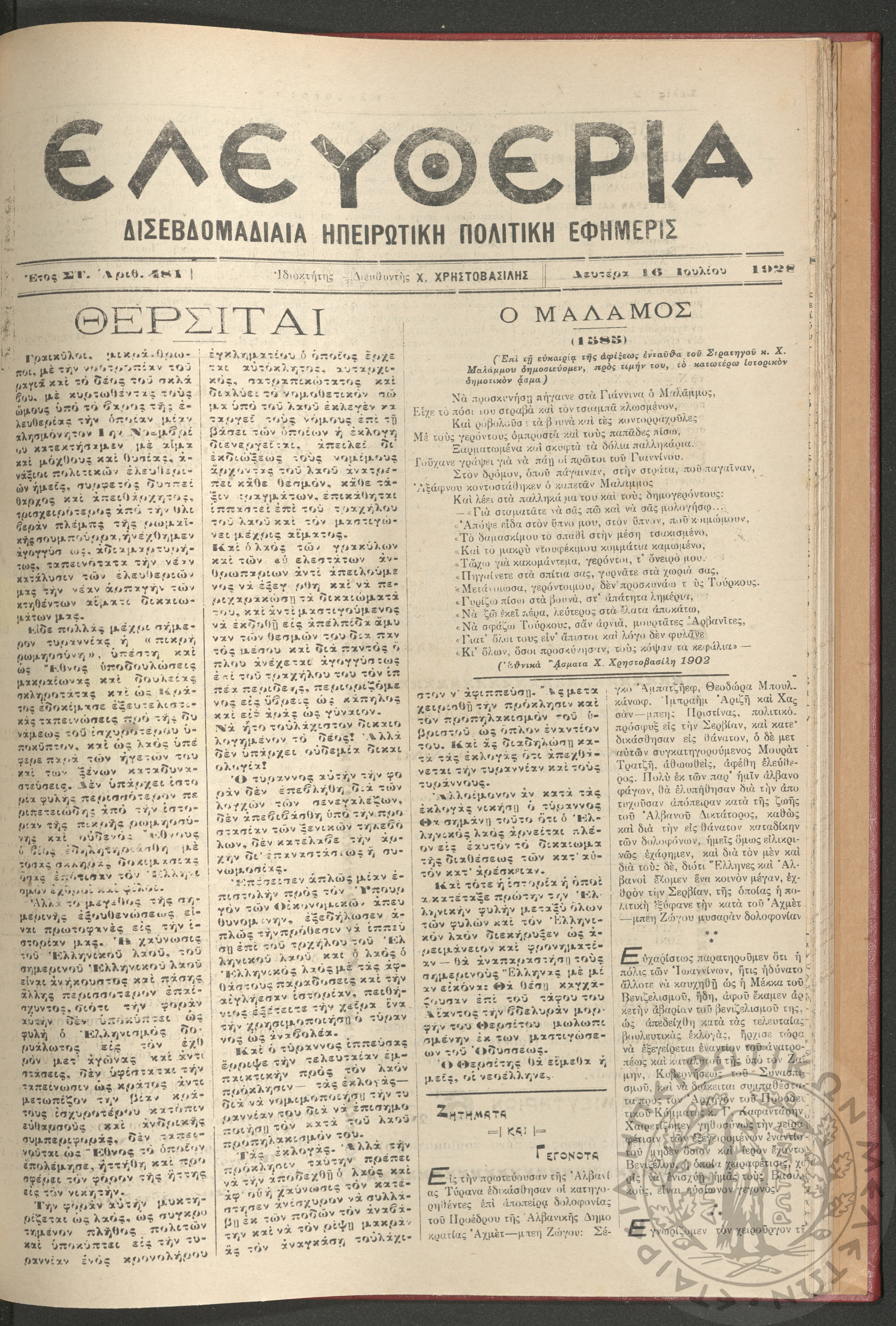 Ελευθερία: δισεβδομαδιαία Ηπειρωτική πολιτική εφημερίς, 1928, φ. 481