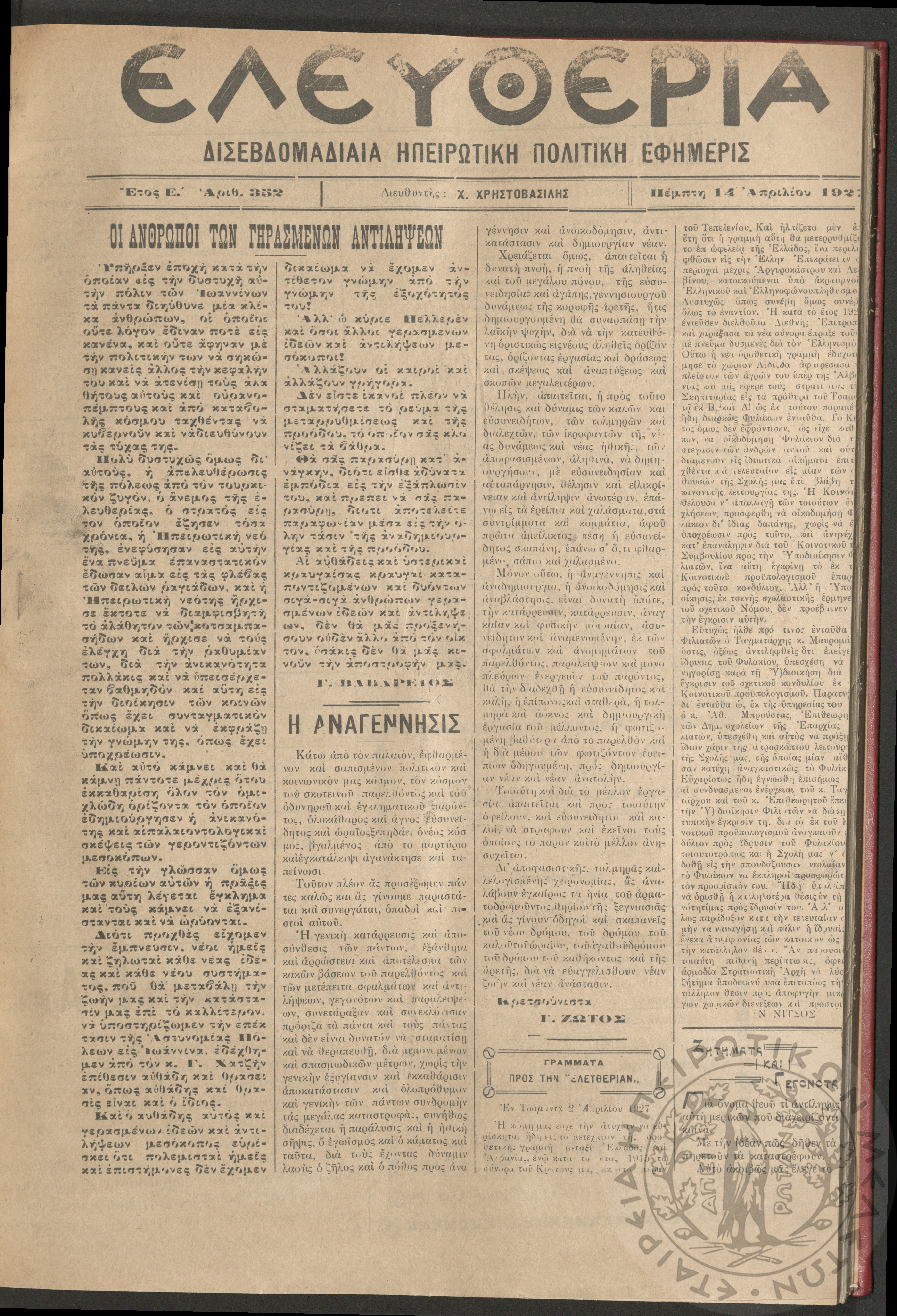 Ελευθερία: δισεβδομαδιαία Ηπειρωτική πολιτική εφημερίς, 1927, φ. 352