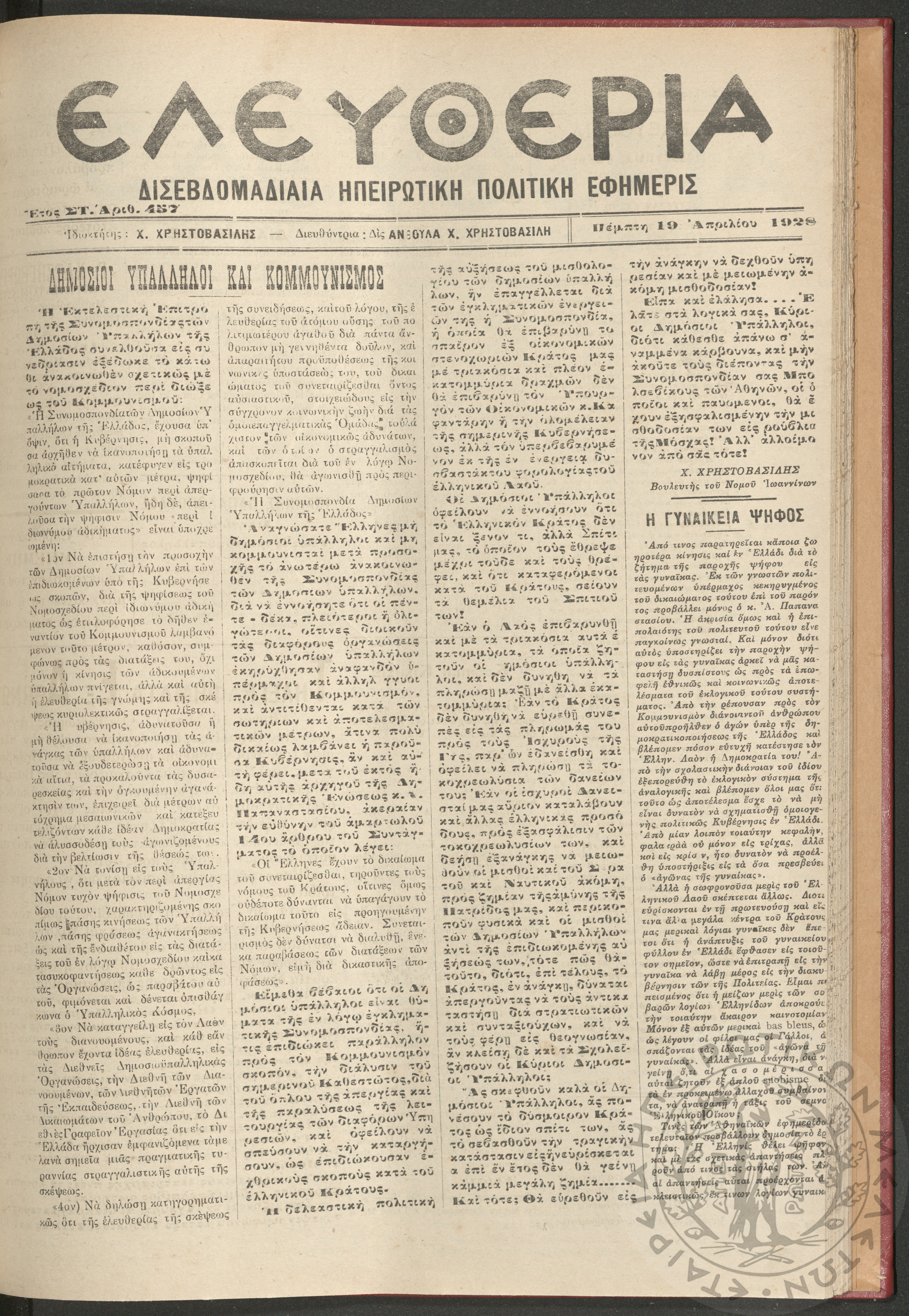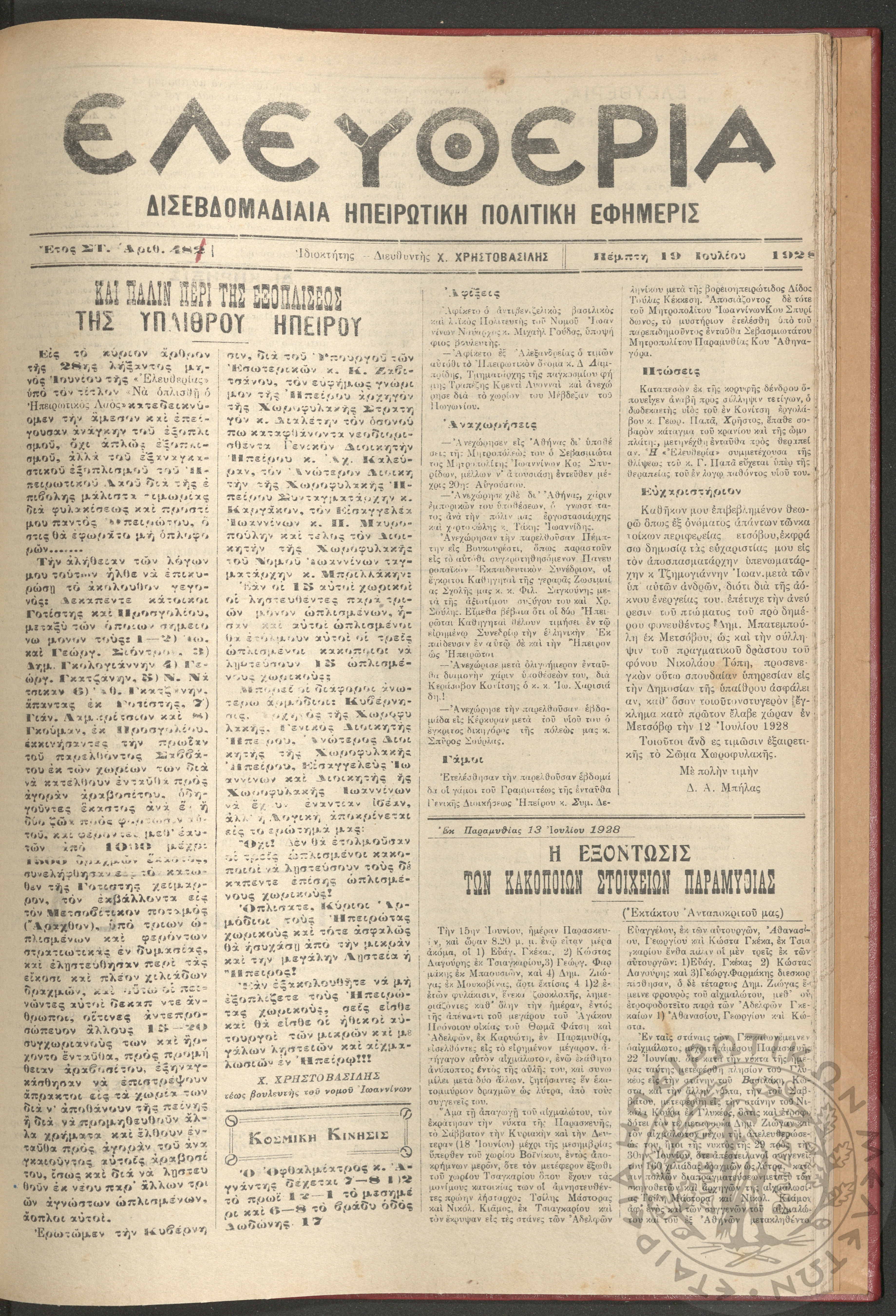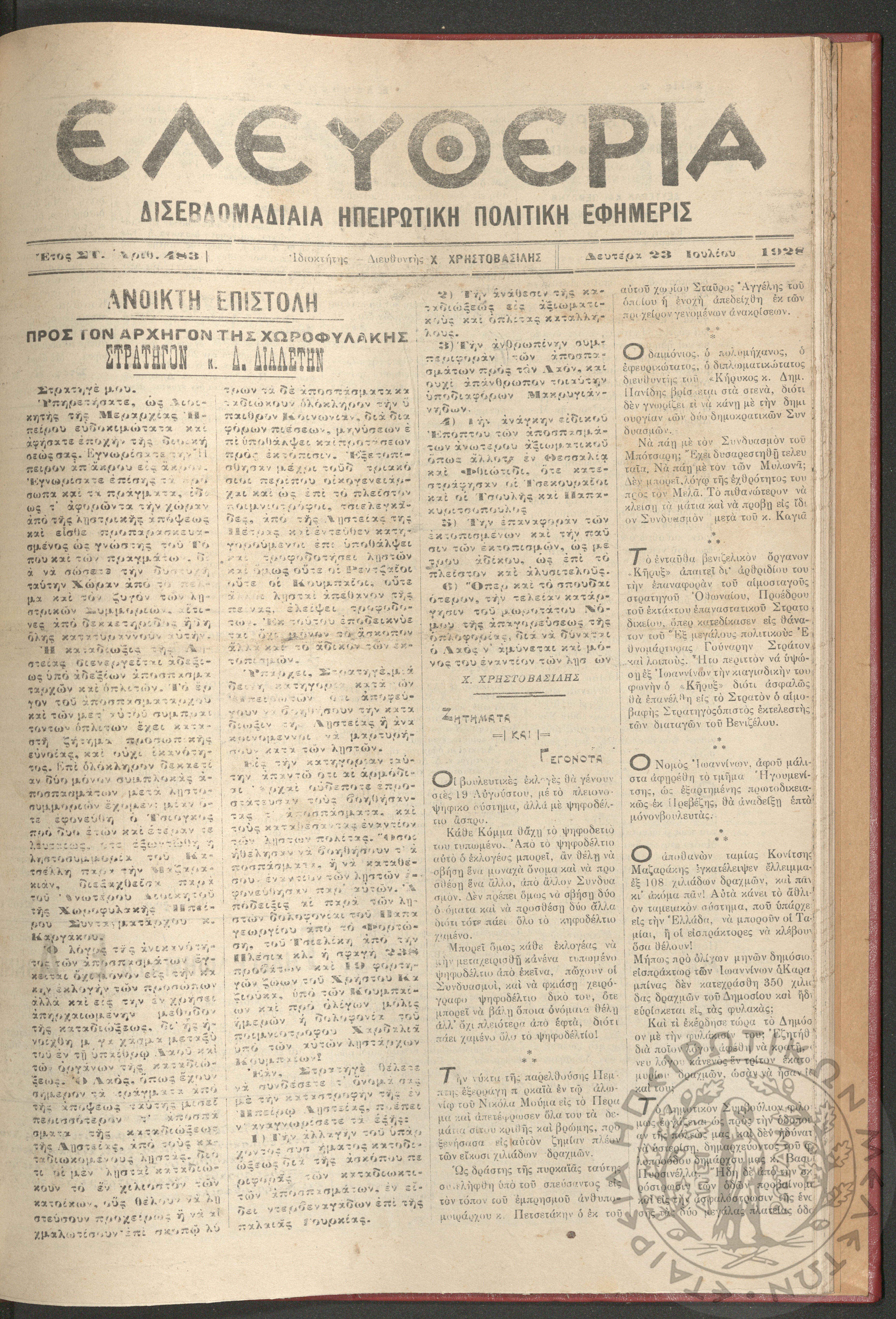 Ελευθερία: δισεβδομαδιαία Ηπειρωτική πολιτική εφημερίς, 1928, φ. 483