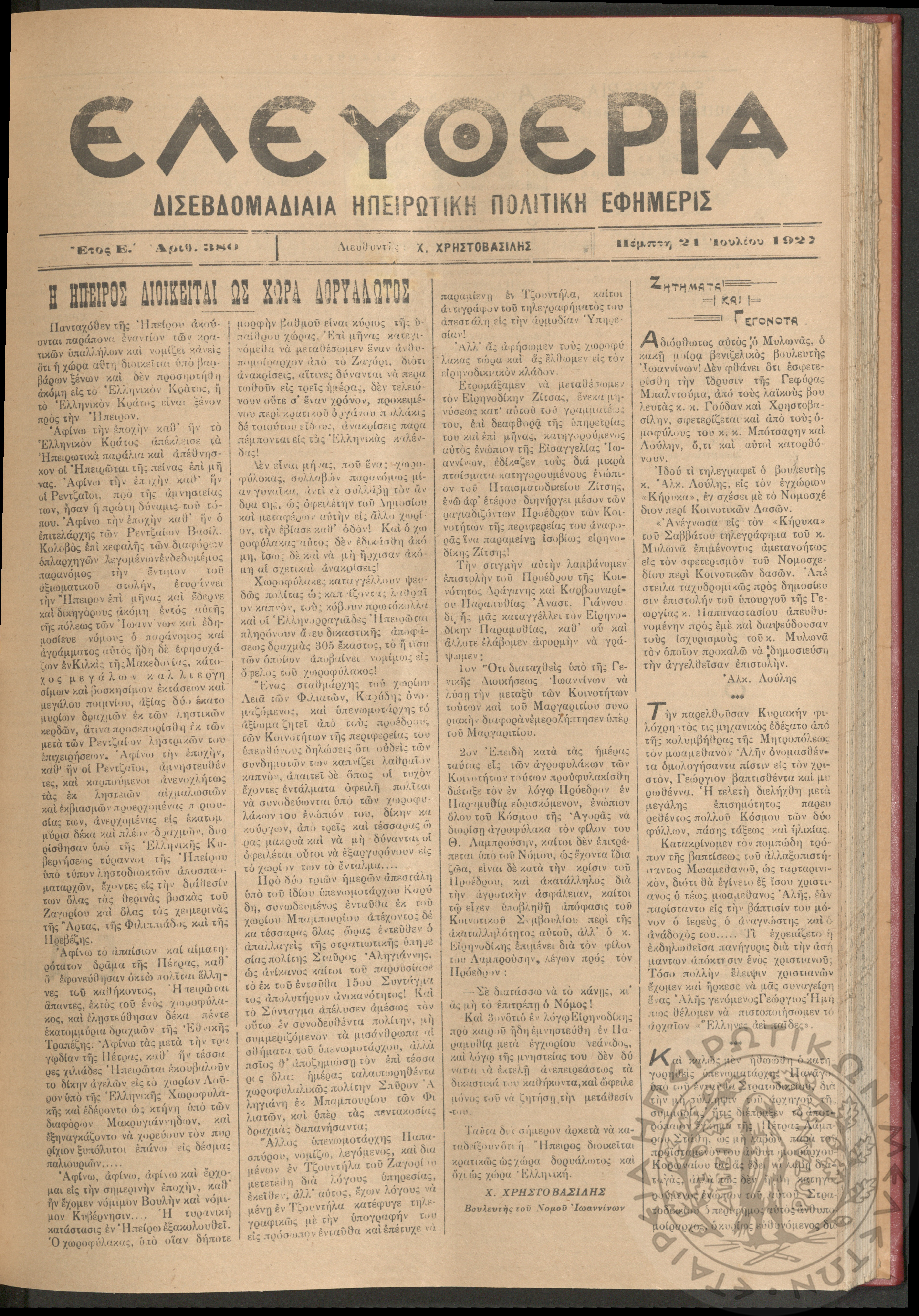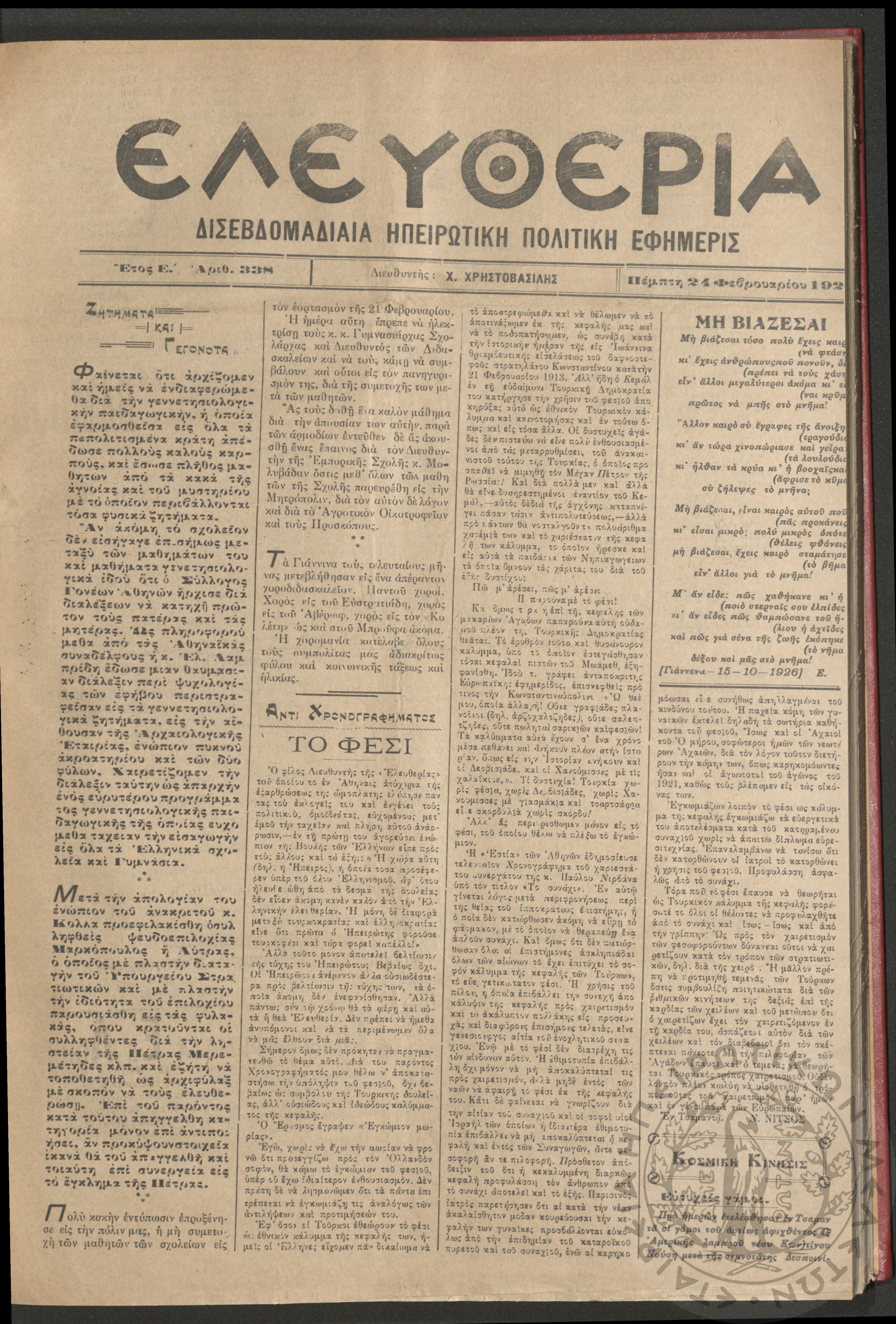 Ελευθερία: δισεβδομαδιαία Ηπειρωτική πολιτική εφημερίς, 1927, φ. 338